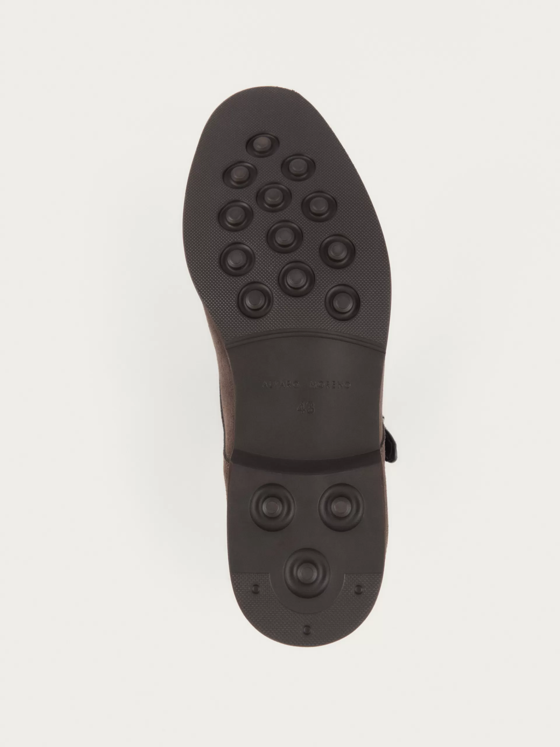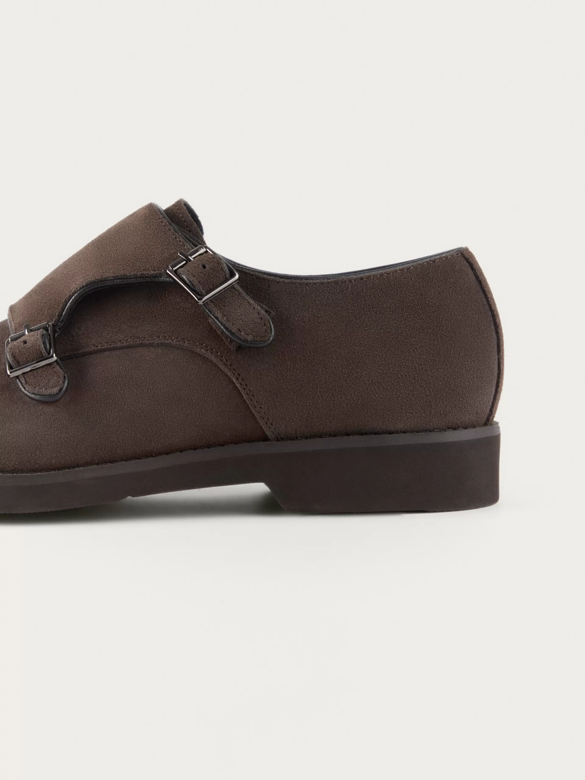 Blucher confeccionado en serraje con cierre mediante doble hebilla, ligera elevación en la suela y pespuntes al tono. S…
