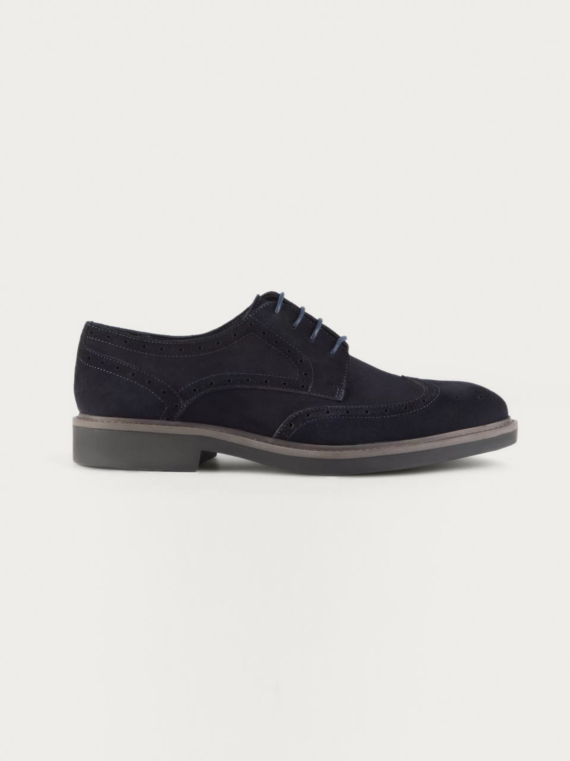 Zapatos confeccionados en serraje con detalles picados. Cuenta con cordones de hasta cuatro pasados, suela de goma antideslizante y punta redondeada.