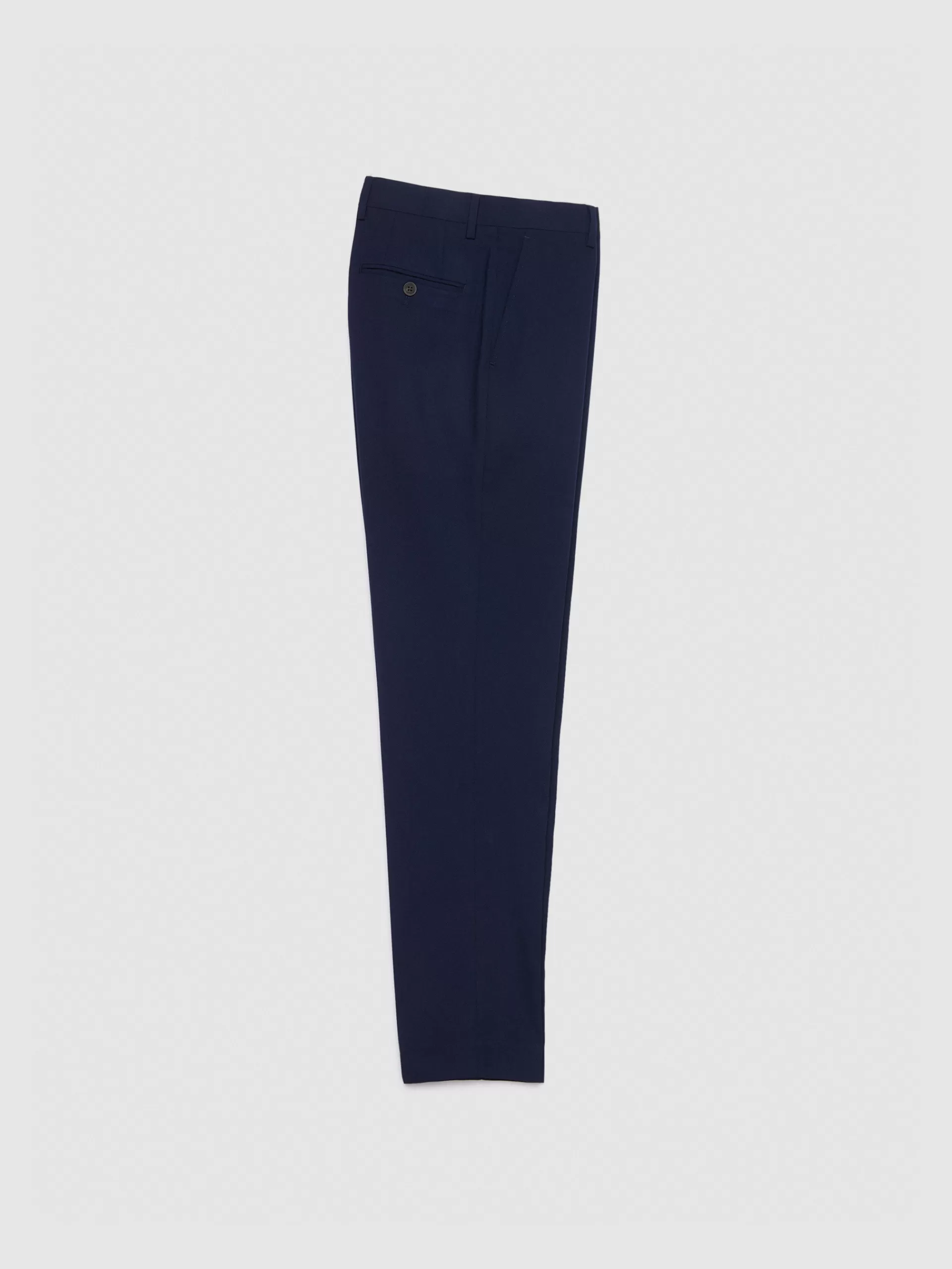Pantalón de traje en tejido de ojo de perdiz que cuenta con cierre frontal de cremallera y botones, dos bolsillos abiertos en la parte delantera y dos bolsillos traseros con cierre mediante botón. Forrado en su interior.