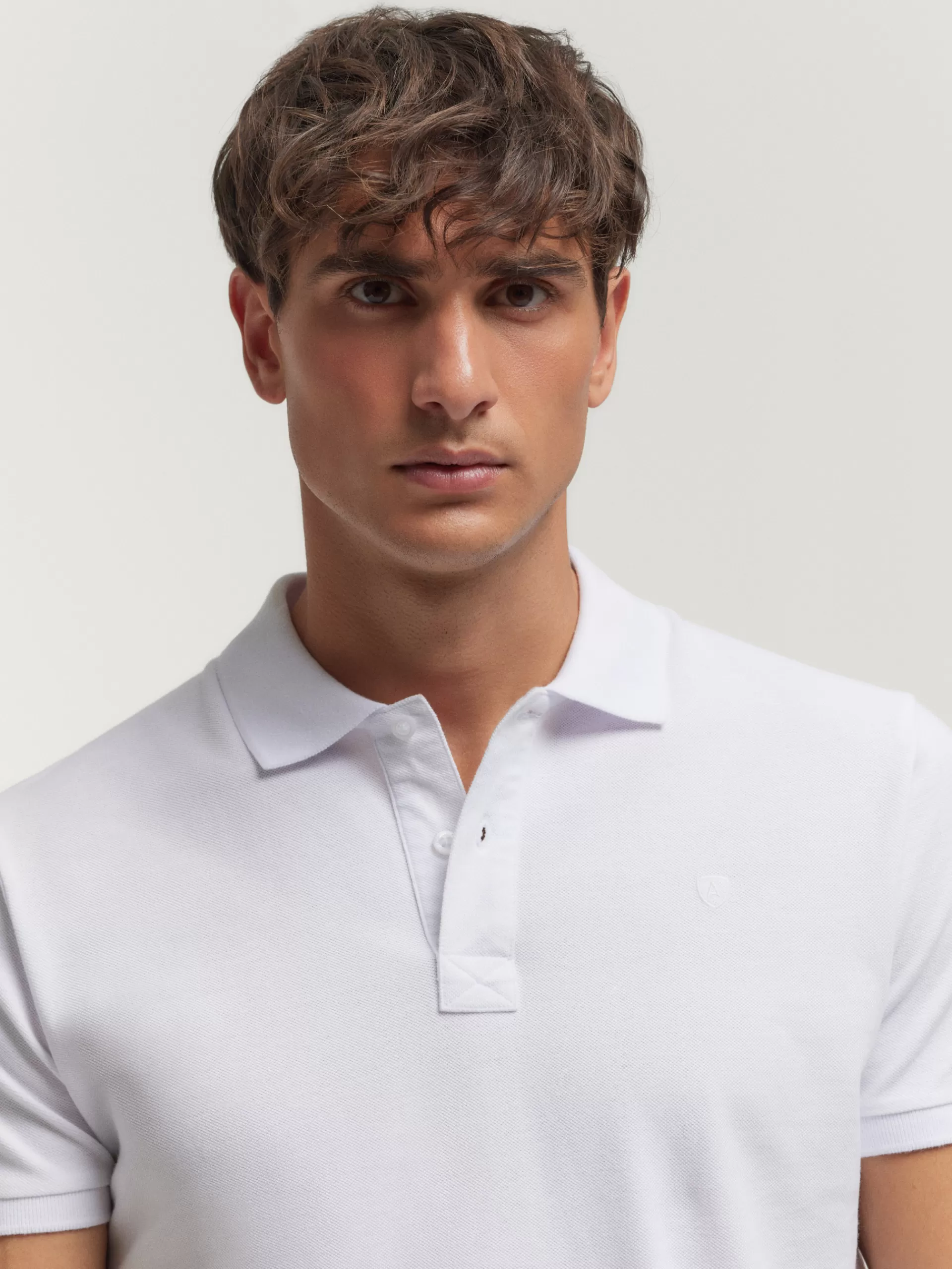 Polo de manga corta confeccionado en algodón. Cuello clásico de cierre mediante tapeta de dos botones, logo grabado en el frontal al tono, aperturas en el bajo y corte regular fit.