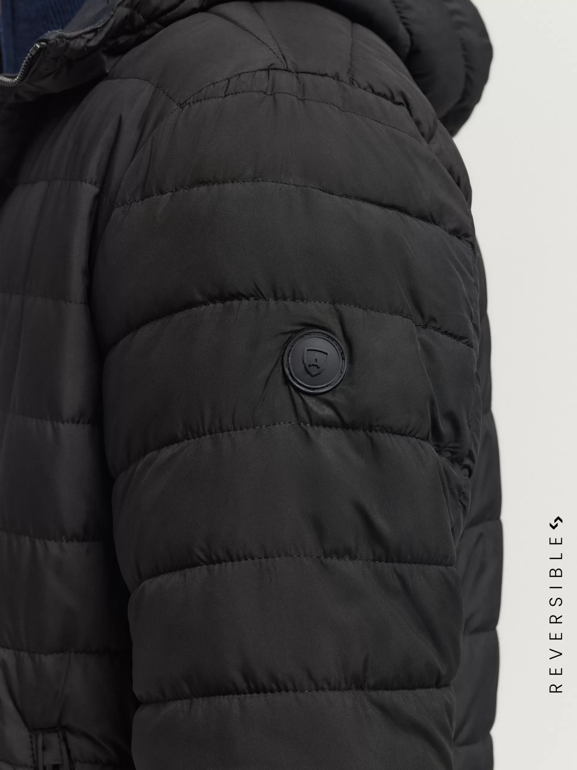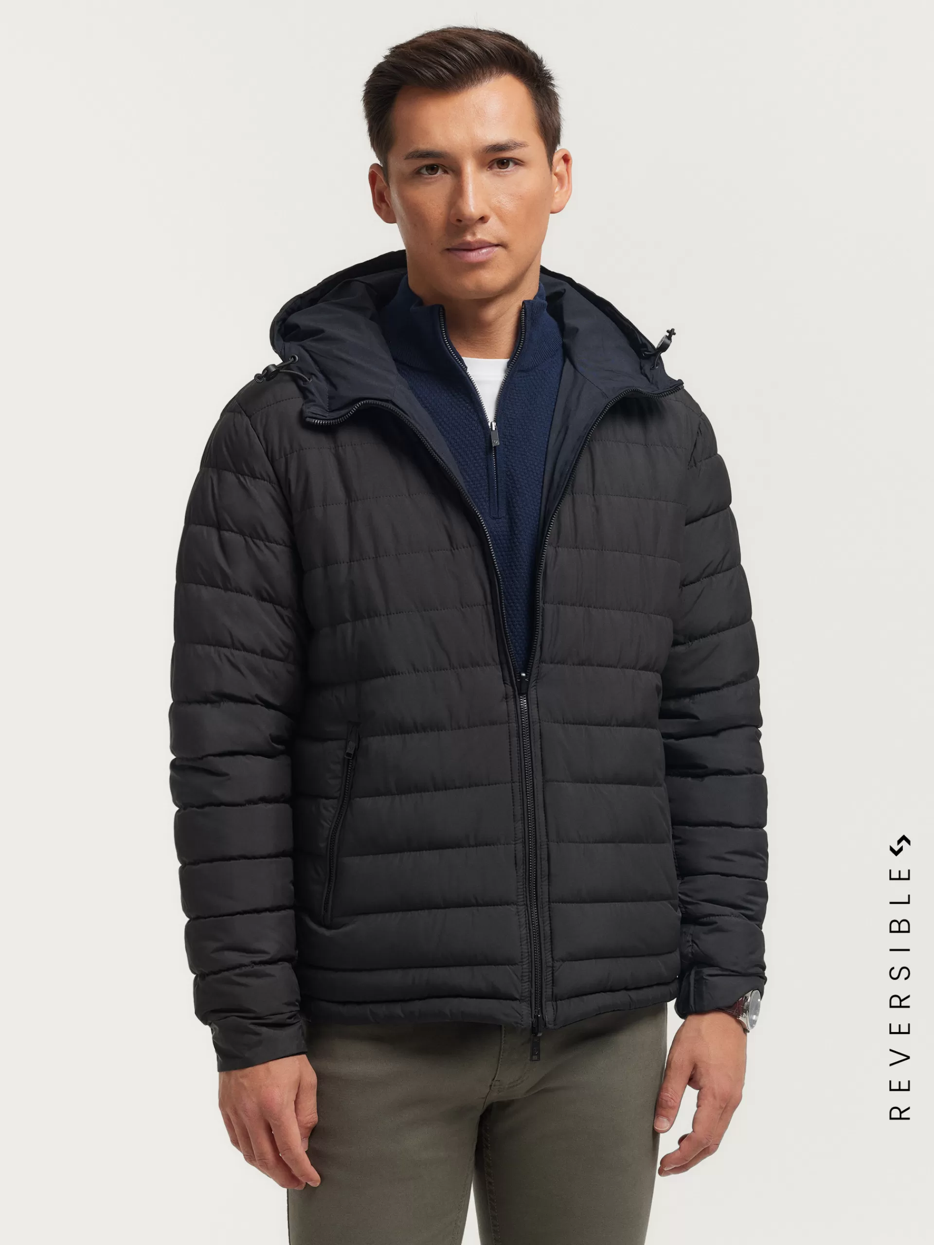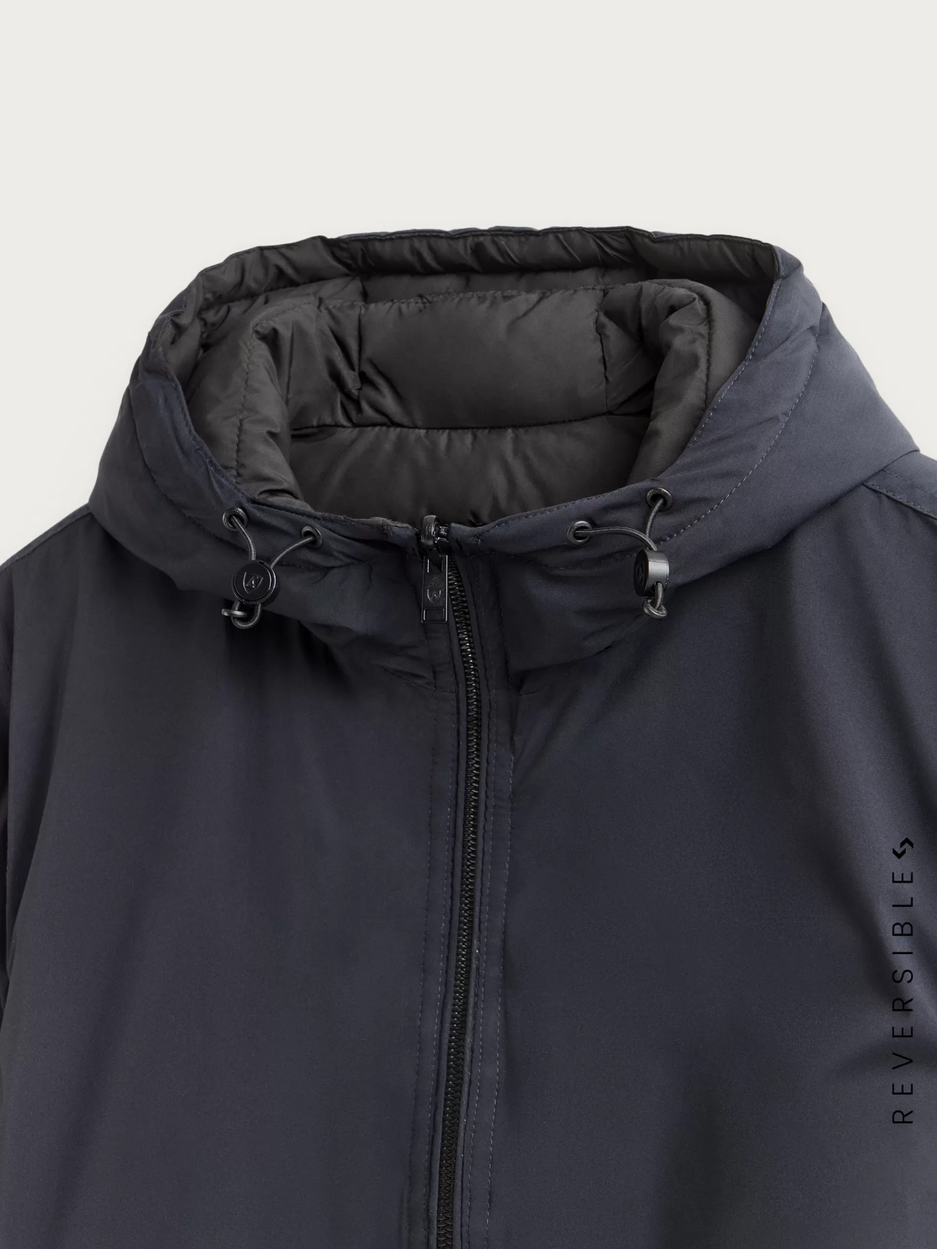 Cazadora reversible acolchada con gorro ajustable. Cierre central mediante cremallera, dos bolsillos en el frontal de ambos lados y manga larga con puños ajustables. Detalle personalizado en una de las mangas.