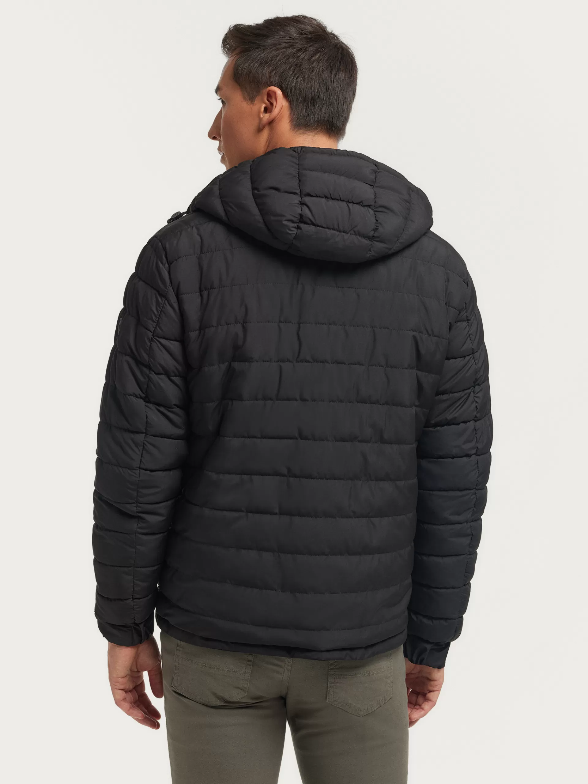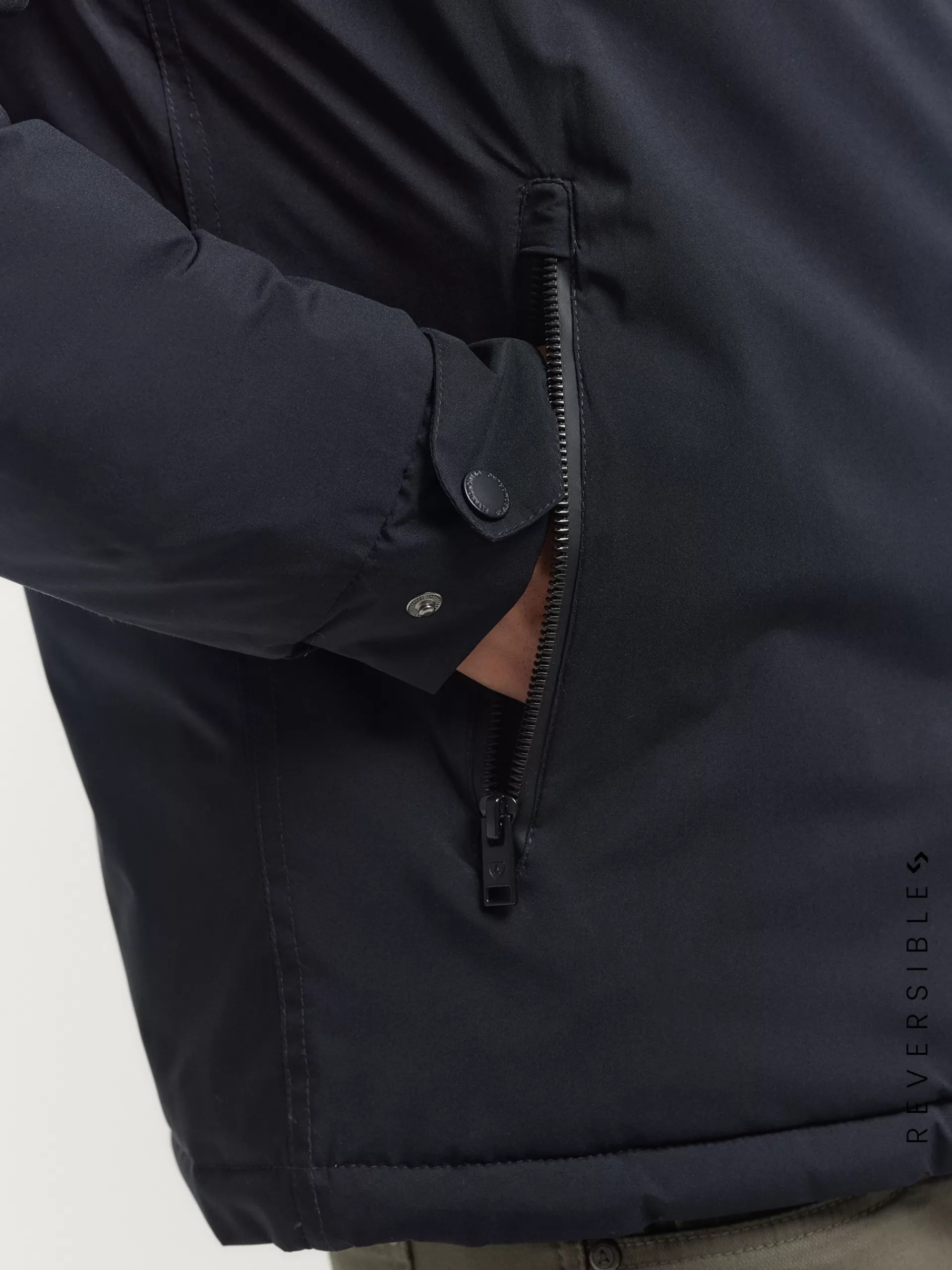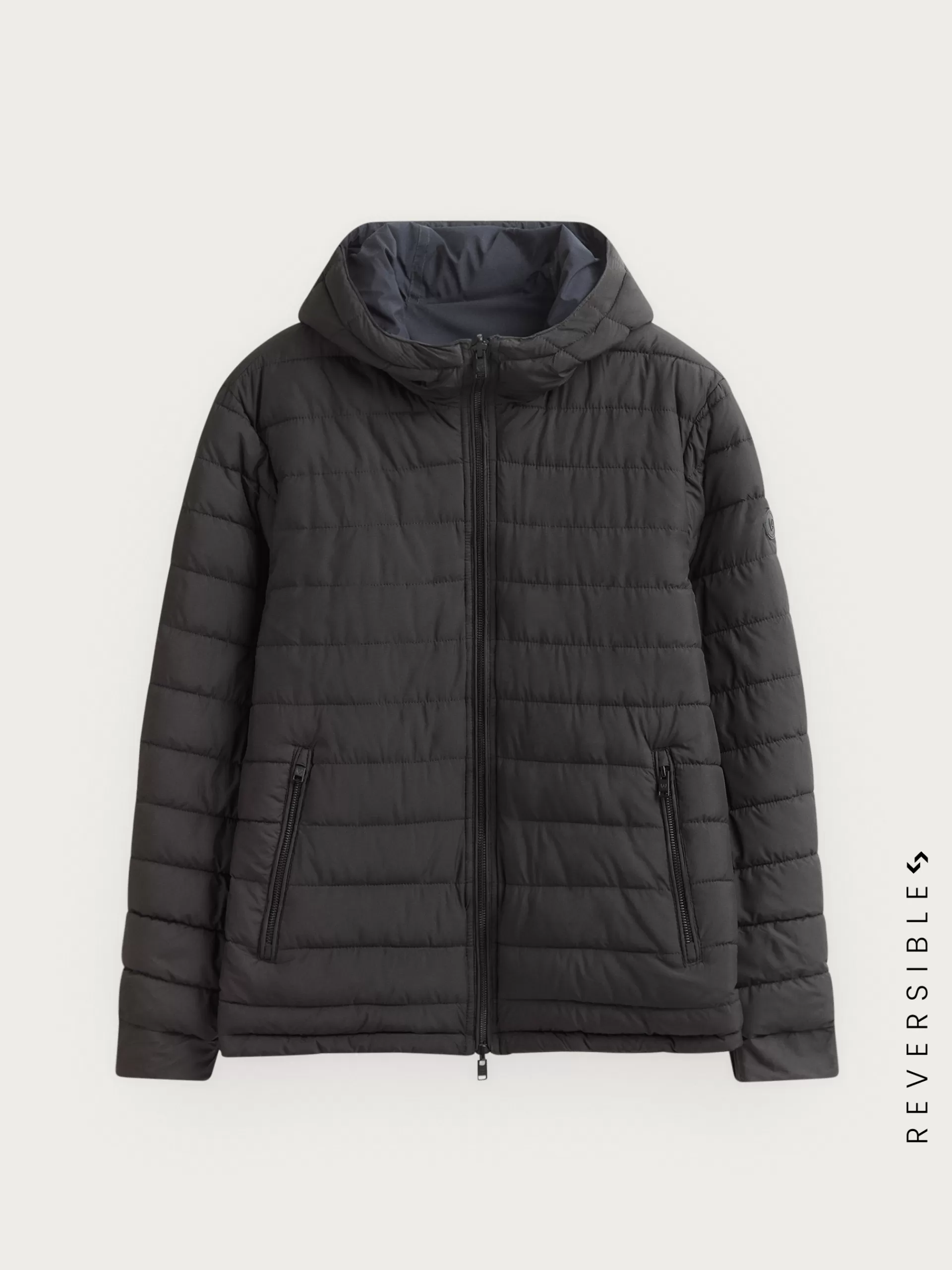 Cazadora reversible acolchada con gorro ajustable. Cierre central mediante cremallera, dos bolsillos en el frontal de ambos lados y manga larga con puños ajustables. Detalle personalizado en una de las mangas.