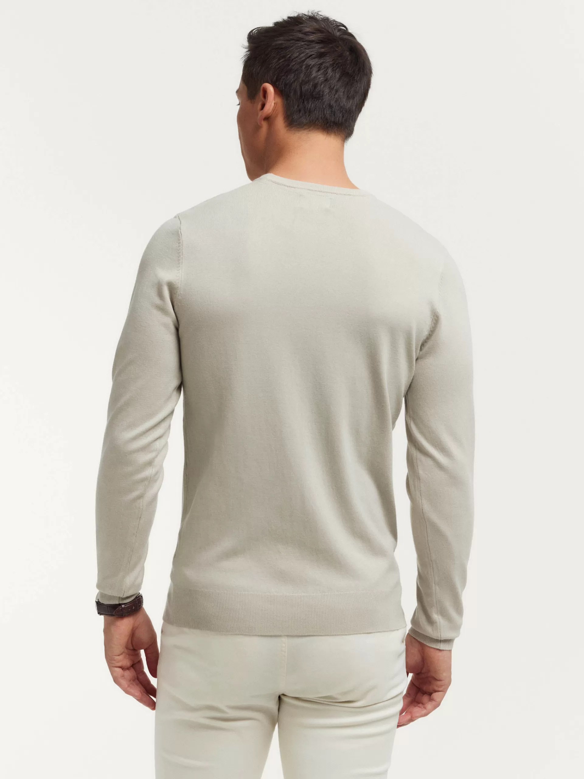 Jersey liso de fina estructura confeccionado en algodón. Cuenta con cuello redondo, manga larga y detalle grabado en el frontal. Cuello, bajo y puños en acabado ribeteado. Corte regular fit.