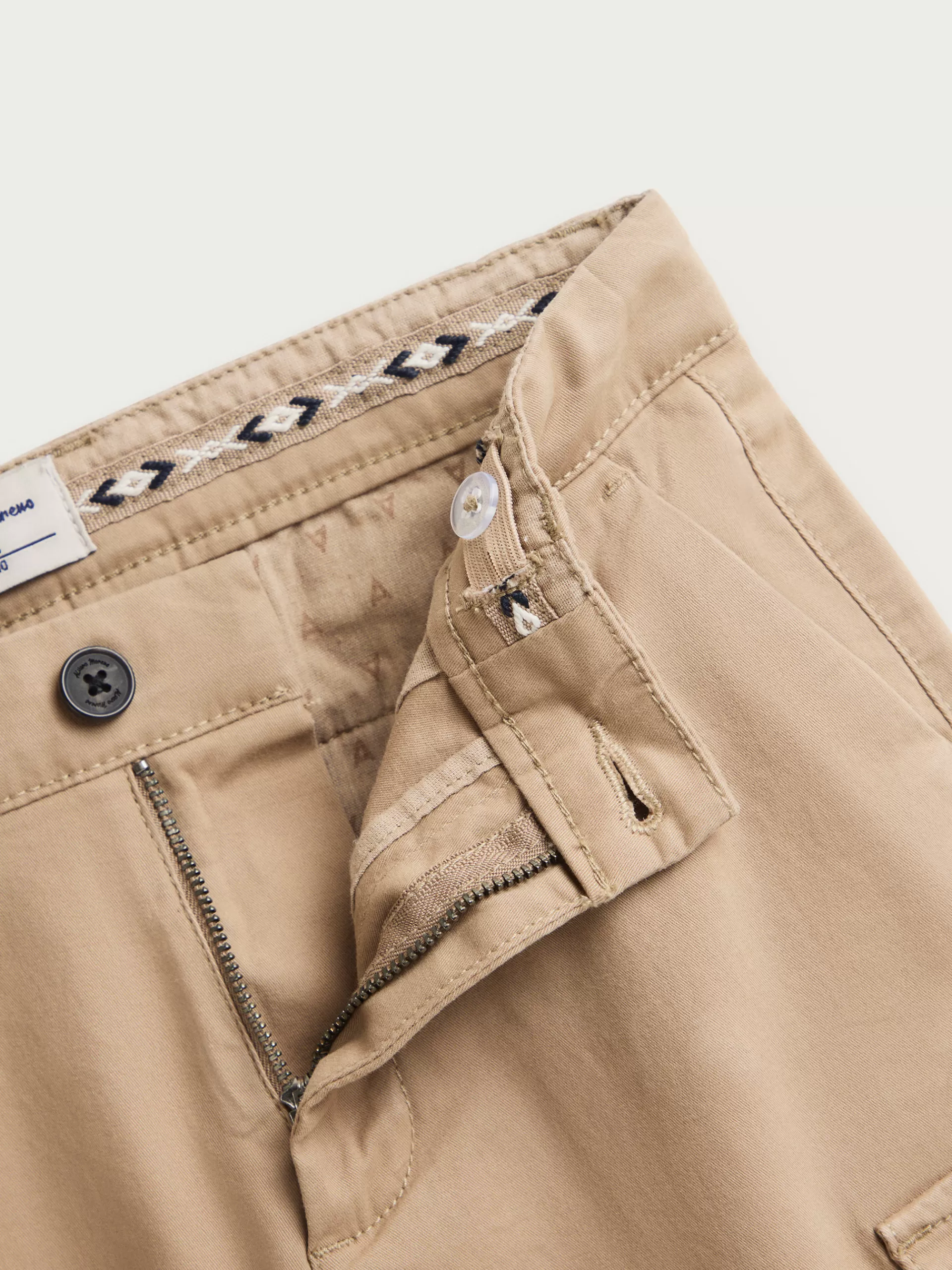 Pantalón cargo con cierre central mediante botón y cremallera. Dos bolsillos laterales y dos más bajos con cierre med…
