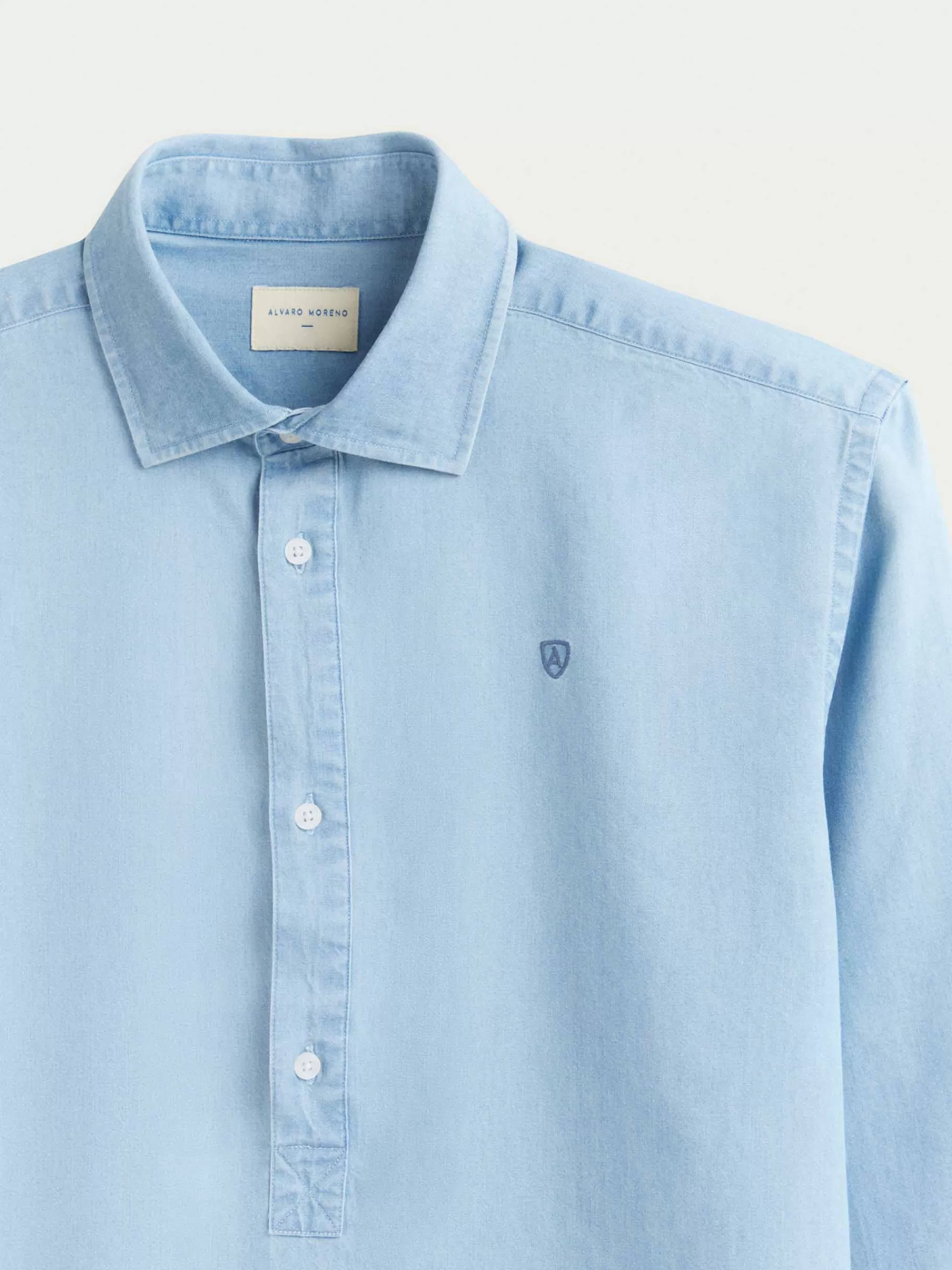 Camisa estilo polera de aspecto denim. Cuenta con cuello de solapa, cierre central hasta la mitad de la camisa de cuatro botones, manga larga con puños simples y logo de la marca grabado en el frontal. Corte regular fit.