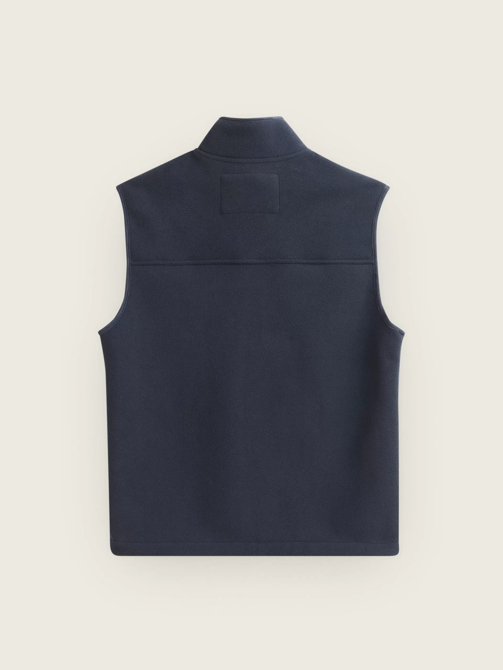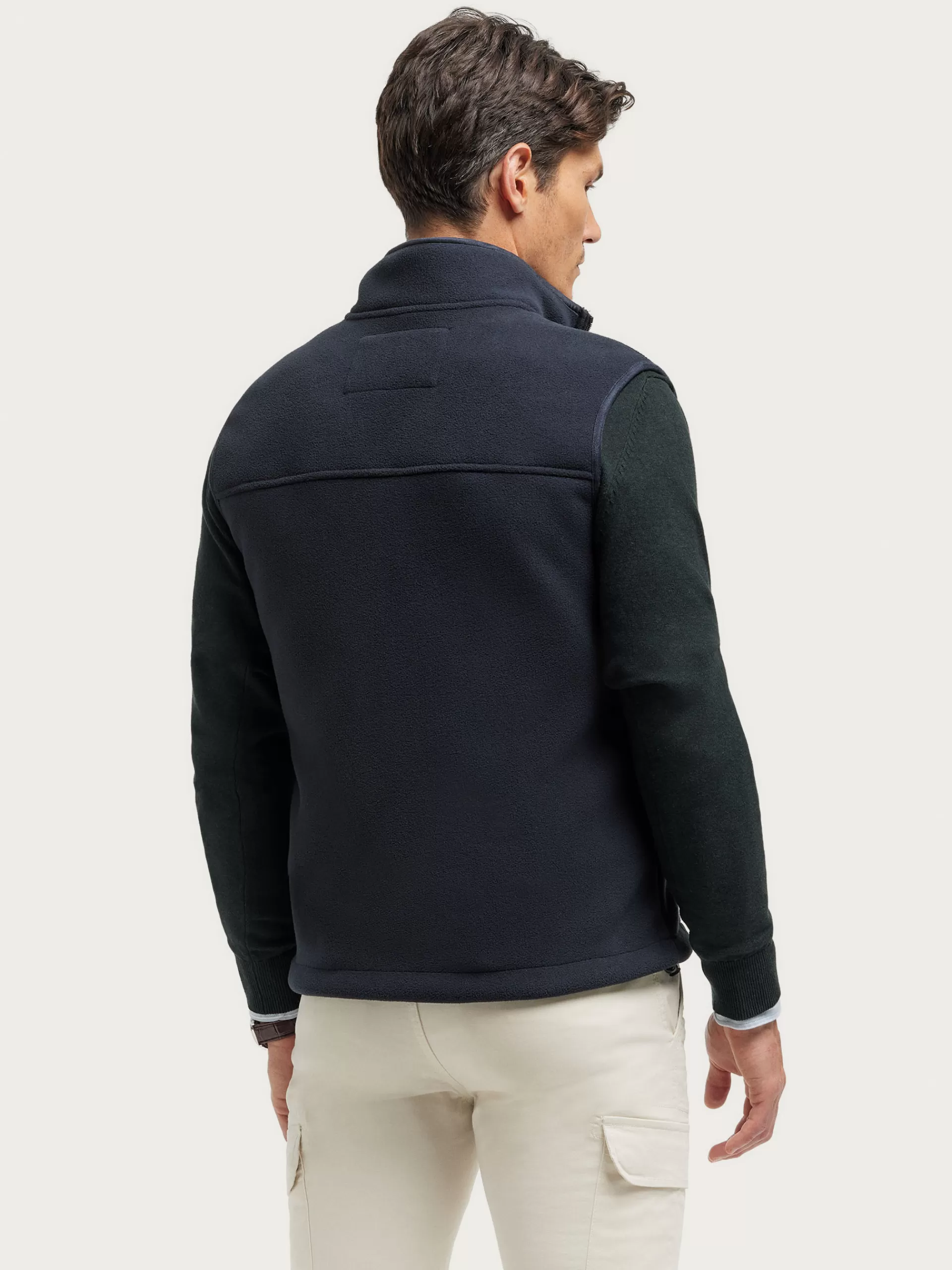 Chaleco confeccionado en tejido avivado en antelina en su exterior y forrado en su interior en borreguillo. Cuenta con cierre central mediante cremallera personalizada, dos bolsillos en su exterior y logo grabado en su frontal. Corte regular fit.