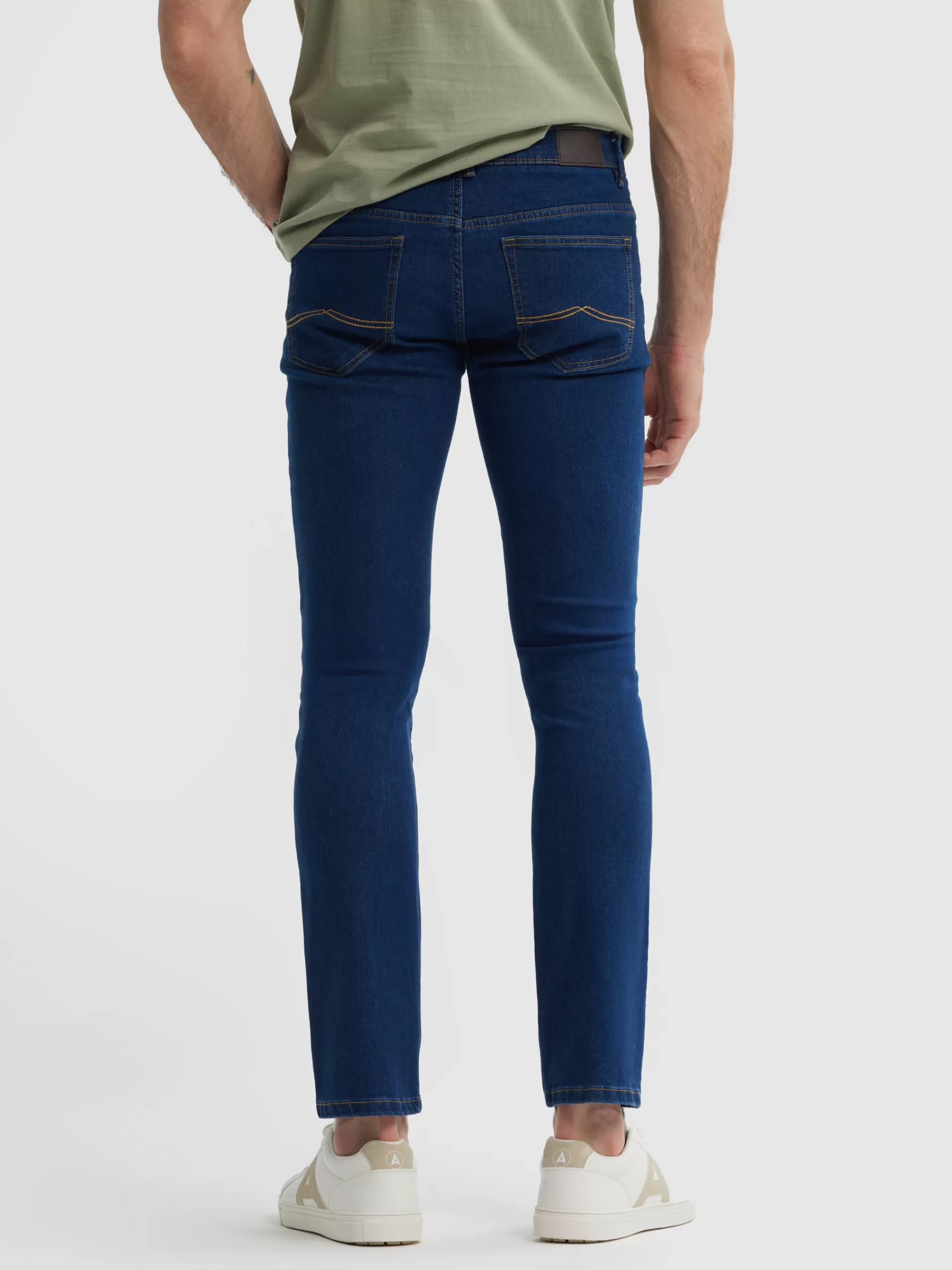Pantalón denim de corte slim fit con cinco bolsillos y cierre central mediante botón y cremallera, pespuntes en color …