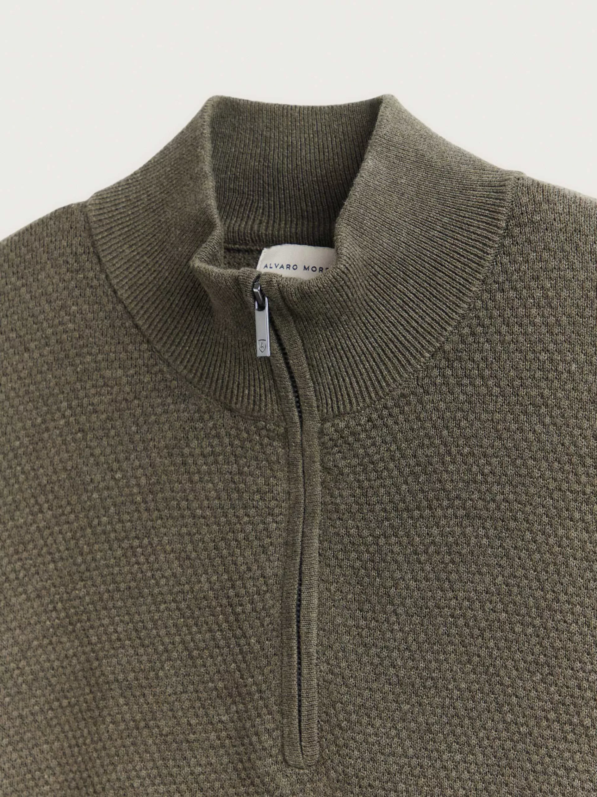 Jersey confeccionado en algodón con estructura en su tejido. Cuenta con cuello alto con medio cierre de cremallera y cuello, puños y bajo en acabado elástico. Corte regular fit.
