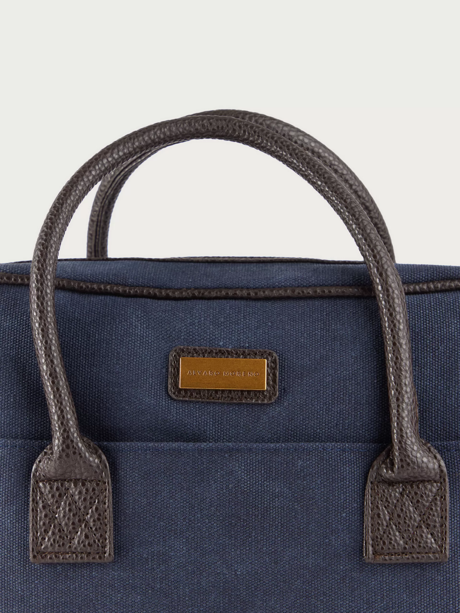 Maletín con asas superiores y correa desmontable por mosquetones. Cuenta con un amplio compartimento principal de cierre mediante cremallera, bolsillo interior y dos bolsillos exteriores. Detalles personalizados en efecto piel. Forrado en su interior.
