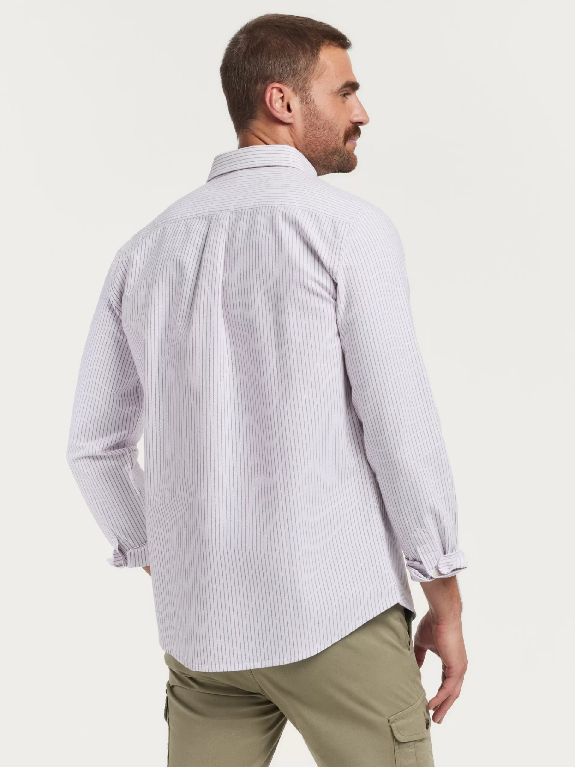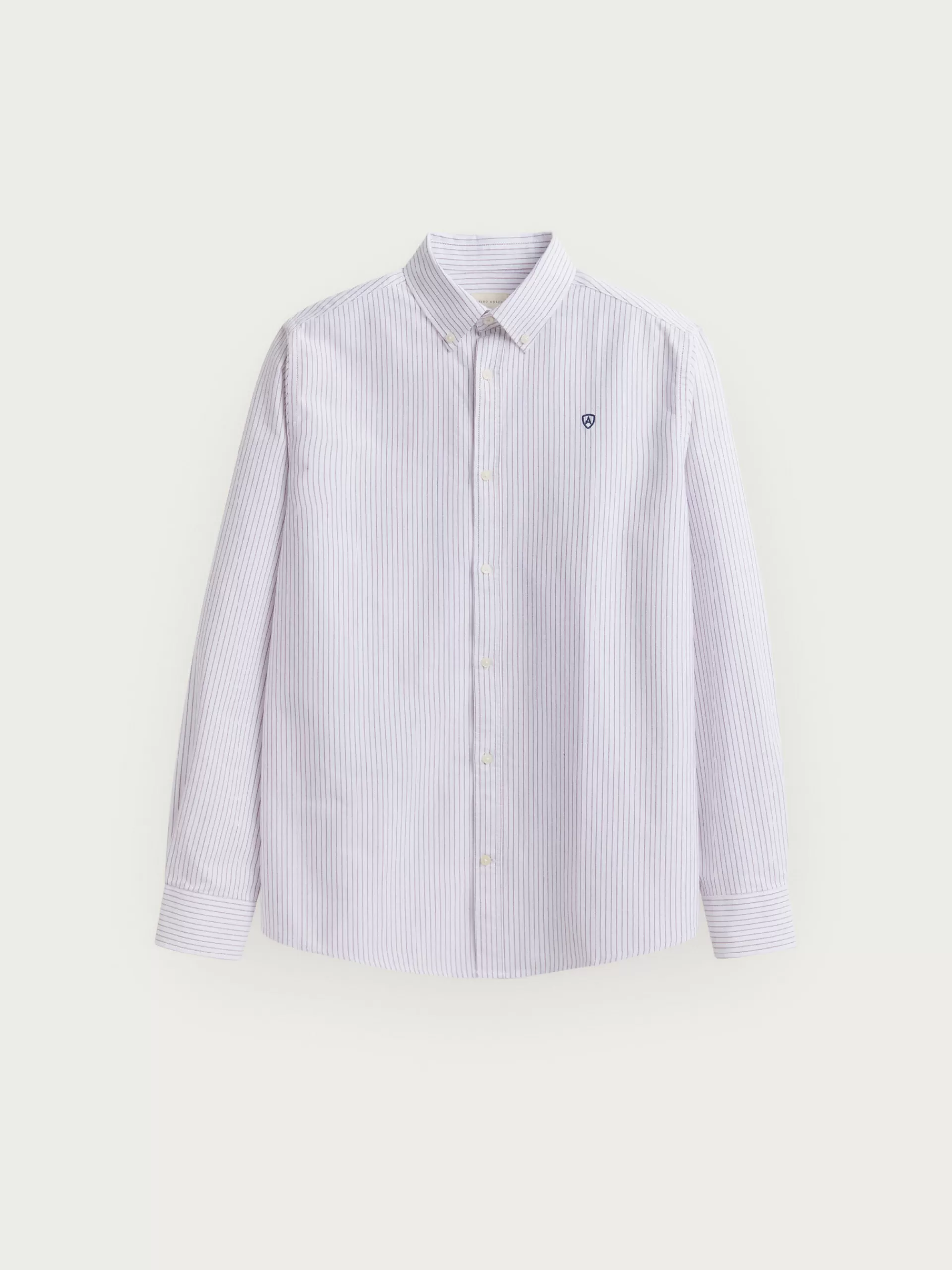 Camisa a rayas confeccionada en algodón con cuello clásico de botón, manga larga con puños simples y logo de la marca grabado en el frontal al tono. Corte regular fit.