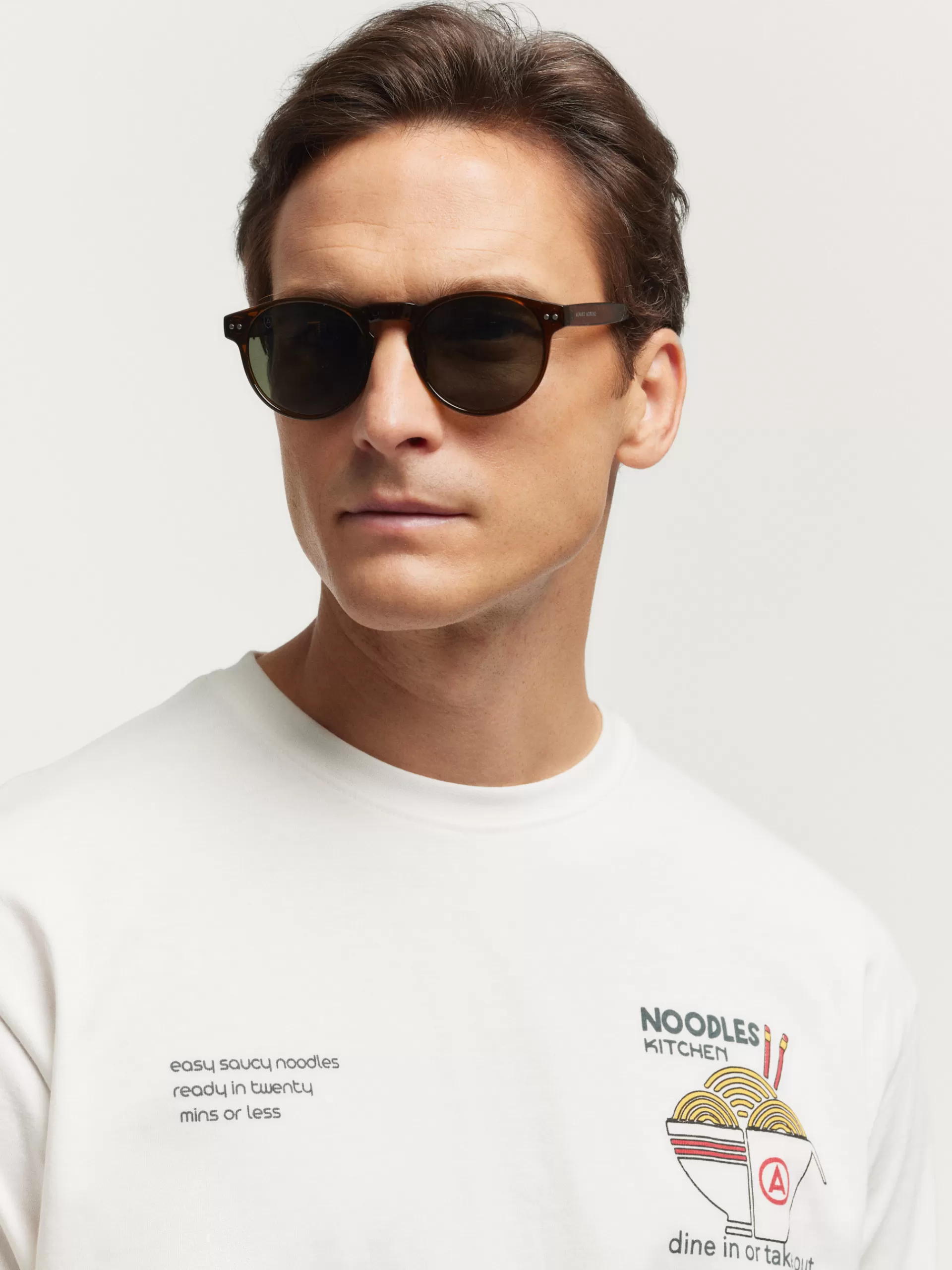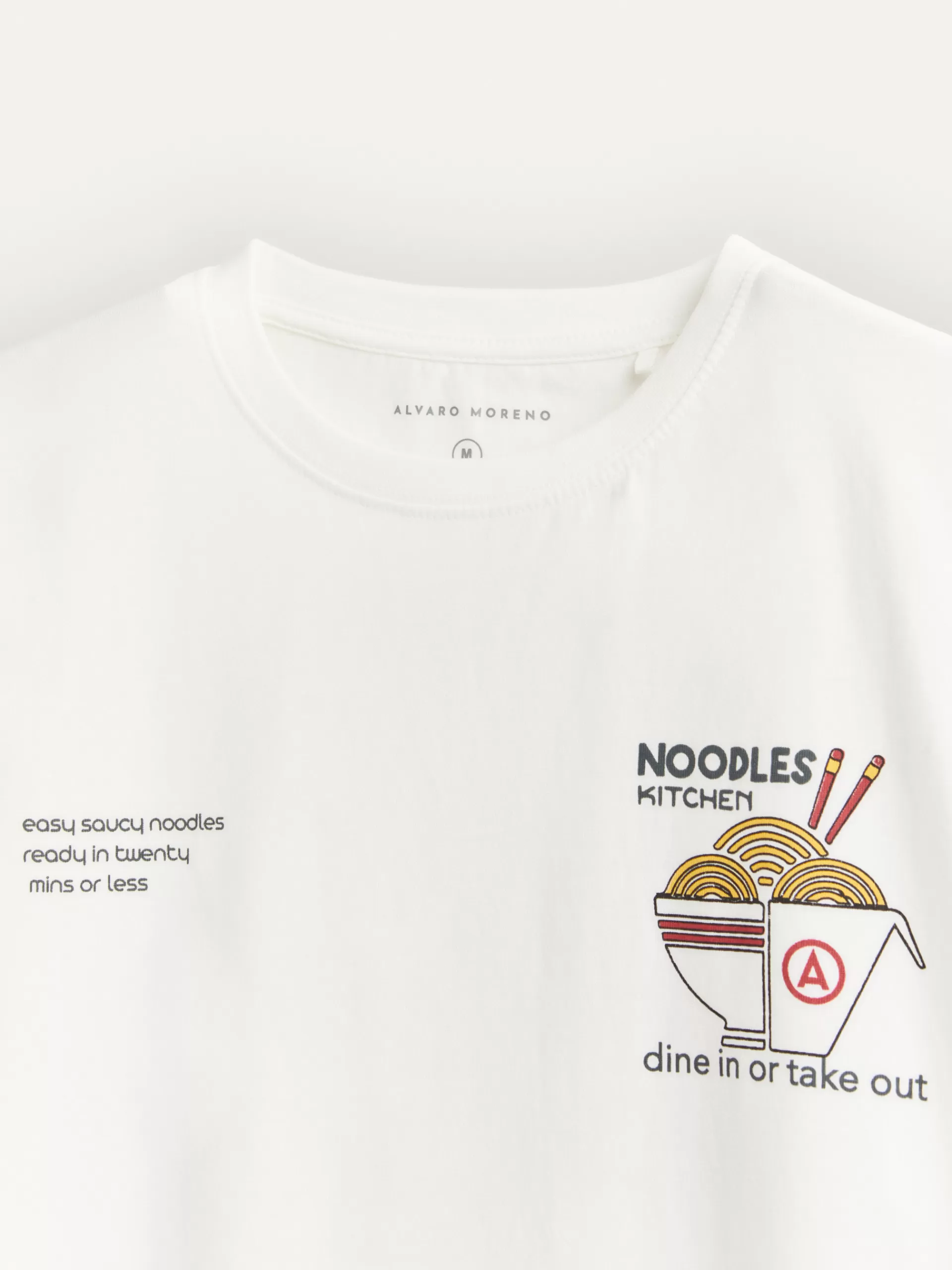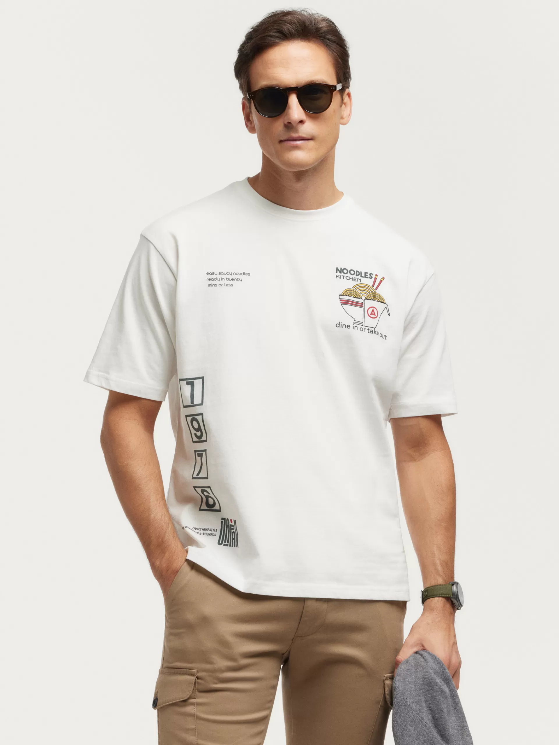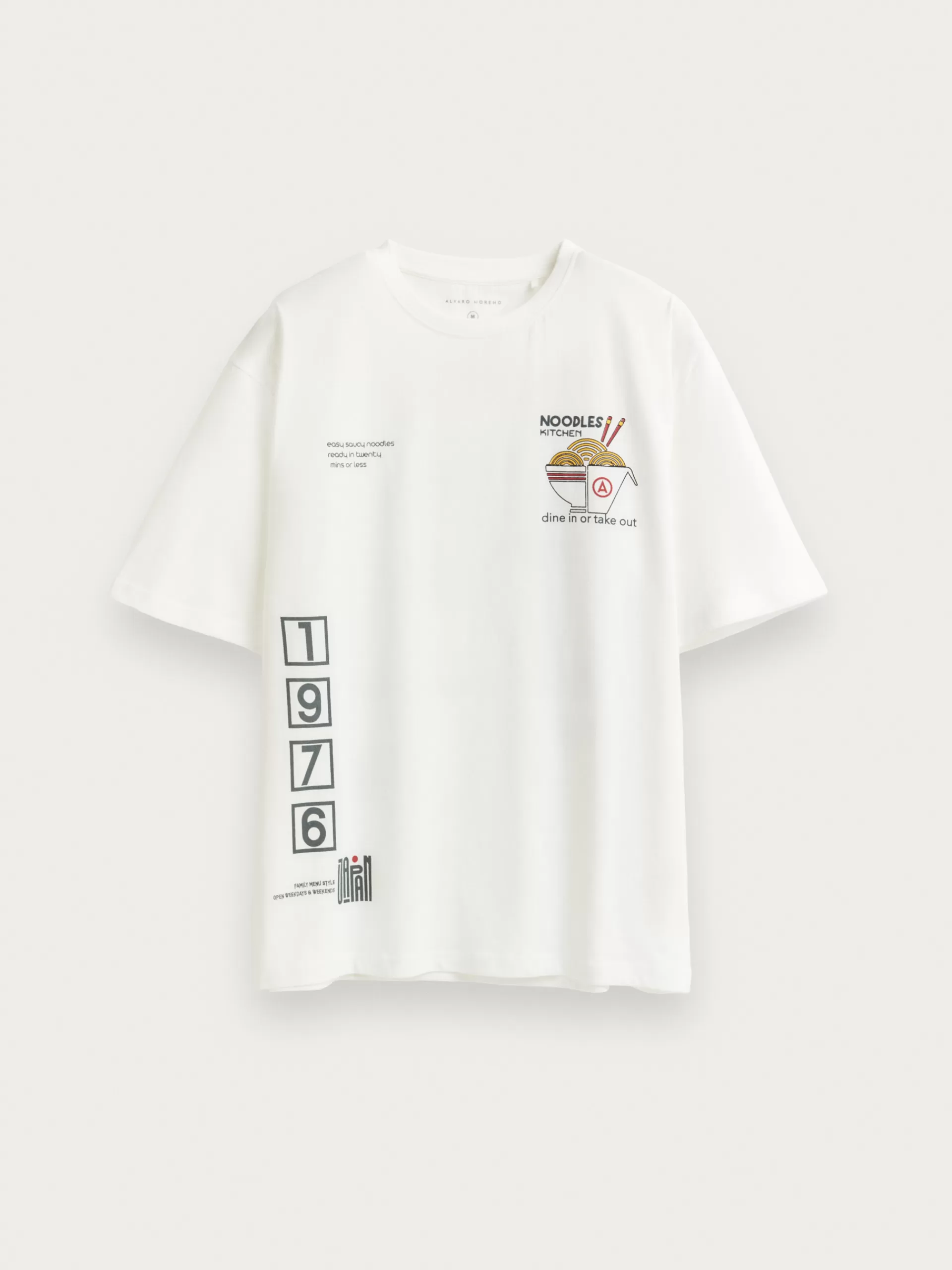 Camiseta con estampación personalizada en el frontal y en la parte trasera. Corte relaxed fit aportando un corte más relajado. Cuello redondo y manga corta ligeramente más anchas y largas.