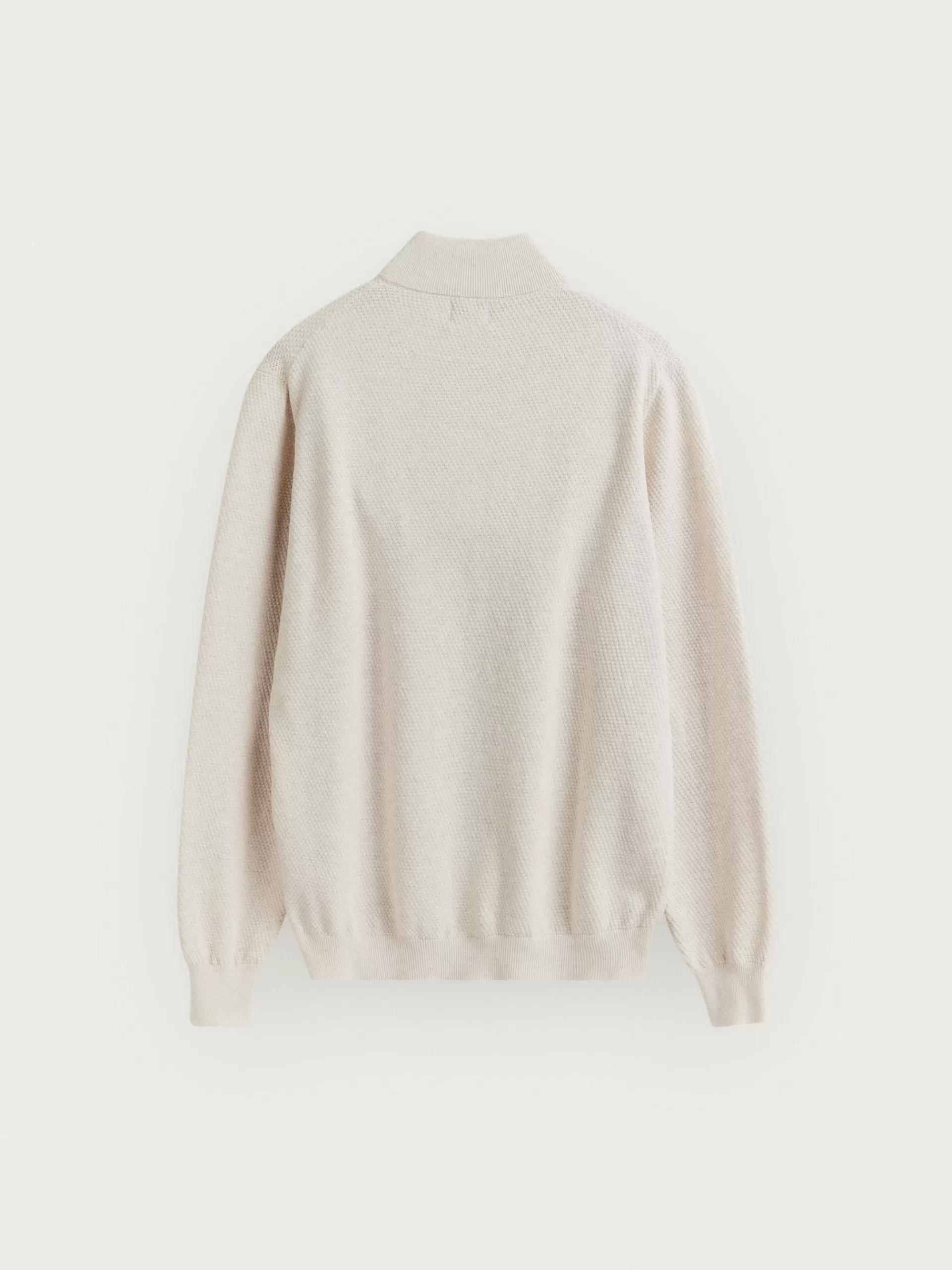 Jersey confeccionado en algodón con estructura en su tejido. Cuenta con cuello alto con medio cierre de cremallera y cuello, puños y bajo en acabado elástico. Corte regular fit.