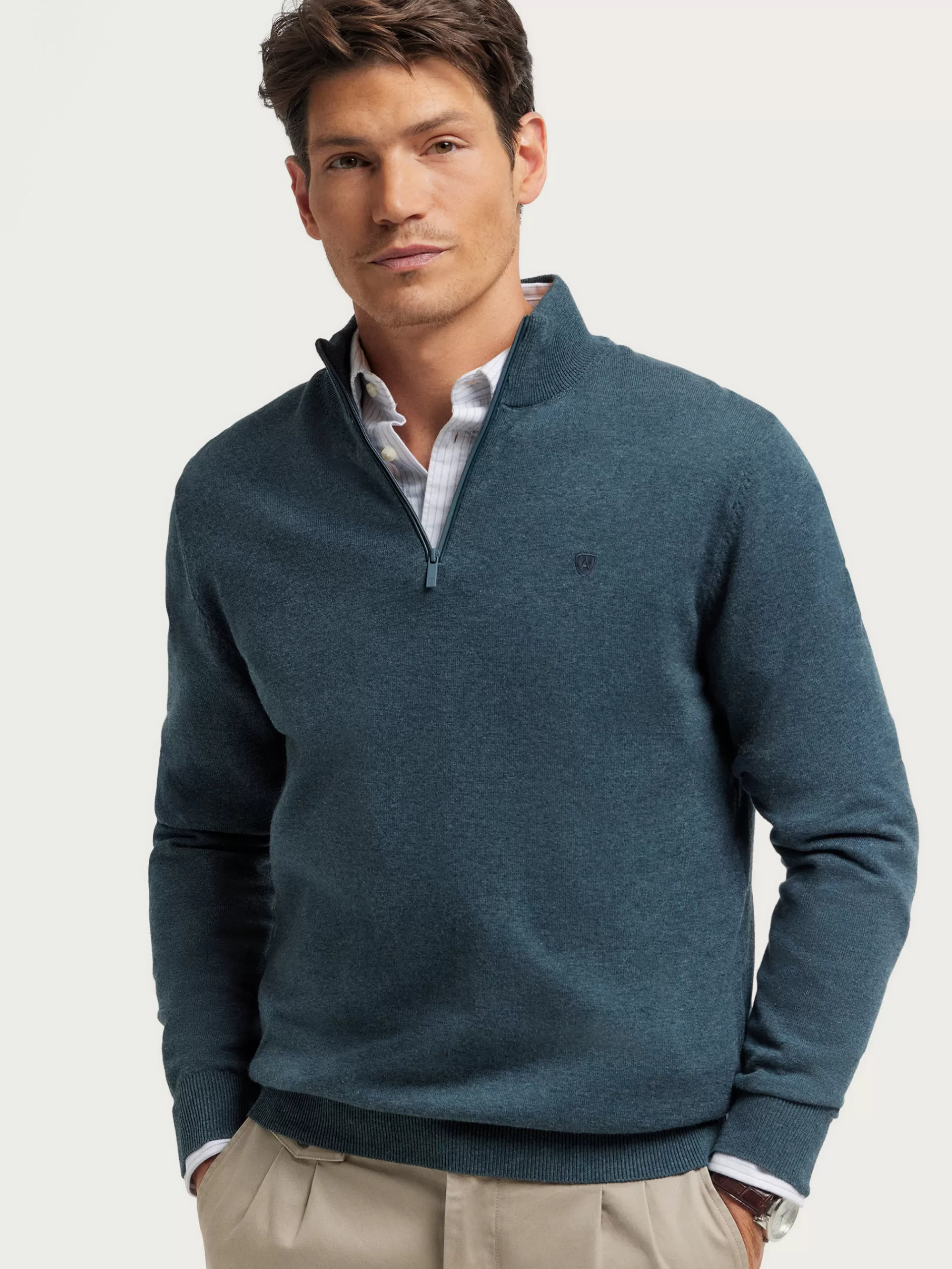 Jersey de corte regular confeccionado en algodón. Cuello alto con medio cierre de cremallera. Logo bordado en el frontal al tono. Cuello, puños y bajo en acabado elástico.