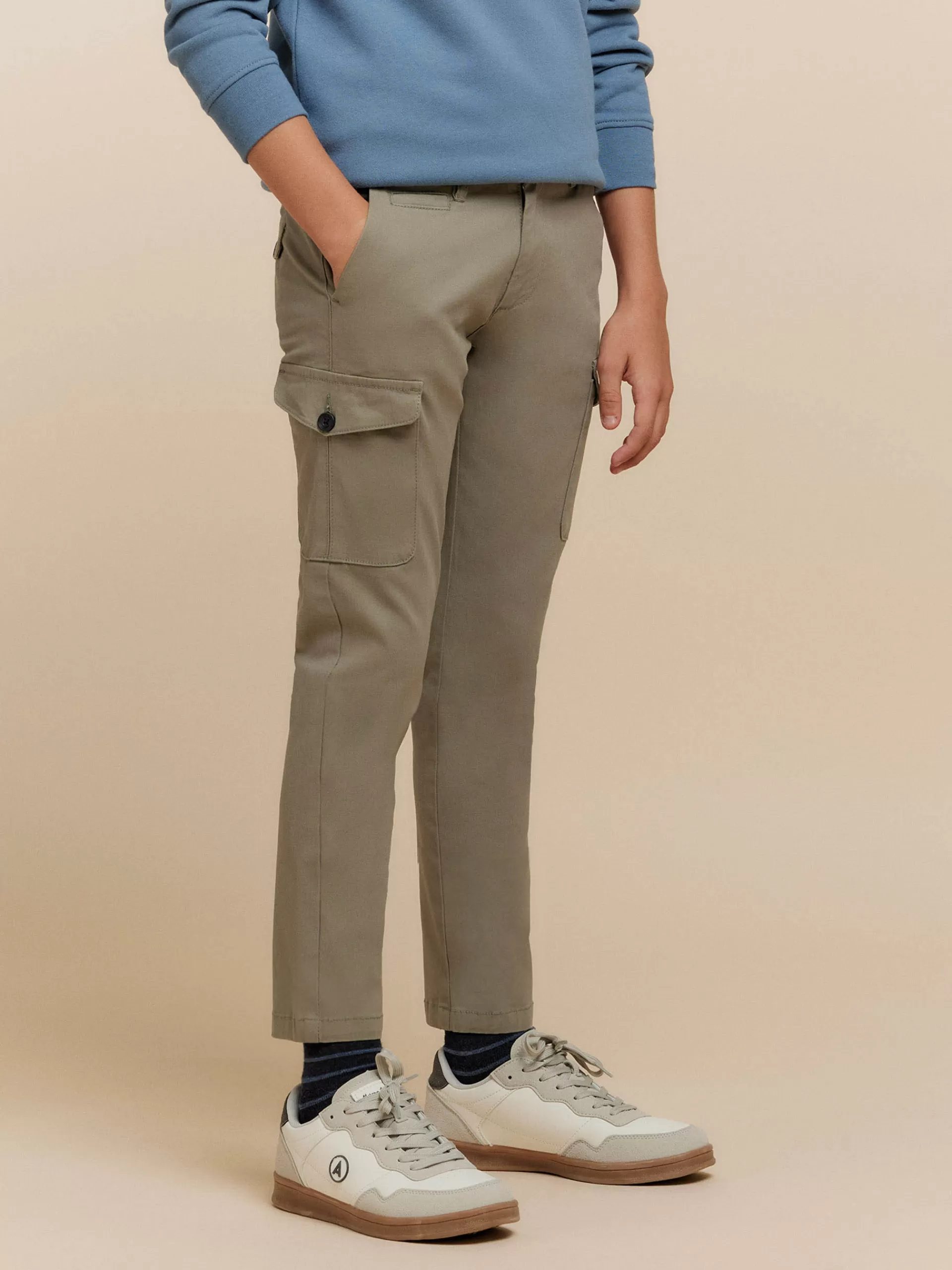 Pantalón cargo con cierre central mediante botón y cremallera. Dos bolsillos laterales y dos más bajos con cierre med…