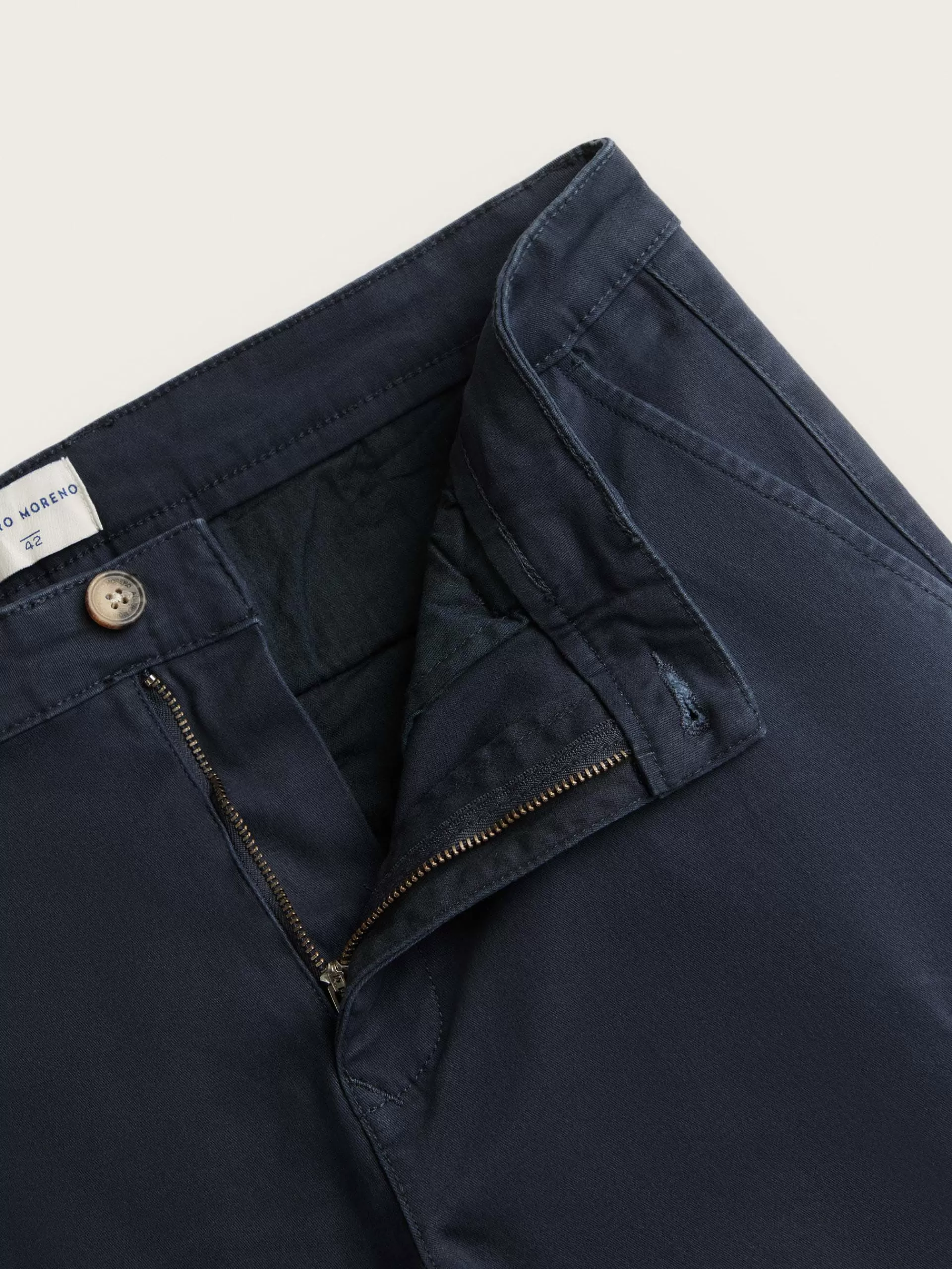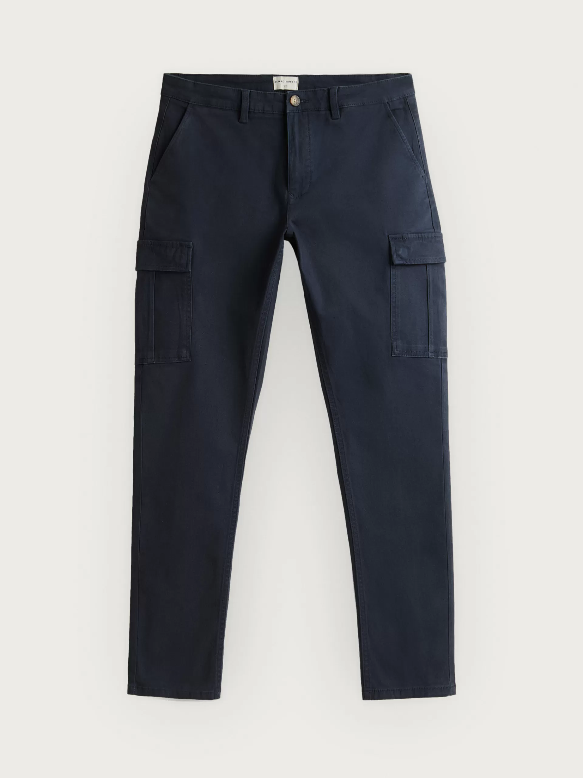 Pantalón estilo cargo con cierre central mediante botón y cremallera. Dos bolsillos en el frontal, dos en el bajo lateral y dos en la parte trasera. Detalle personalizado uno de los bolsillos traseros. Corte slim fit.