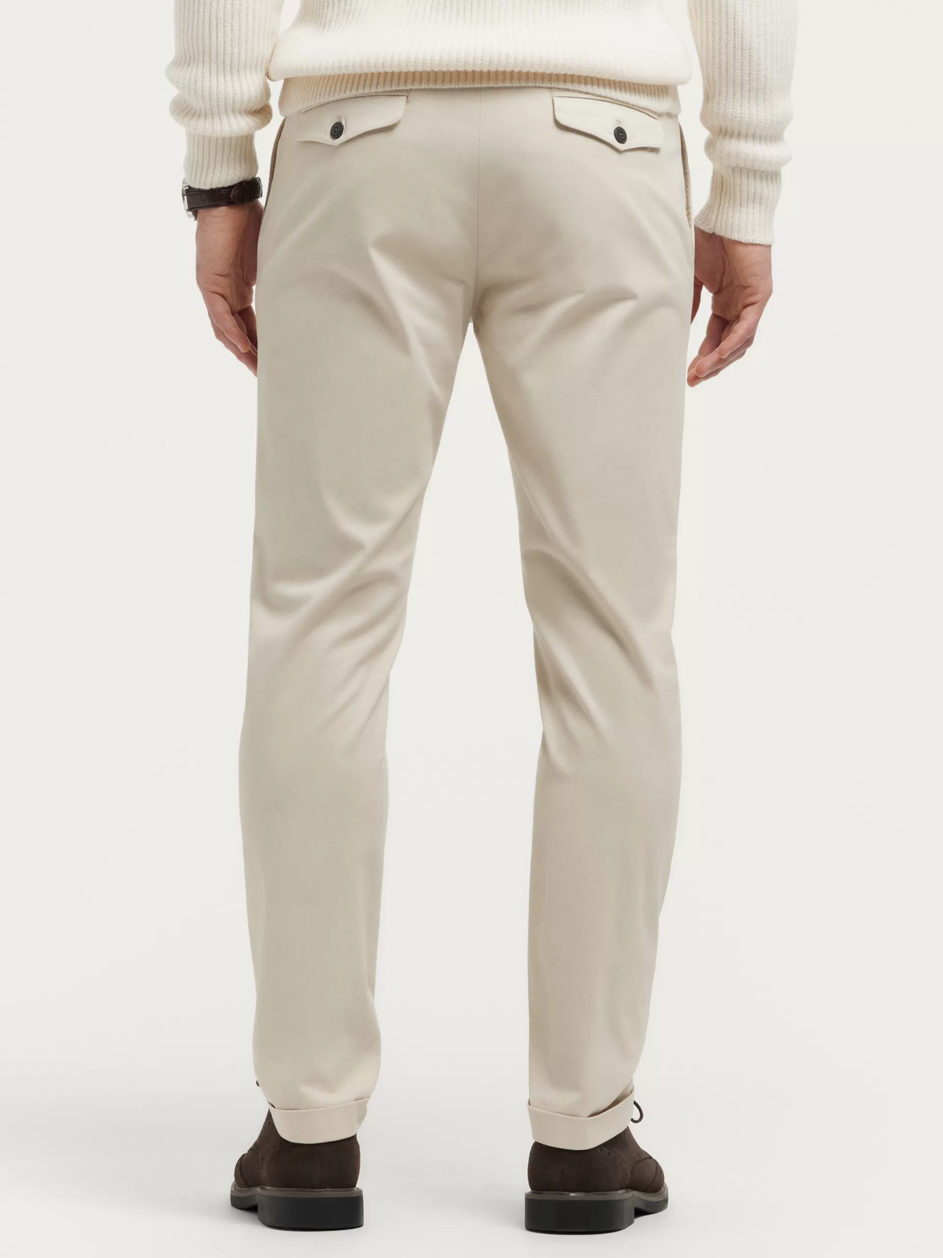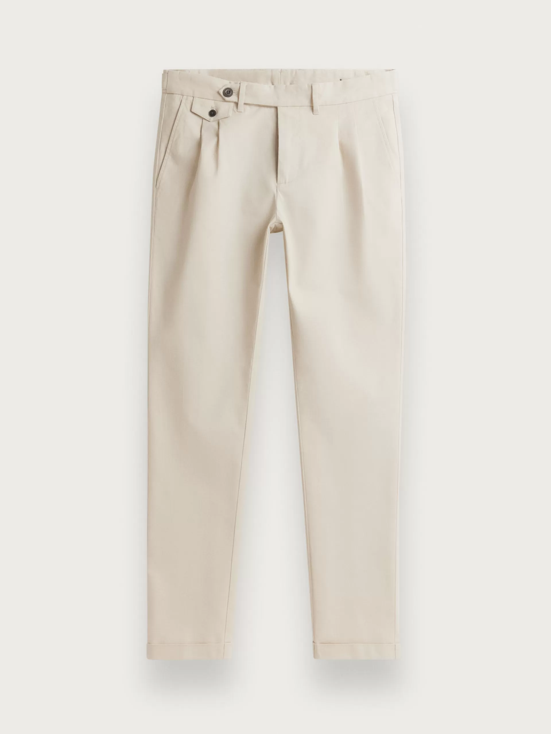 Pantalón de corte carrot fit con cierre delantero cruzado mediante dos botones y cremallera. Pinzas delante, ajustable en la cinturilla, dos bolsillos laterales y dos traseros. Logo grabado sobre un bolsillo trasero y bajo acabado con vuelta.