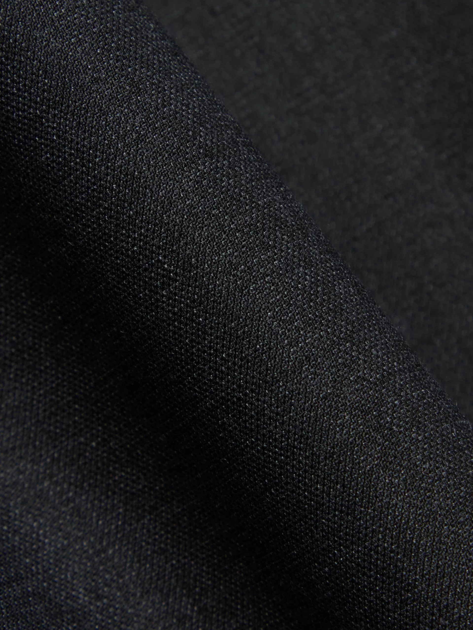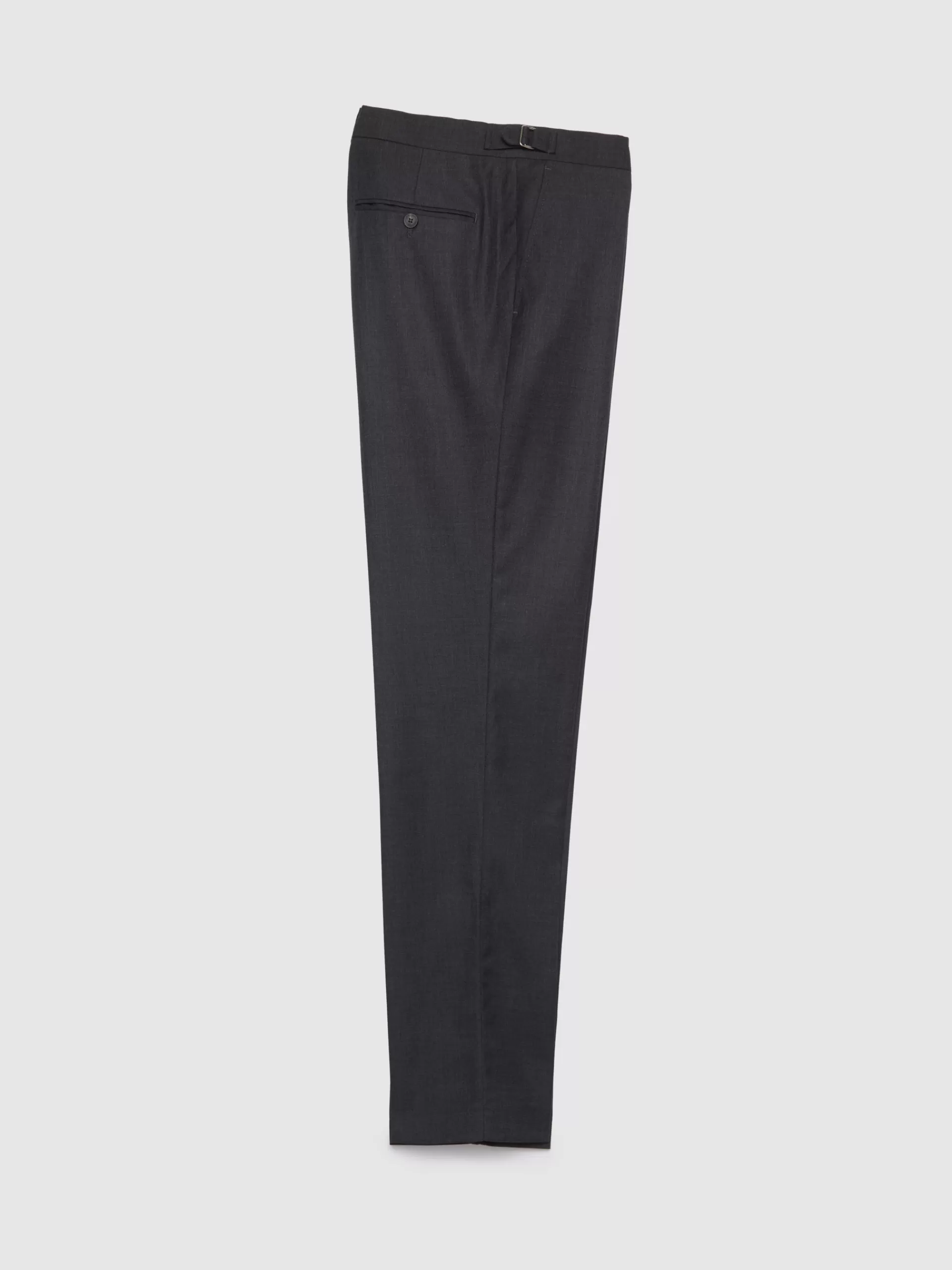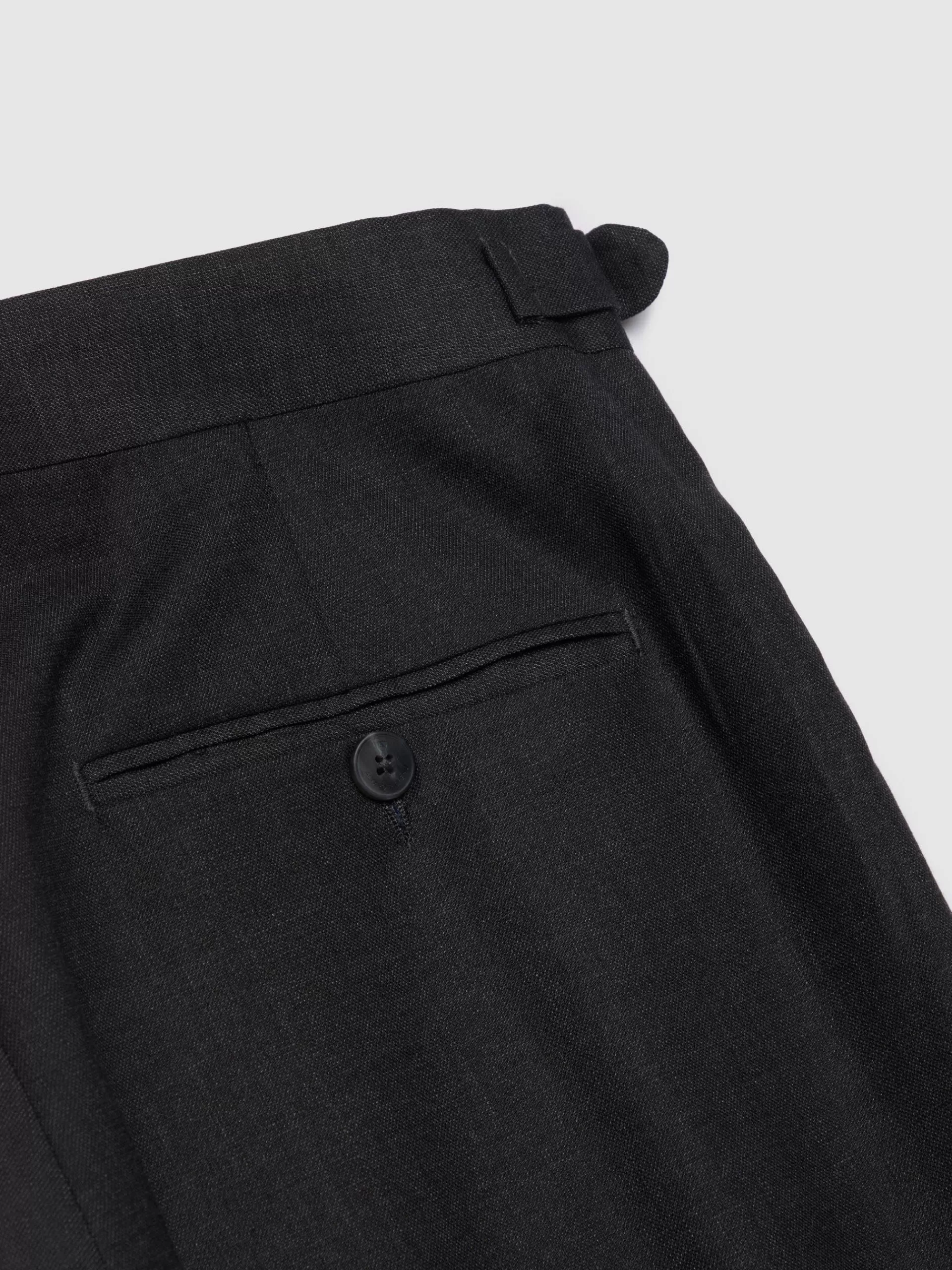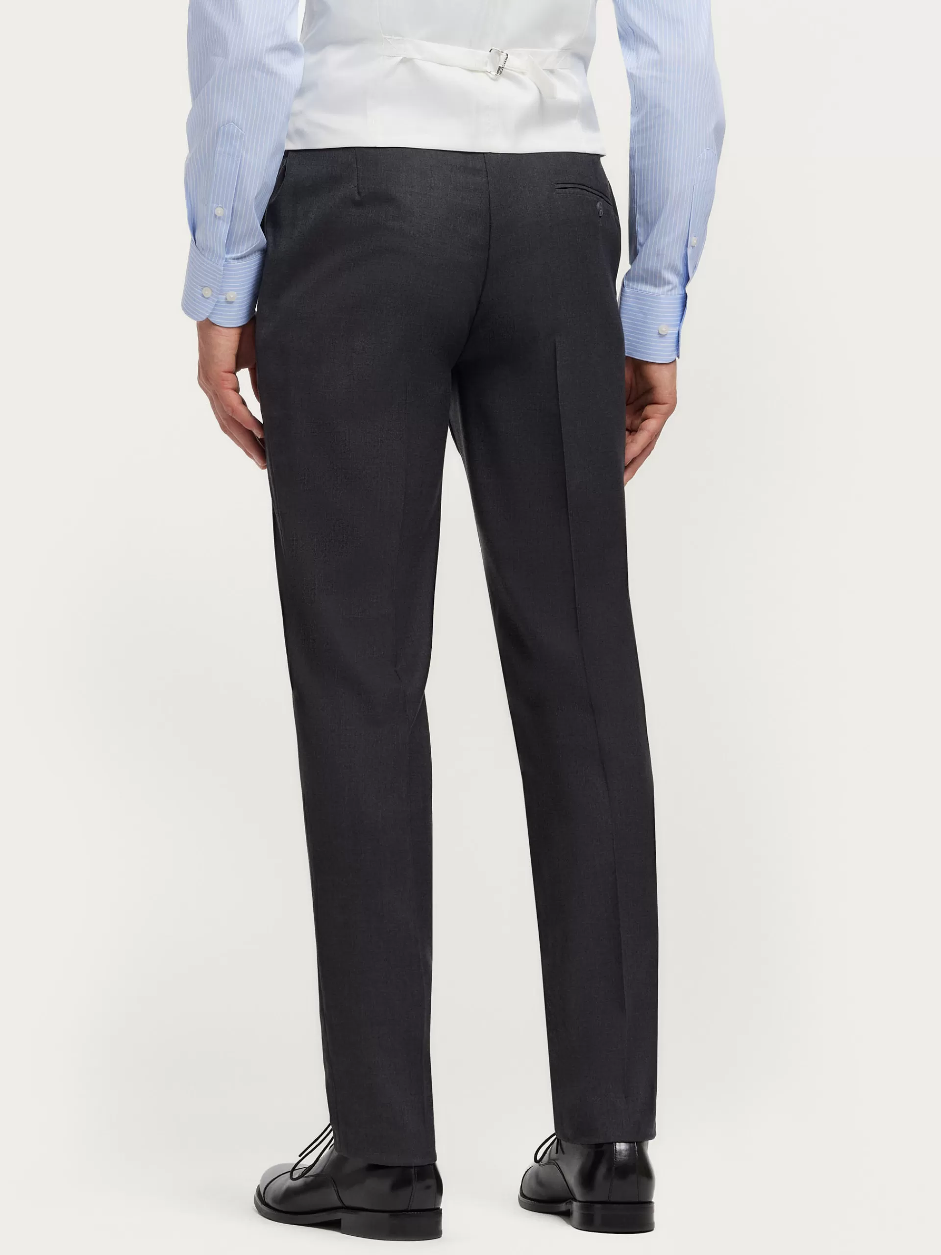 Pantalón de chaqué de un conjunto de dos piezas. Cuenta con cierre central mediante botón y cremallera, dos bolsillos ribeteados en la cintura y dos bolsillo de ojal con botón en la parte trasera. Forrado en su interior.