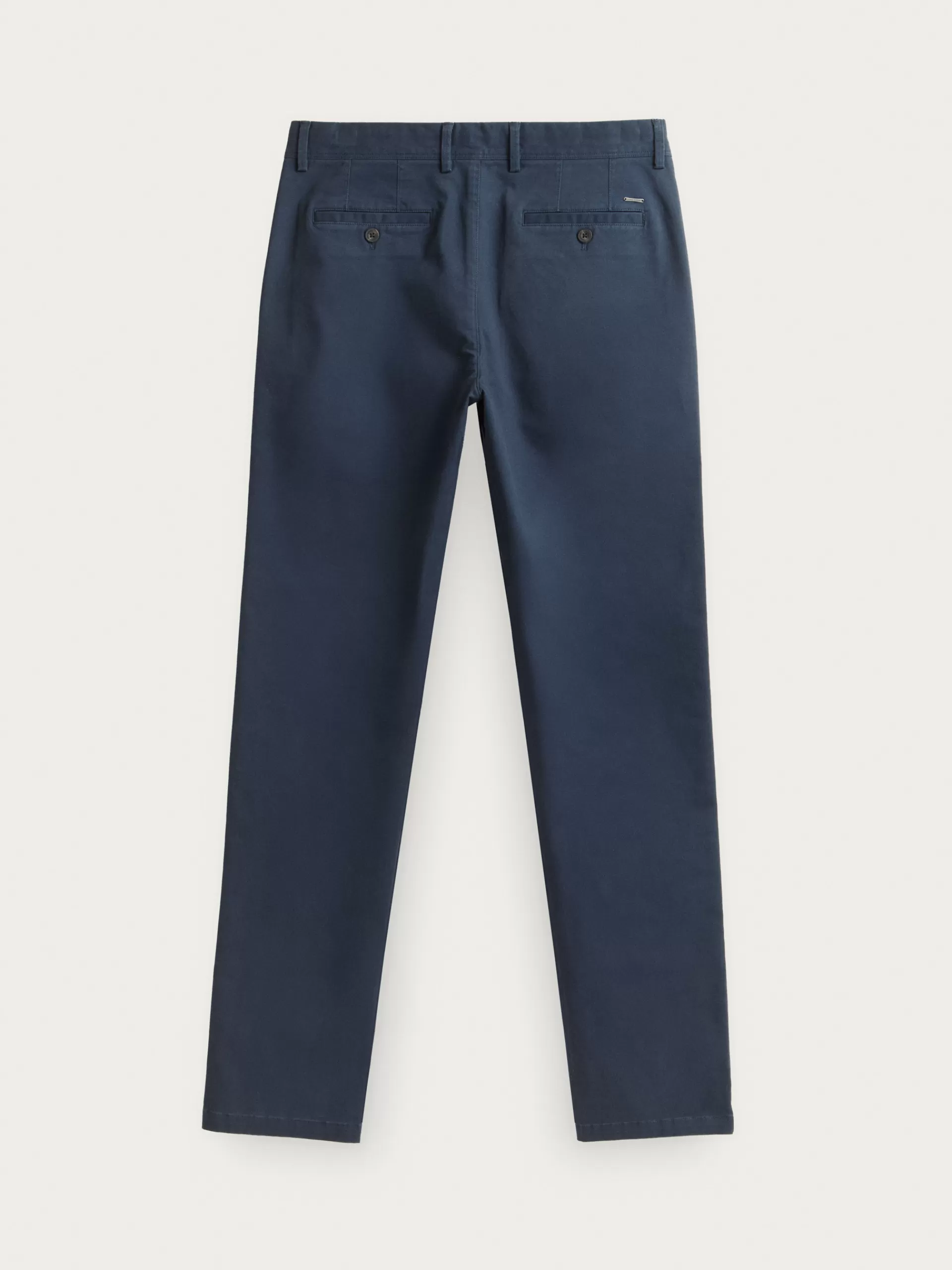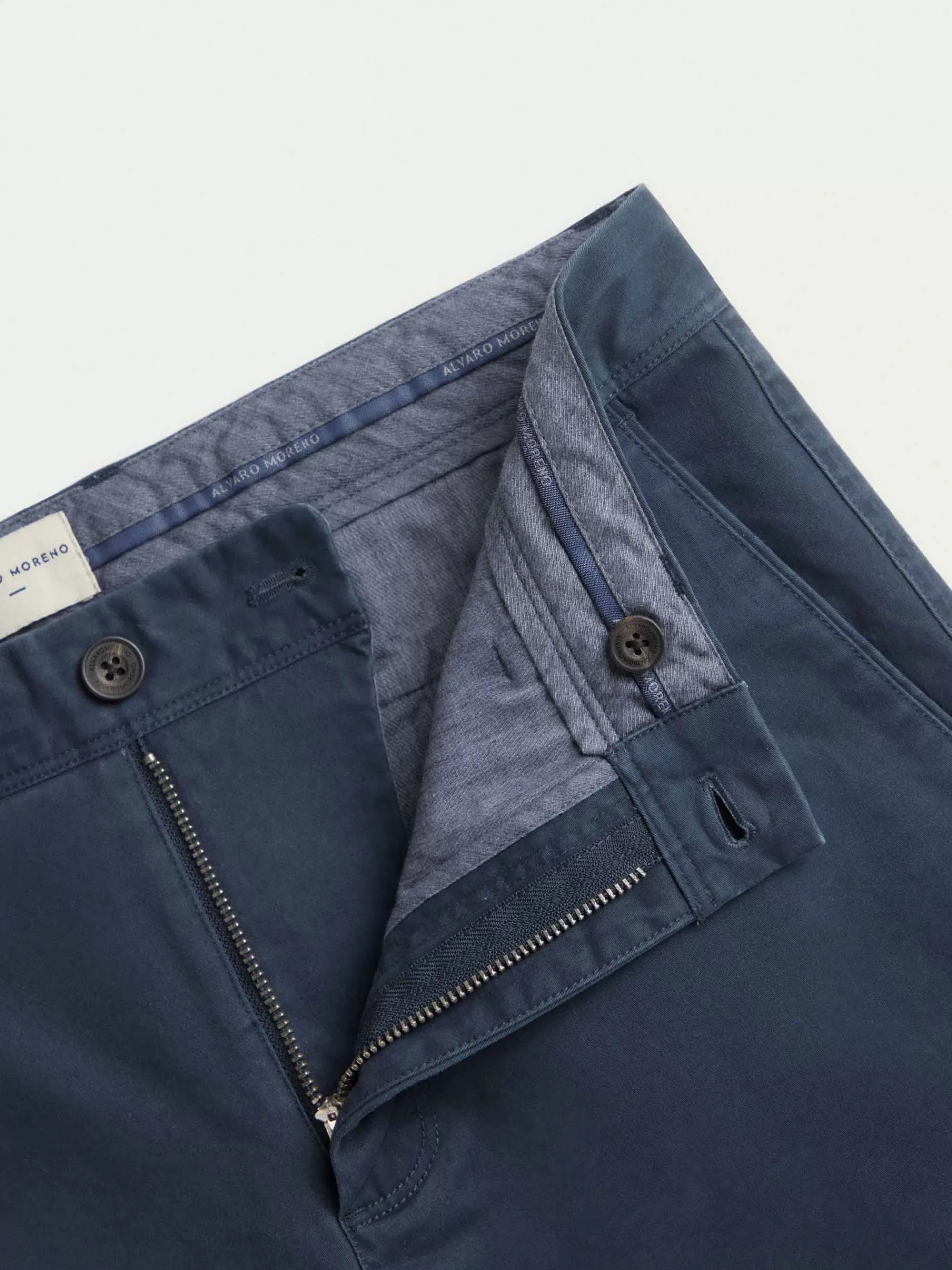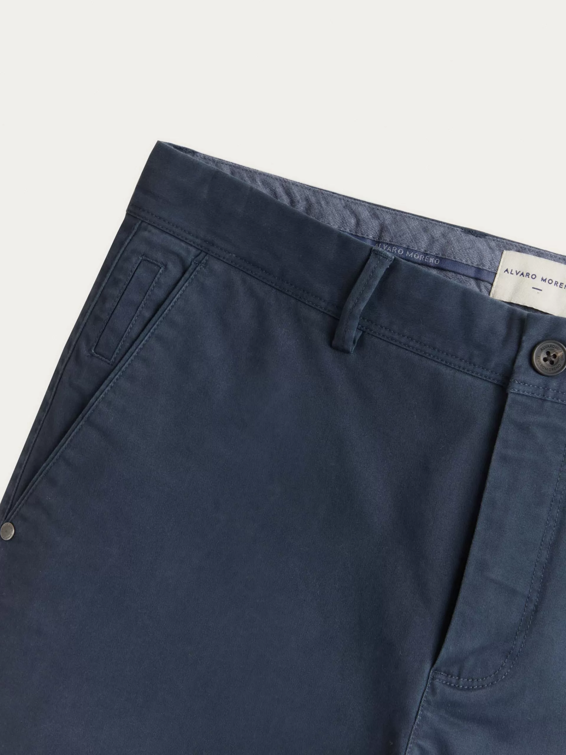 Pantalón estilo chino con cierre central de botón y cremallera, bolsillos tipo chino y detalle personalizado sobre uno…