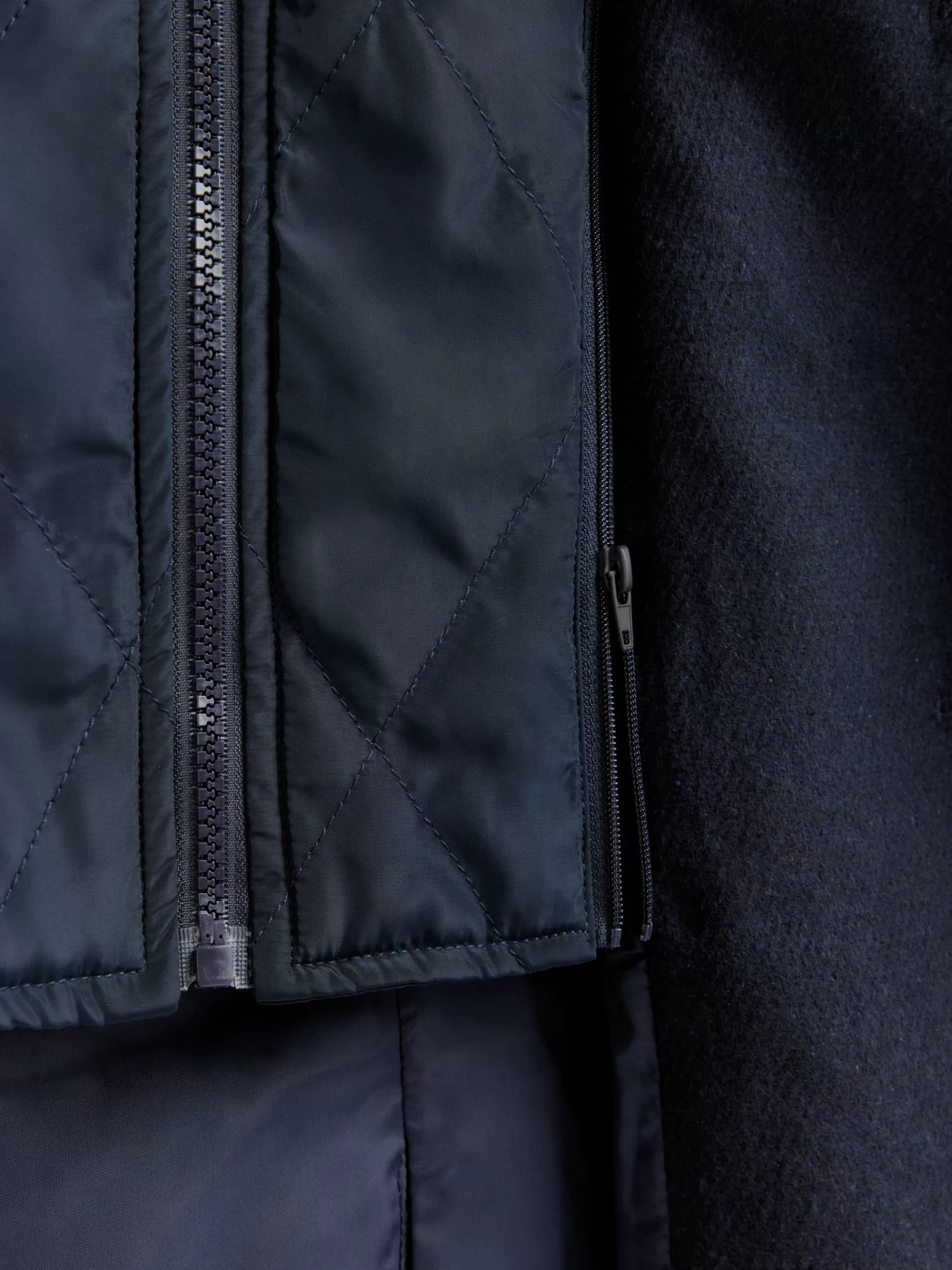 Abrigo con chalequillo interior de cuello subido y desmontable mediante cremallera. Cuenta con cuello y solapa, cierre c…