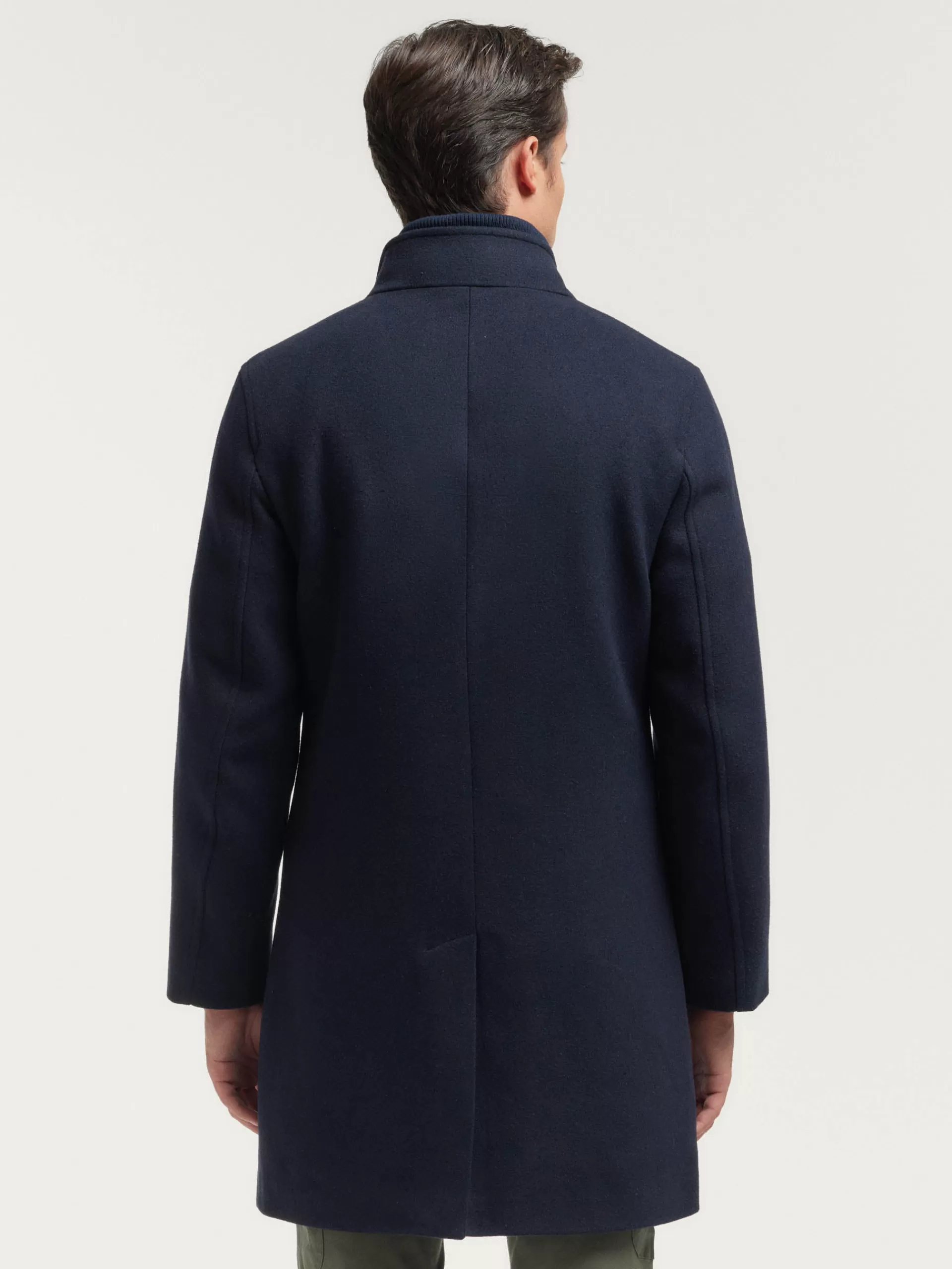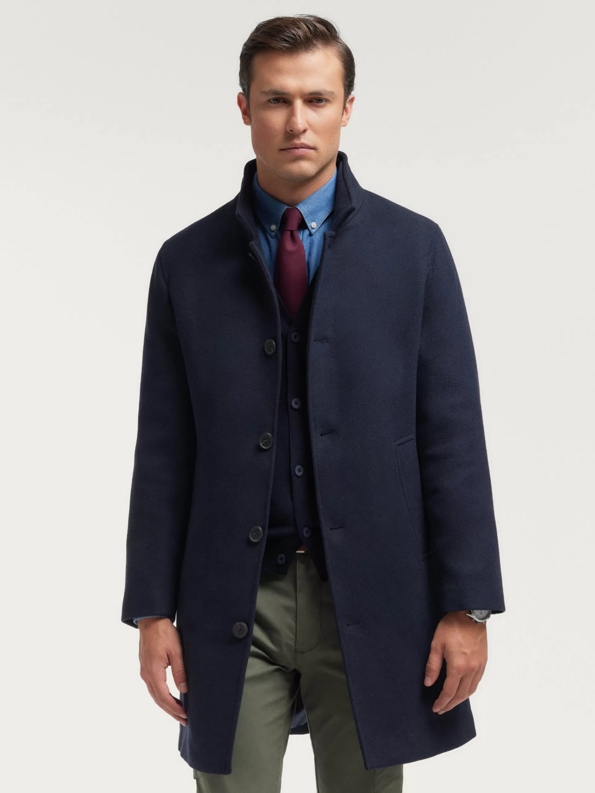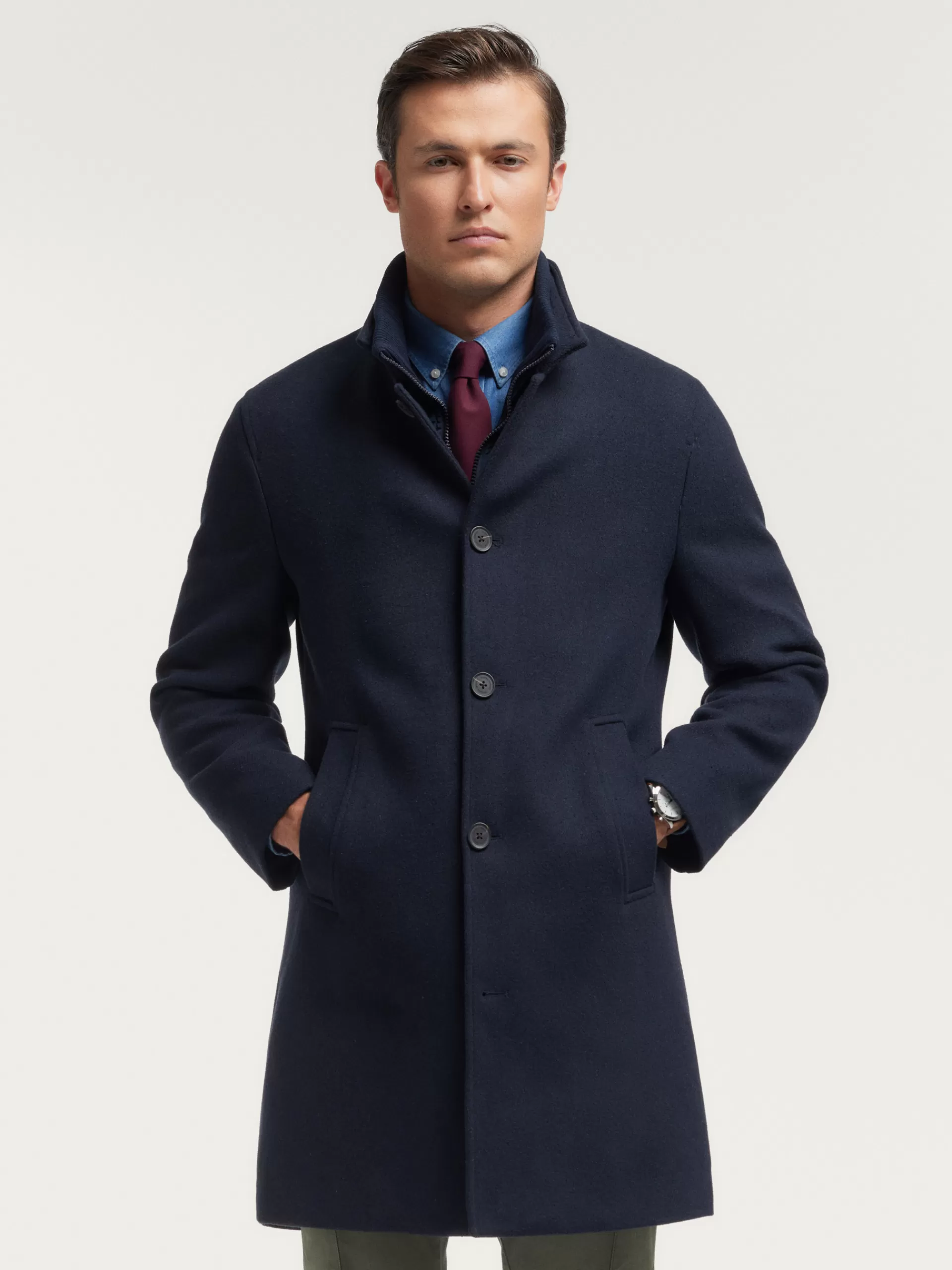 Abrigo con chalequillo interior de cuello subido y desmontable mediante cremallera. Cuenta con cuello y solapa, cierre central simple mediante botonadura efecto madera, cierre del chalequillo por cremallera y abertura en el bajo de la espalda. Dos bolsillos en la cintura y dos bolsillos en su interior. Corte regular fit.