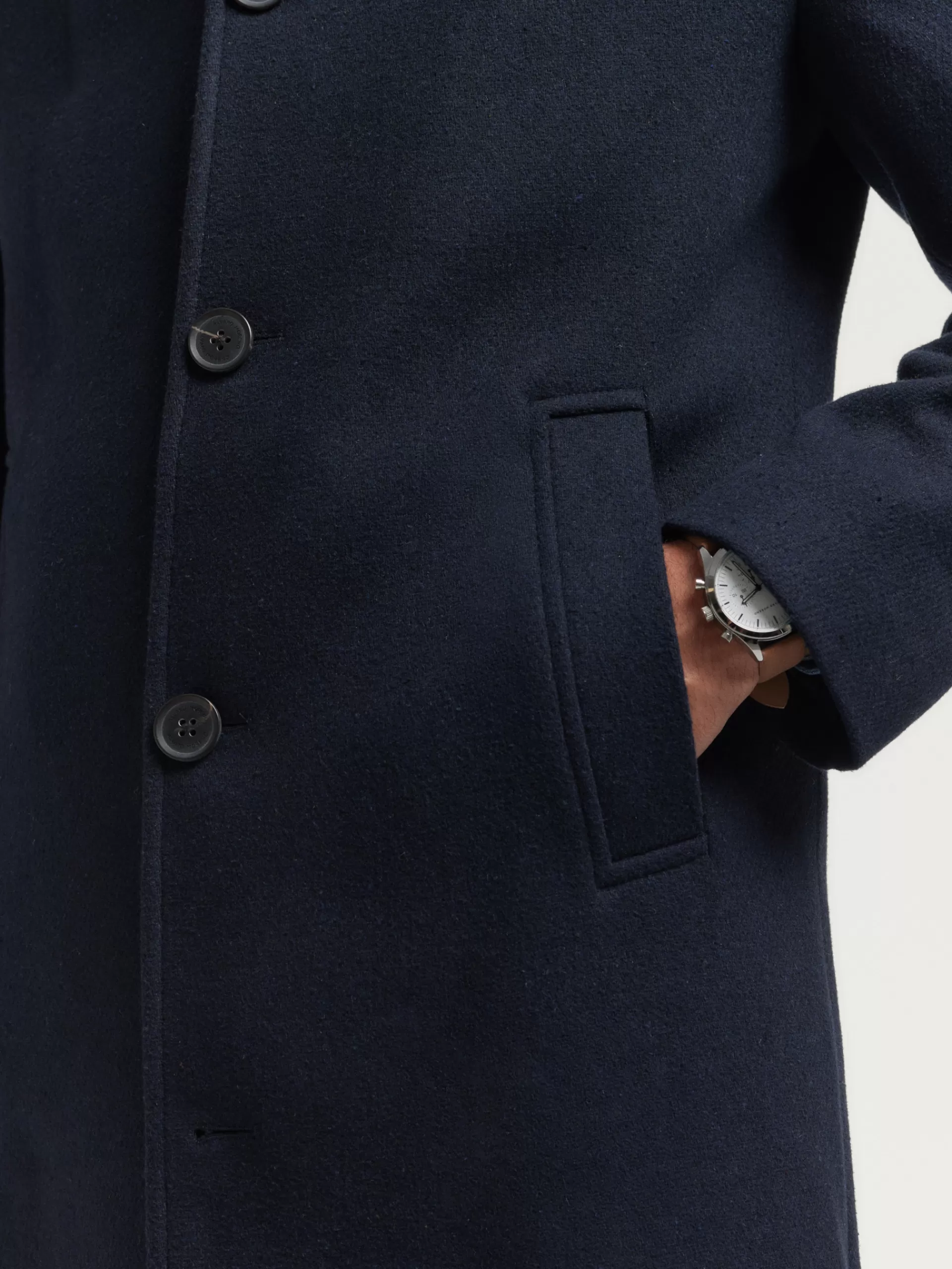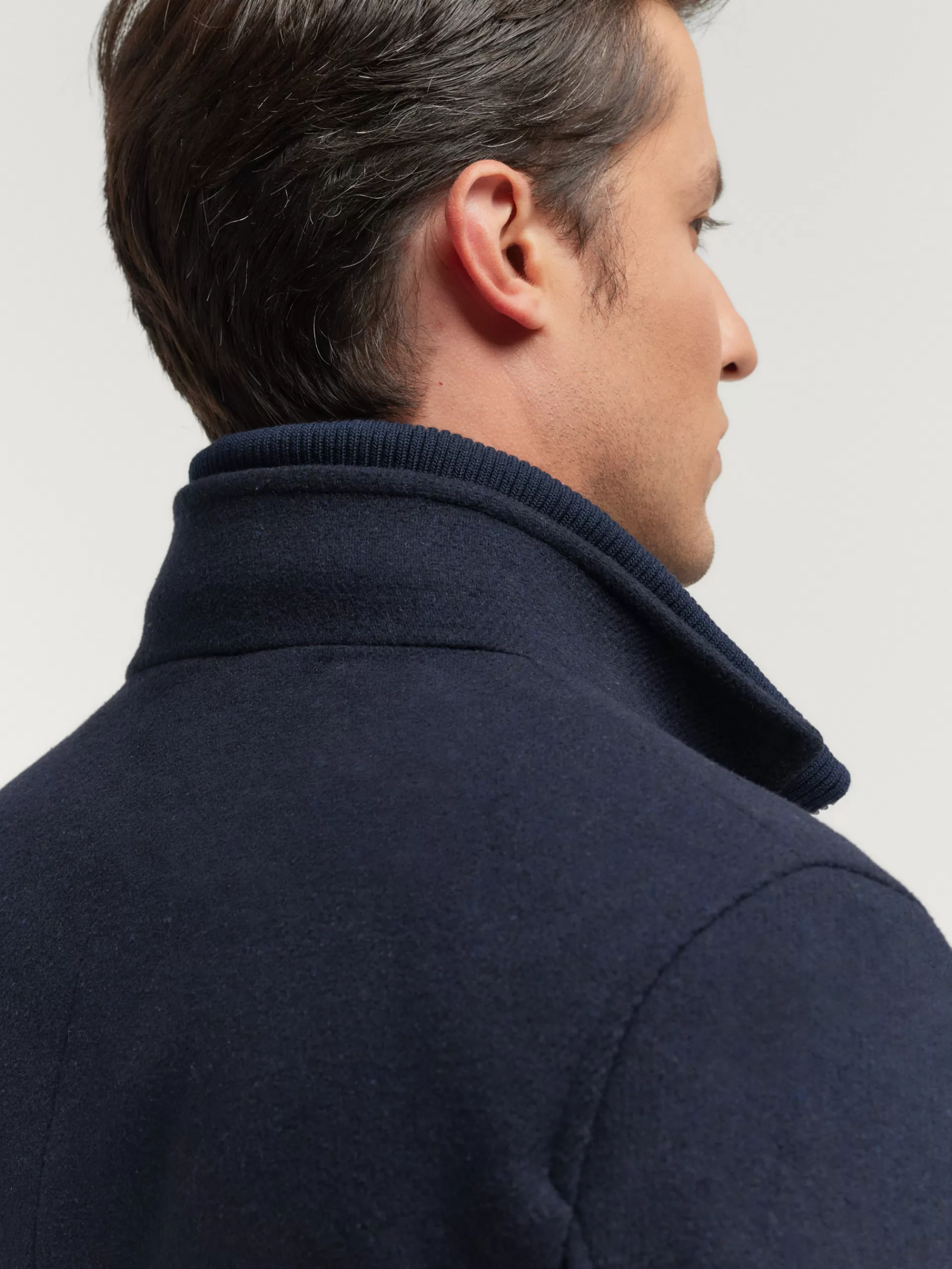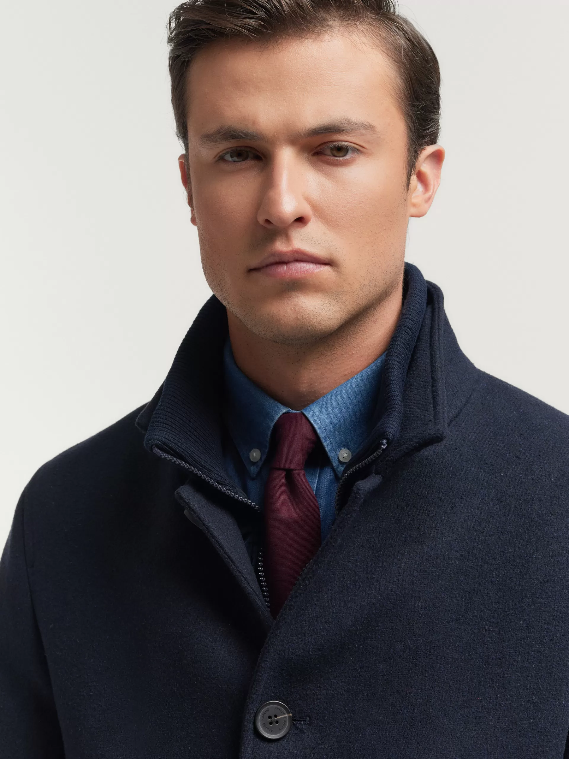 Abrigo con chalequillo interior de cuello subido y desmontable mediante cremallera. Cuenta con cuello y solapa, cierre central simple mediante botonadura efecto madera, cierre del chalequillo por cremallera y abertura en el bajo de la espalda. Dos bolsillos en la cintura y dos bolsillos en su interior. Corte regular fit.