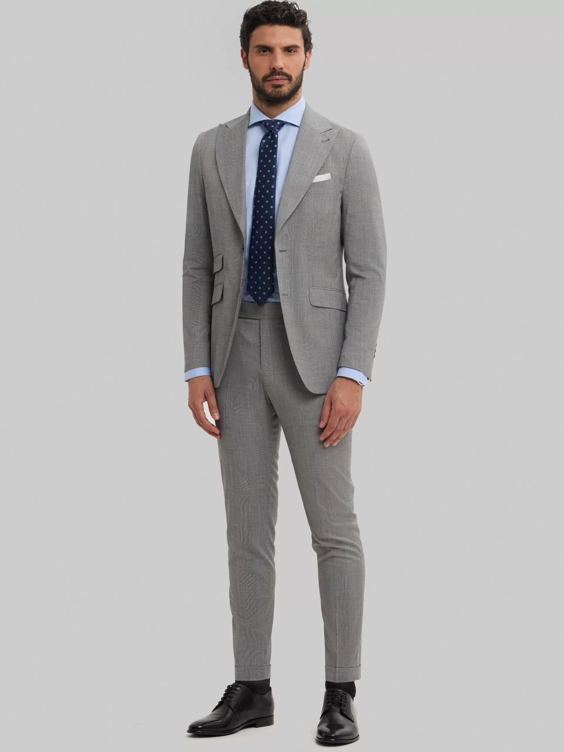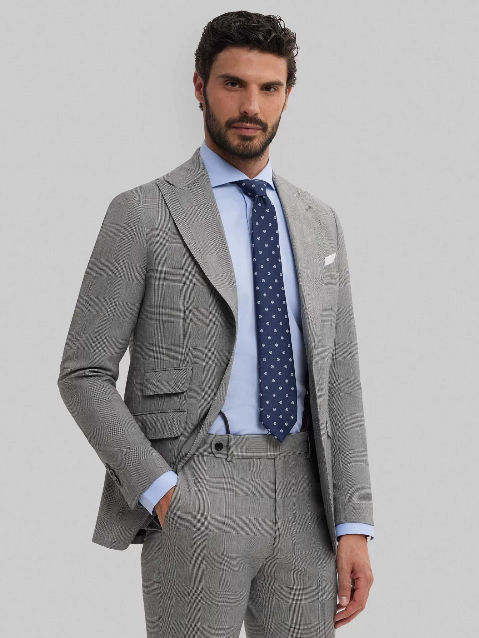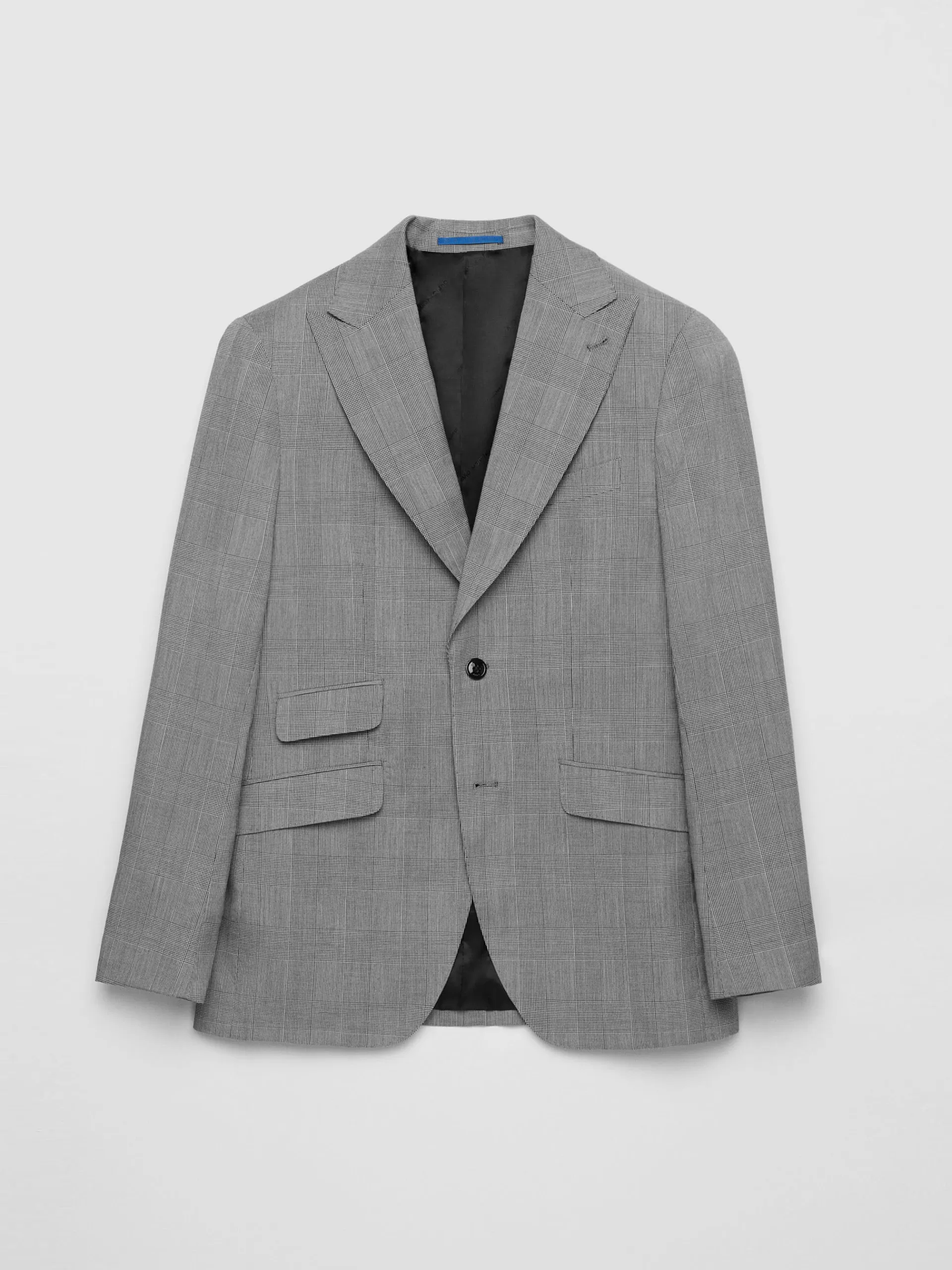 Americana de diseño a cuadros con un corte más relajado y con cuello y solapa ligeramente más ancha de estilo punta de lanza. Cierre central simple, bolsillo a la altura del pecho, tres bolsillos de solapa en la cintura con una leve inclinación y puños con terminación de botones. Interior forrado y con bolsillos.