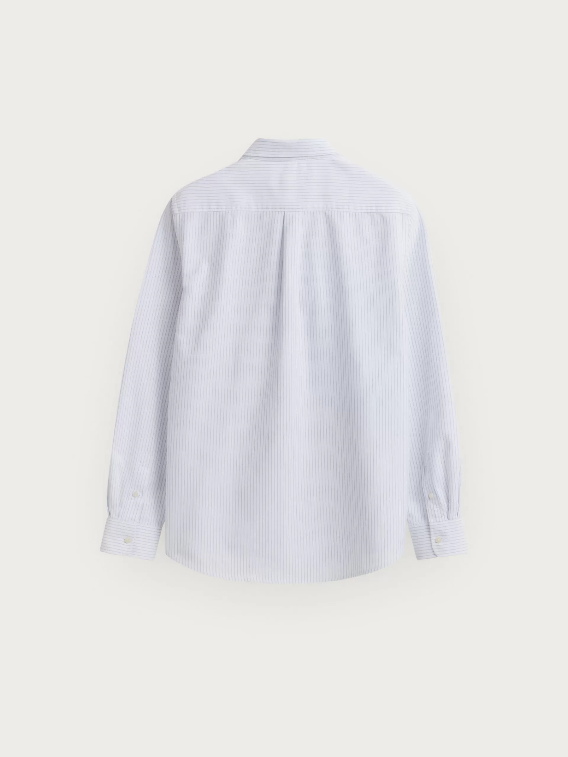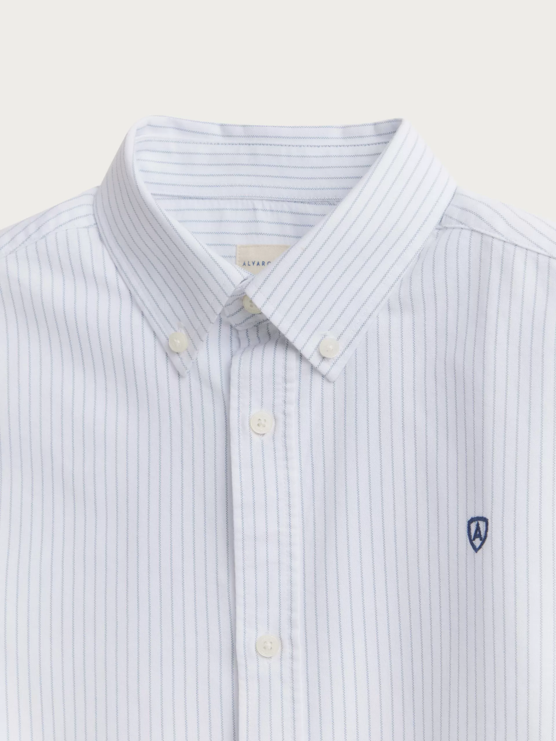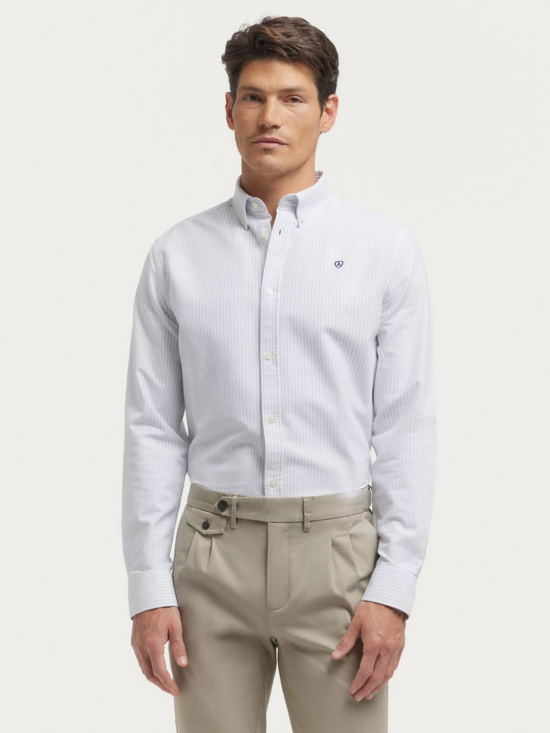 Camisa a rayas confeccionada en algodón con cuello clásico de botón, manga larga con puños simples y logo de la marca grabado en el frontal al tono. Corte regular fit.