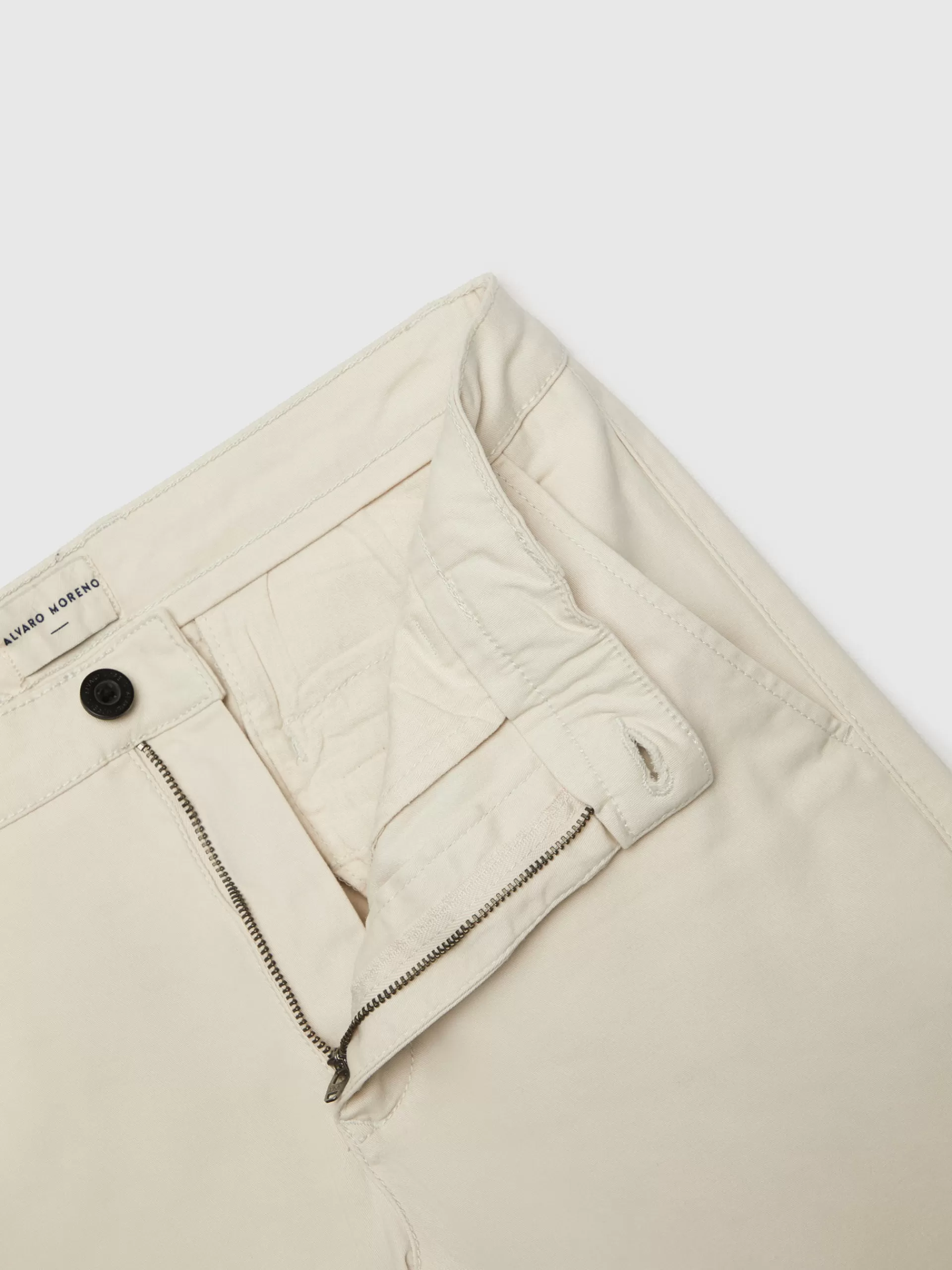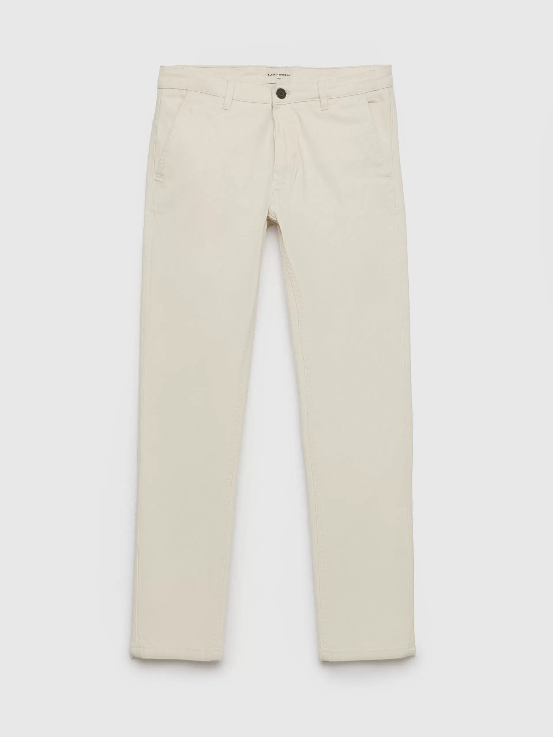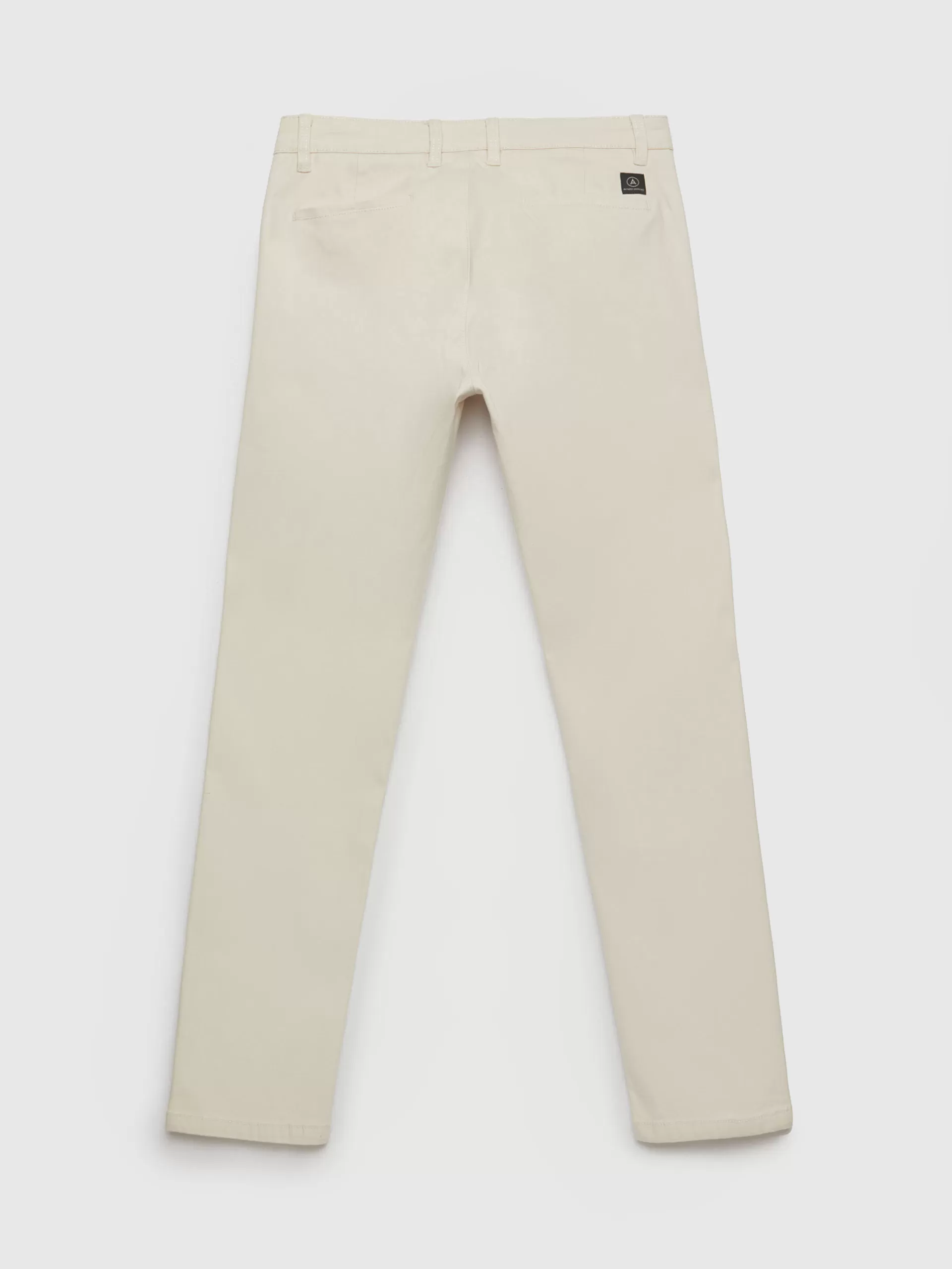 Pantalón de corte slim fit de estilo chino con cierre central mediante botón y cremallera, dos bolsillos en el frontal y dos en la parte trasera con detalle personalizado a contraste sobre uno de ellos.