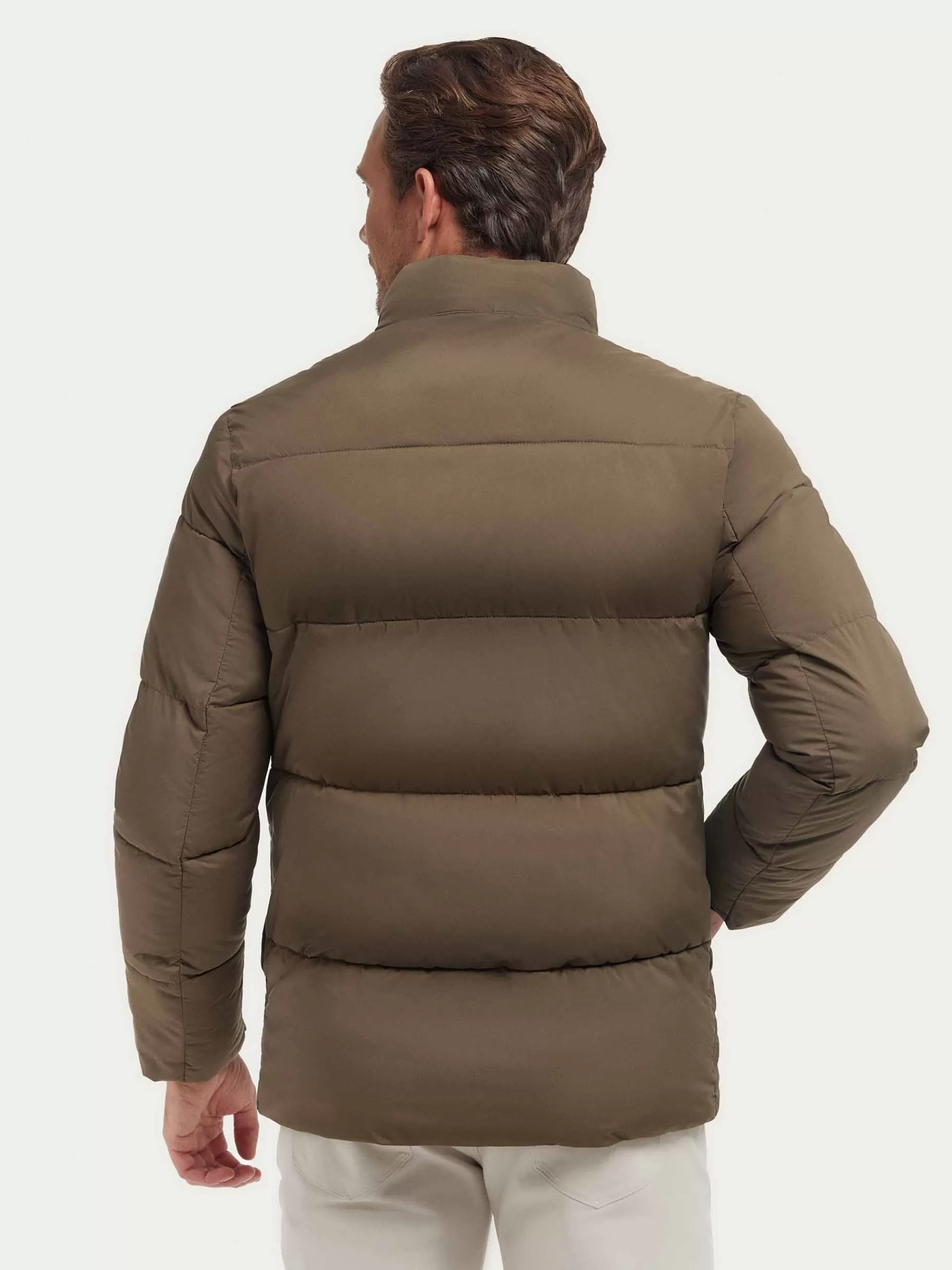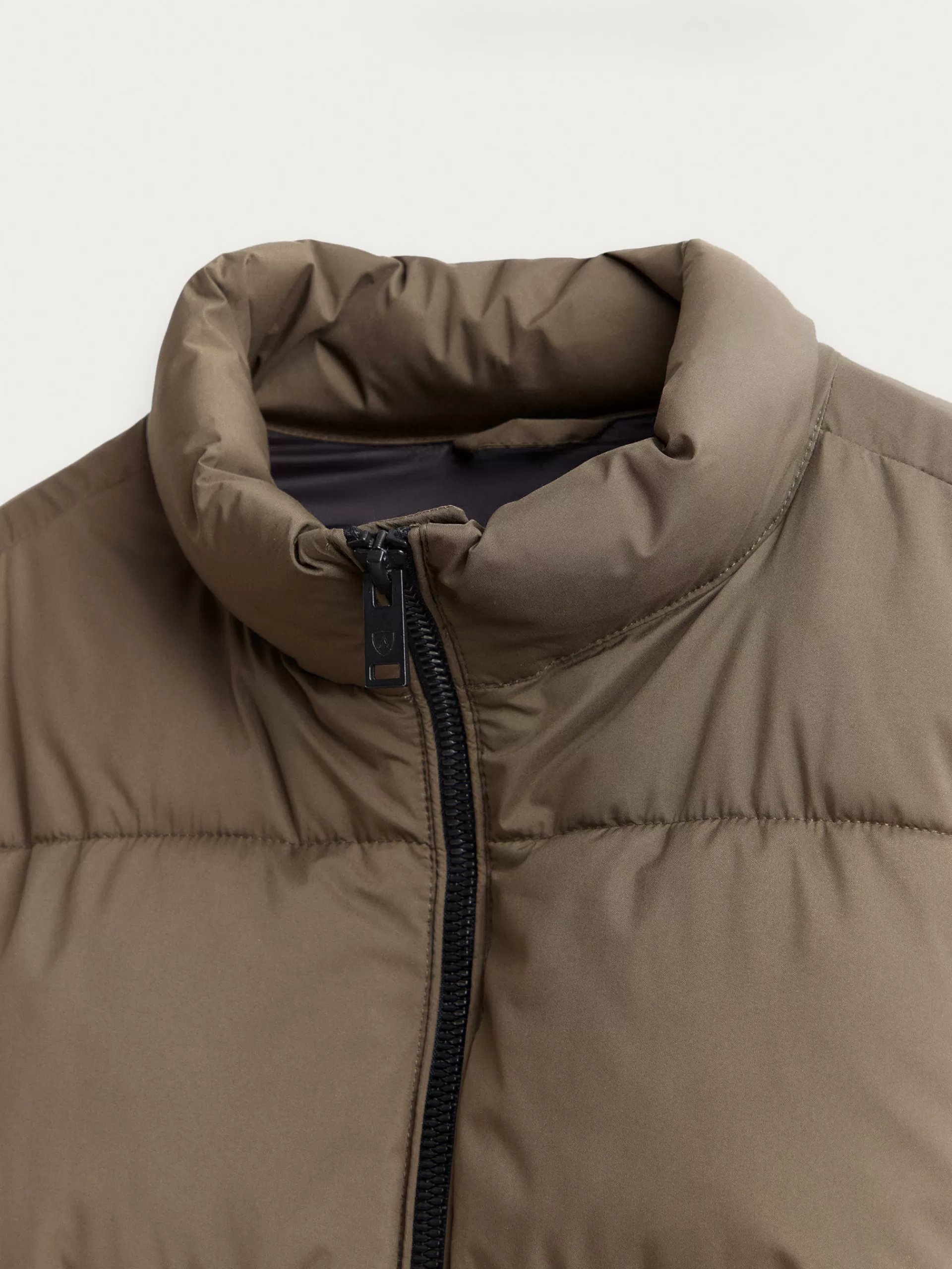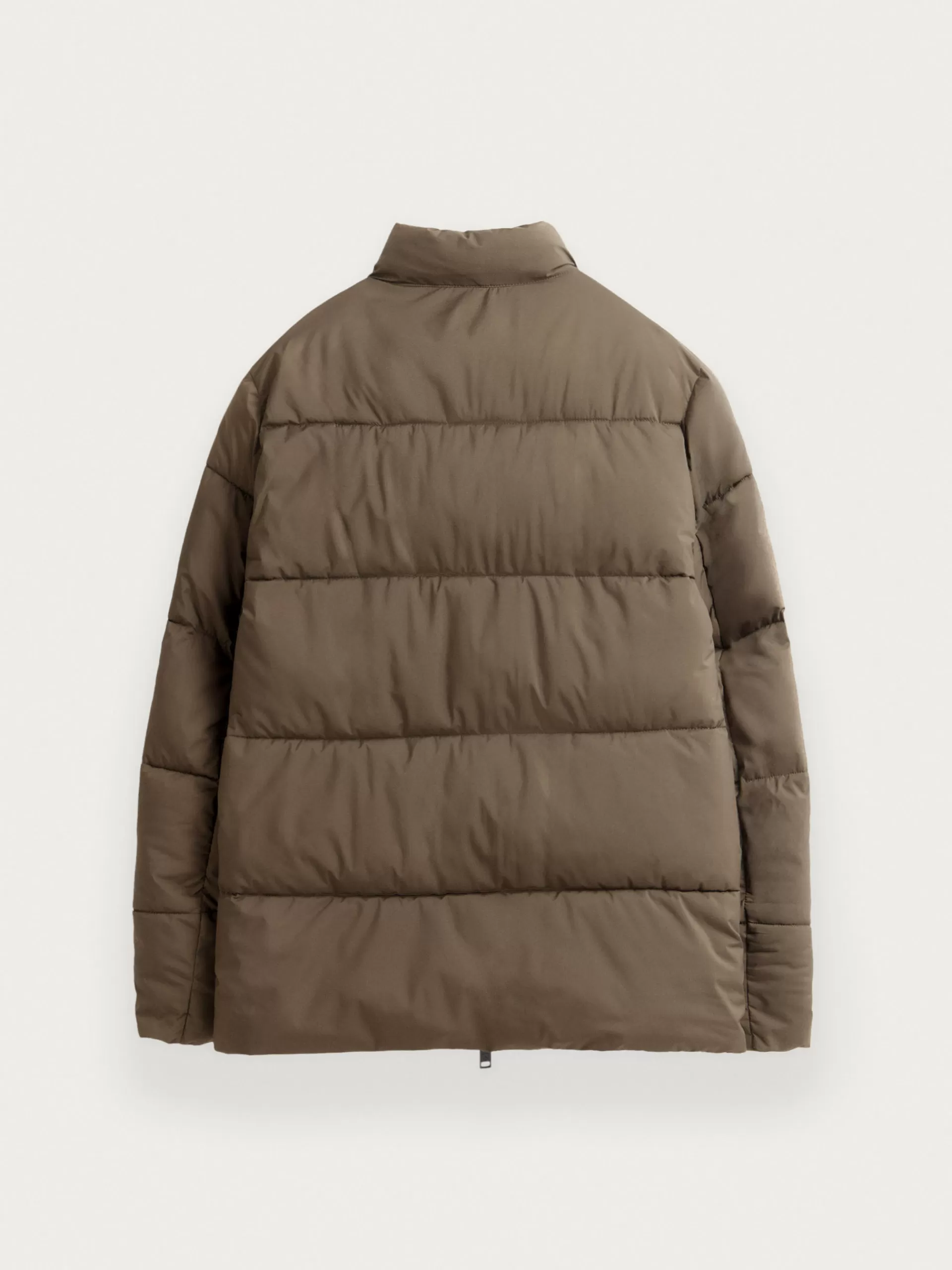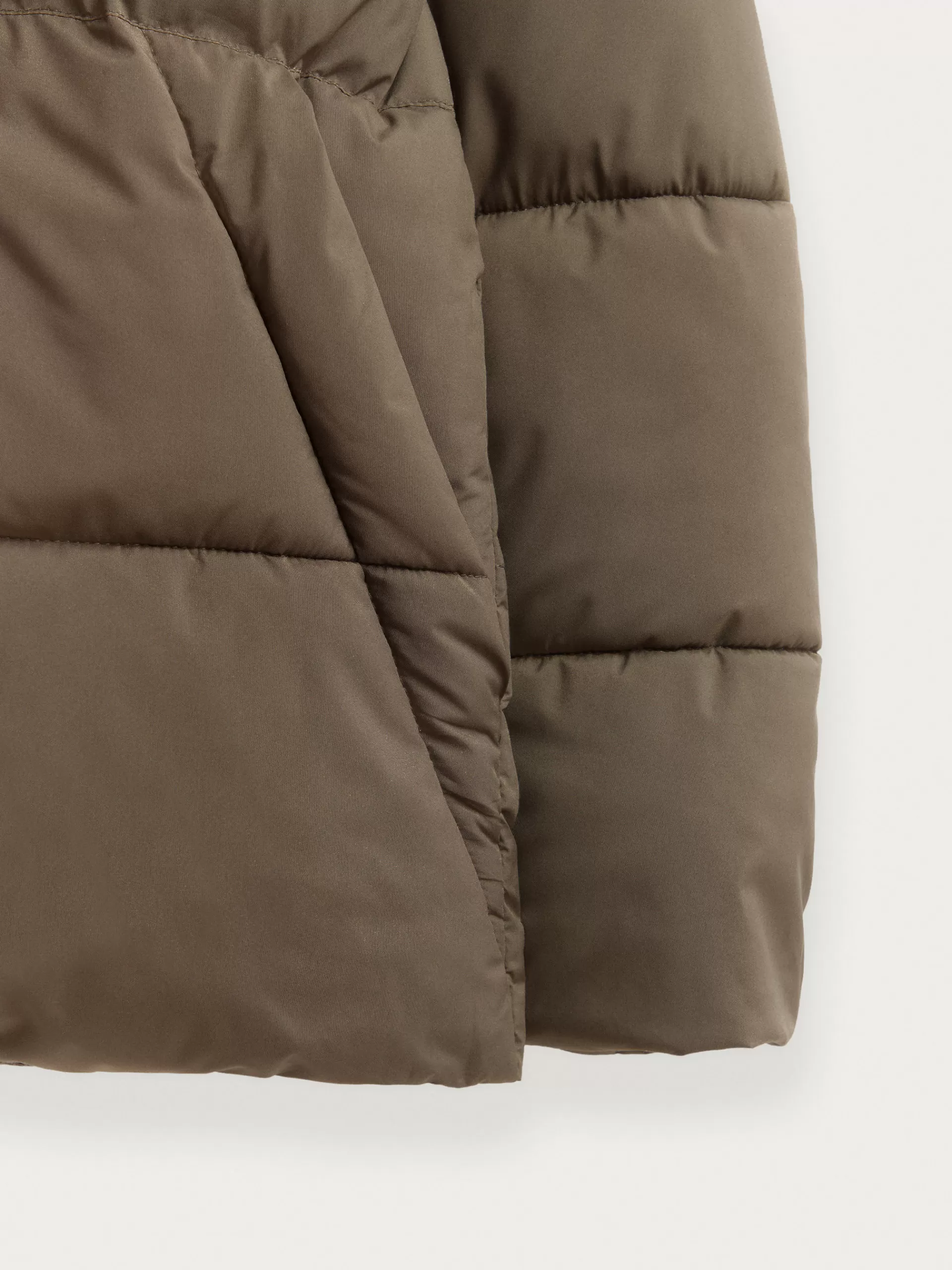 Parka acolchada con cuello de corte regular fit. Cuenta con cierre central mediante doble cremallera, dos bolsillos en l…