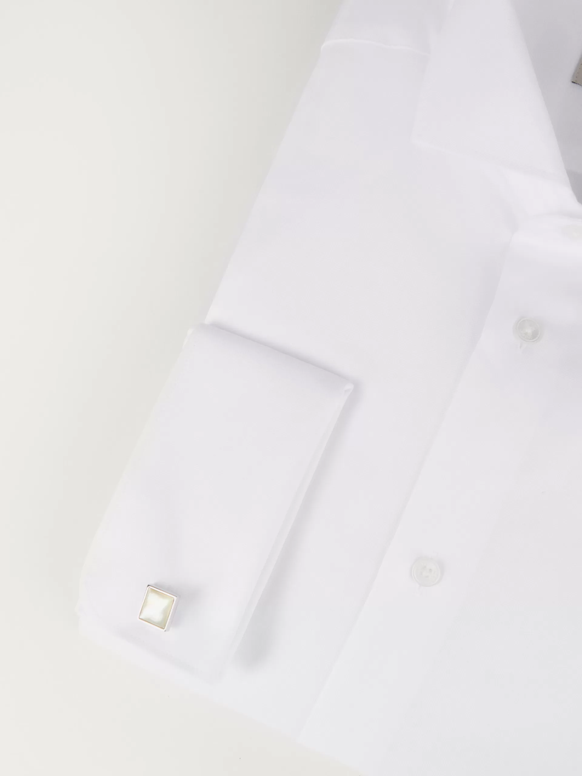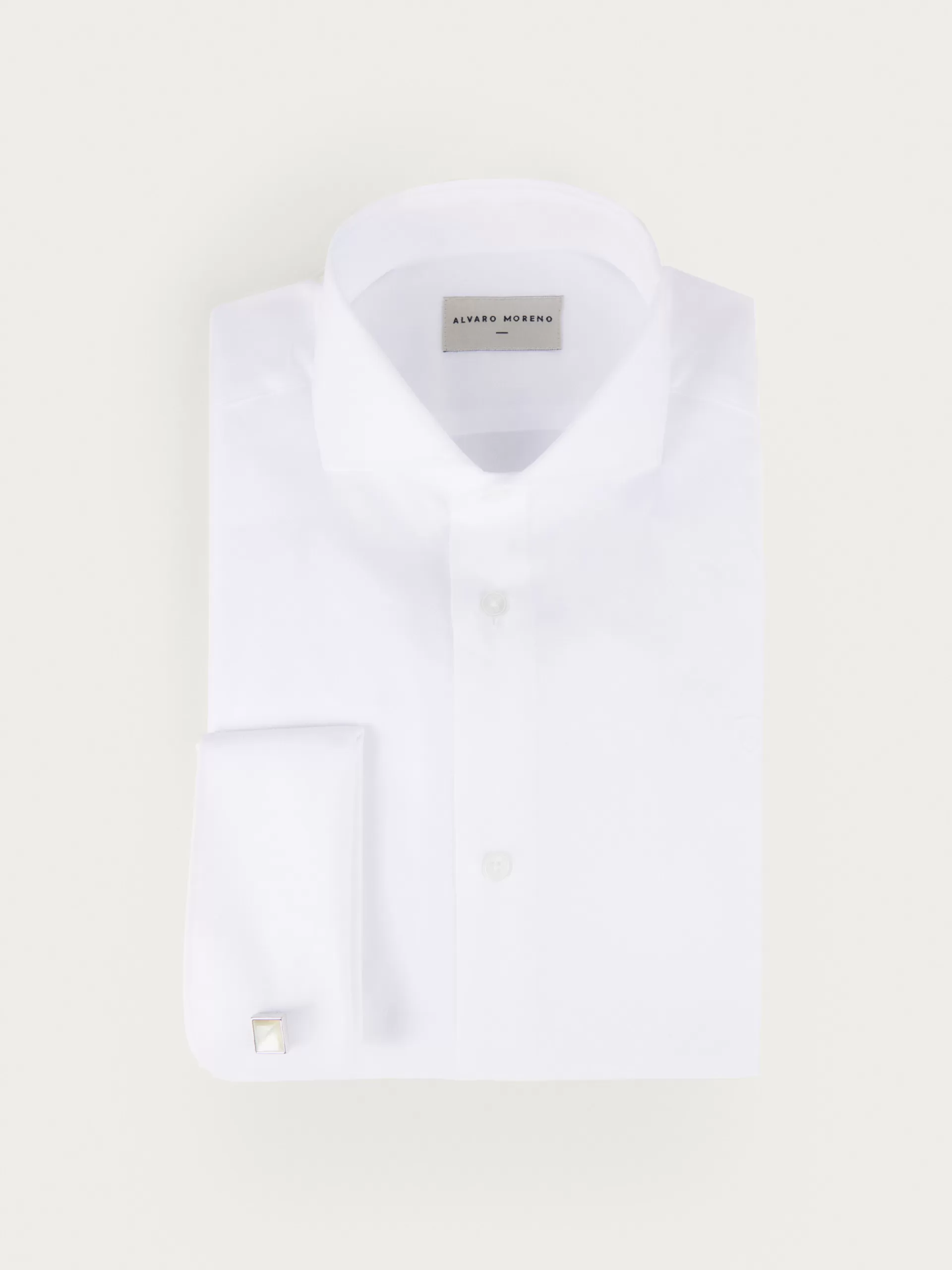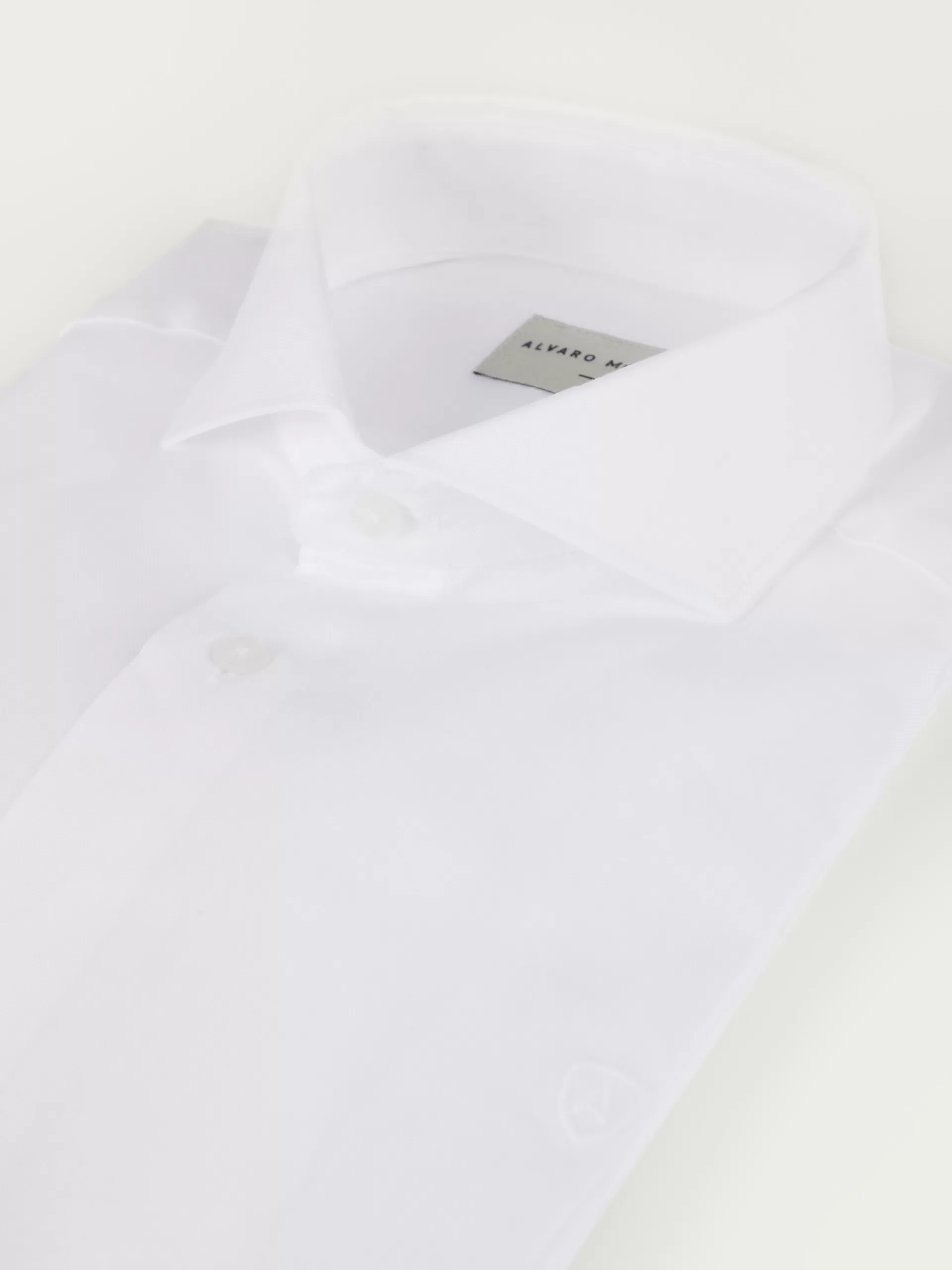 Camisa de vestir de corte slim fit. Cuenta con una ligera estructura en su tejido, cuello italiano y manga larga con puños dobles para gemelos. Logo de la marca grabado al tono en el frontal.