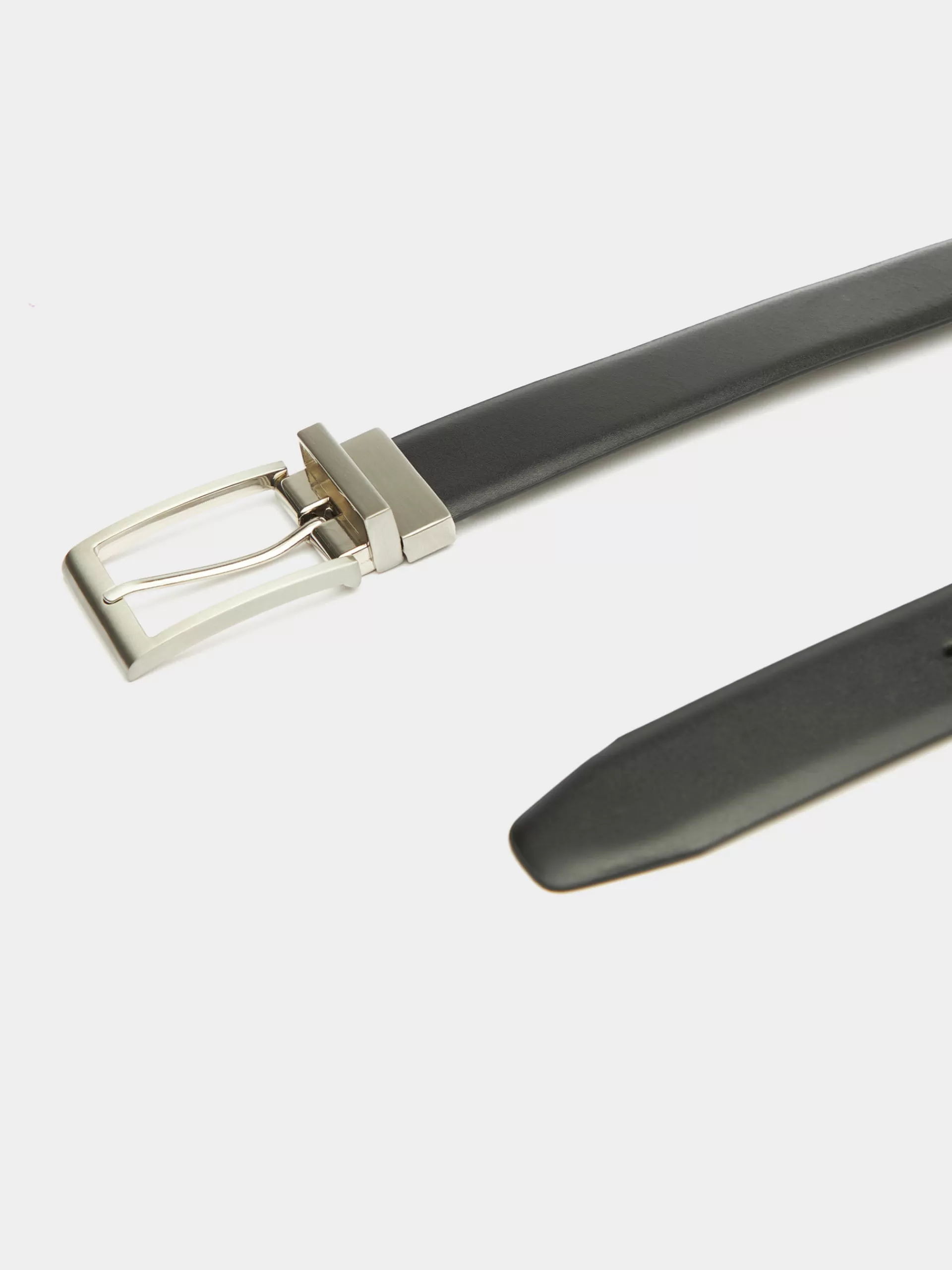 Cinturón liso de diseño reversible en color negro por un lado y marrón por el otro. Confeccionado en cuero, cuenta con cierre mediante hebilla y pasador metálico.
