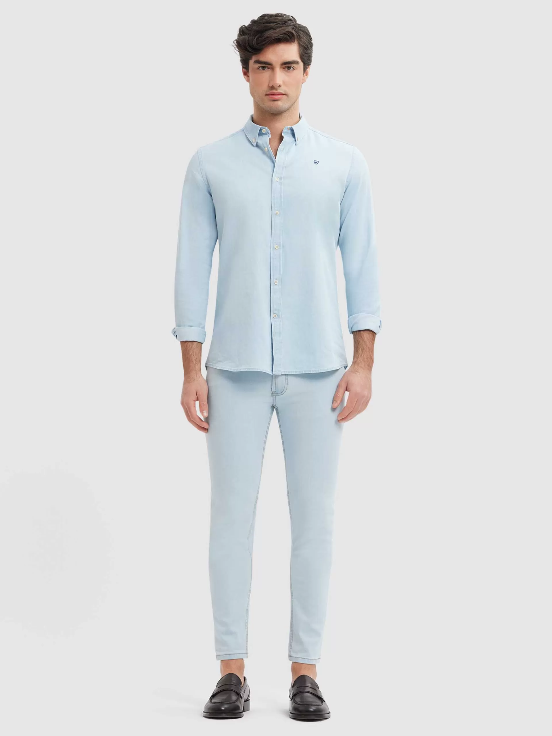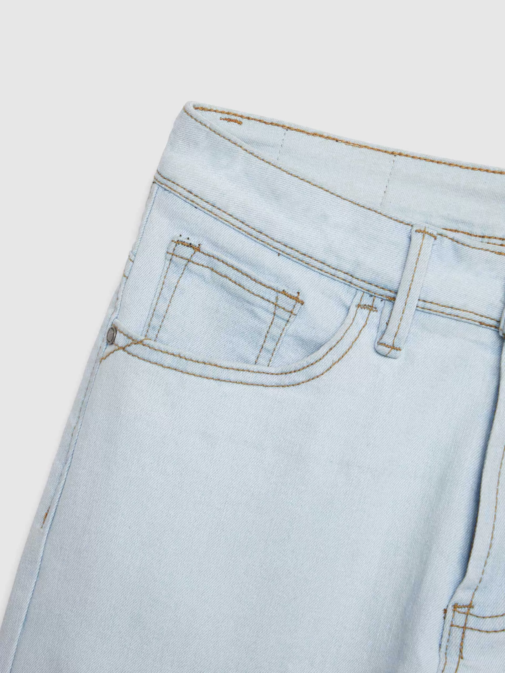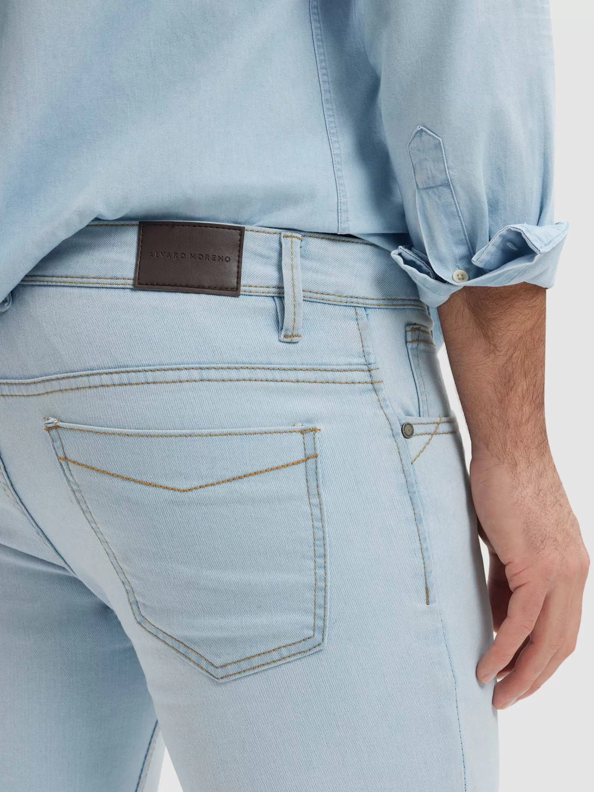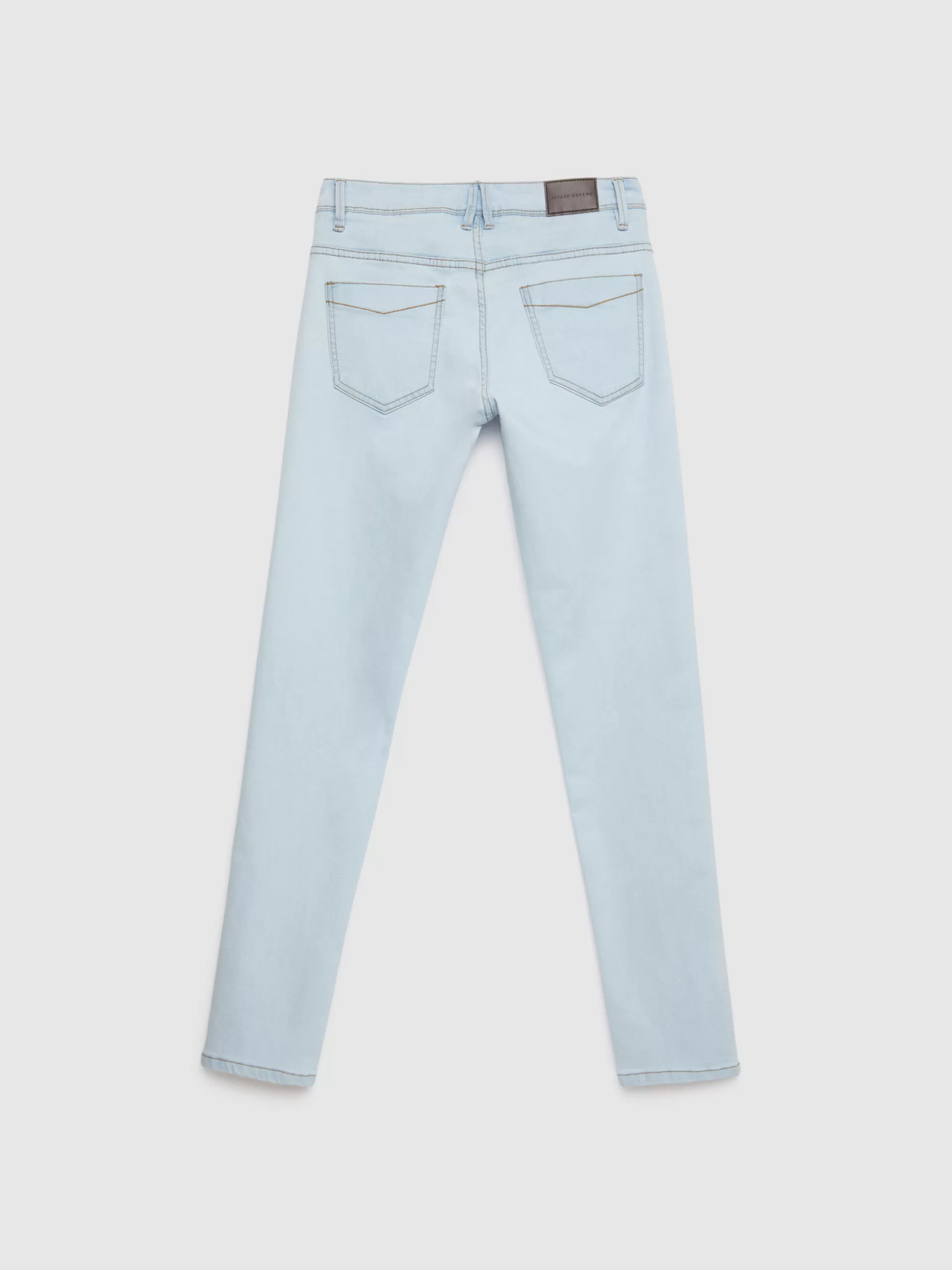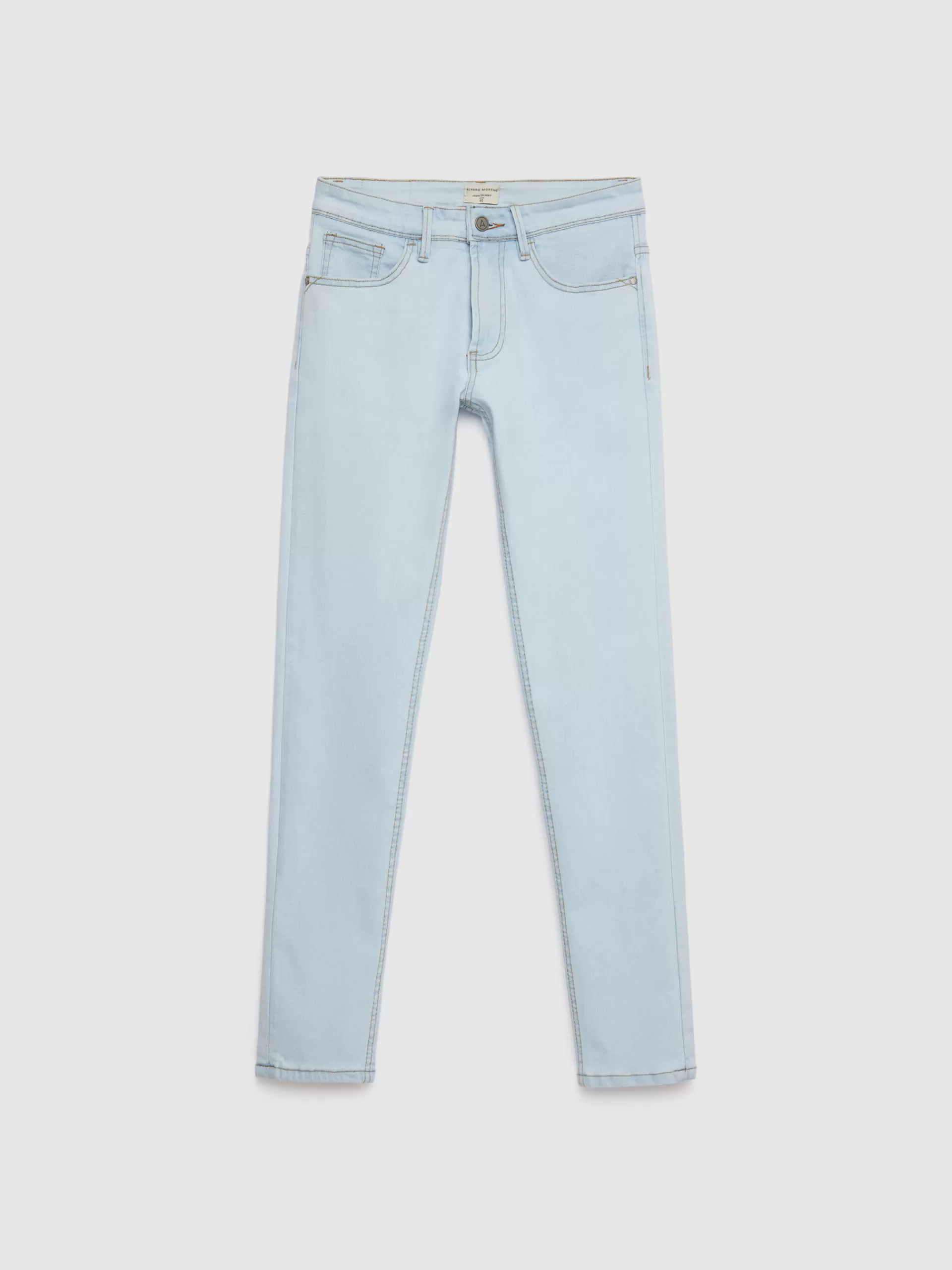 Pantalón denim de corte skinny fit con cinco bolsillos y cierre central mediante botón y cremallera, pespuntes en colo…