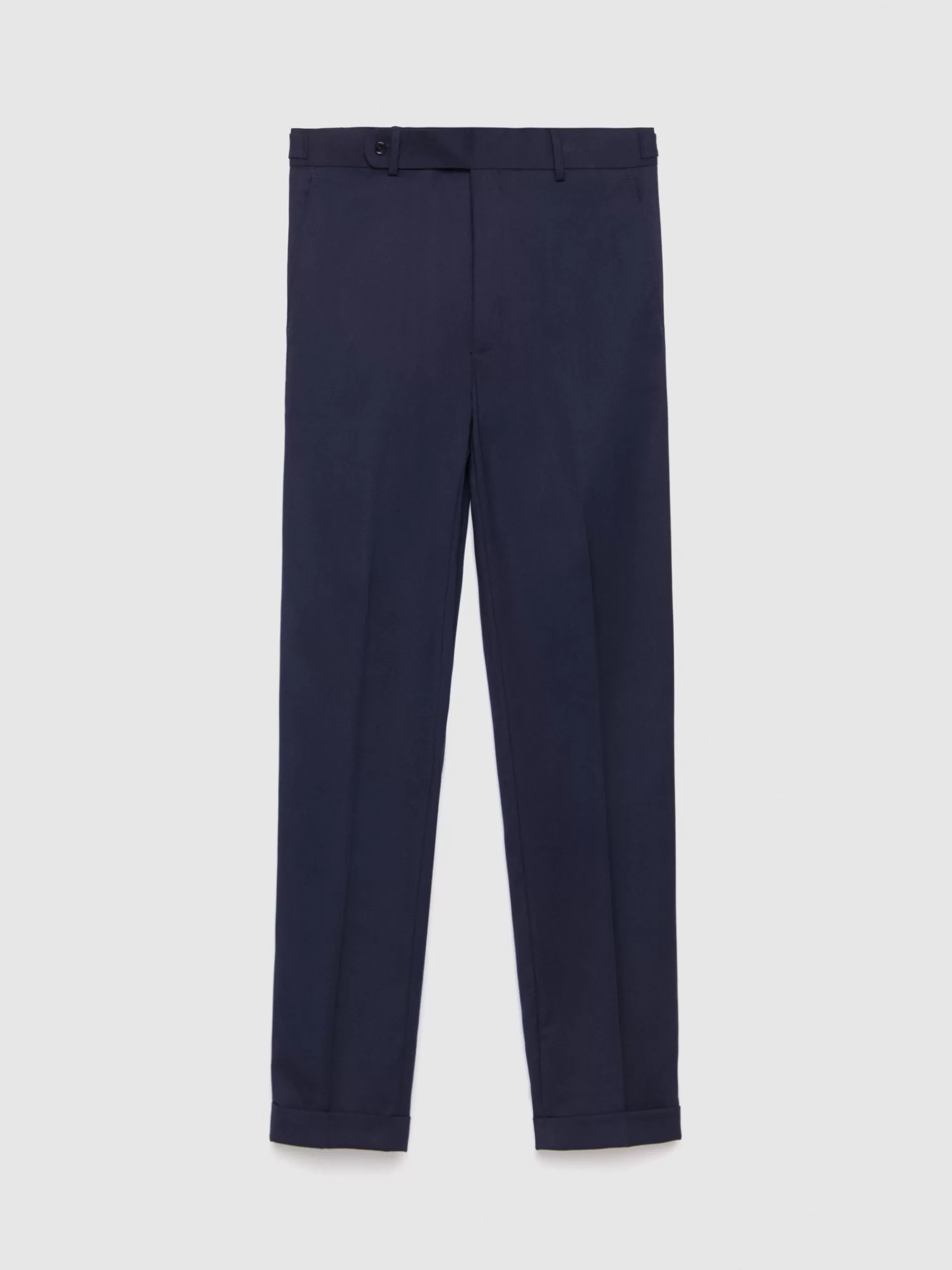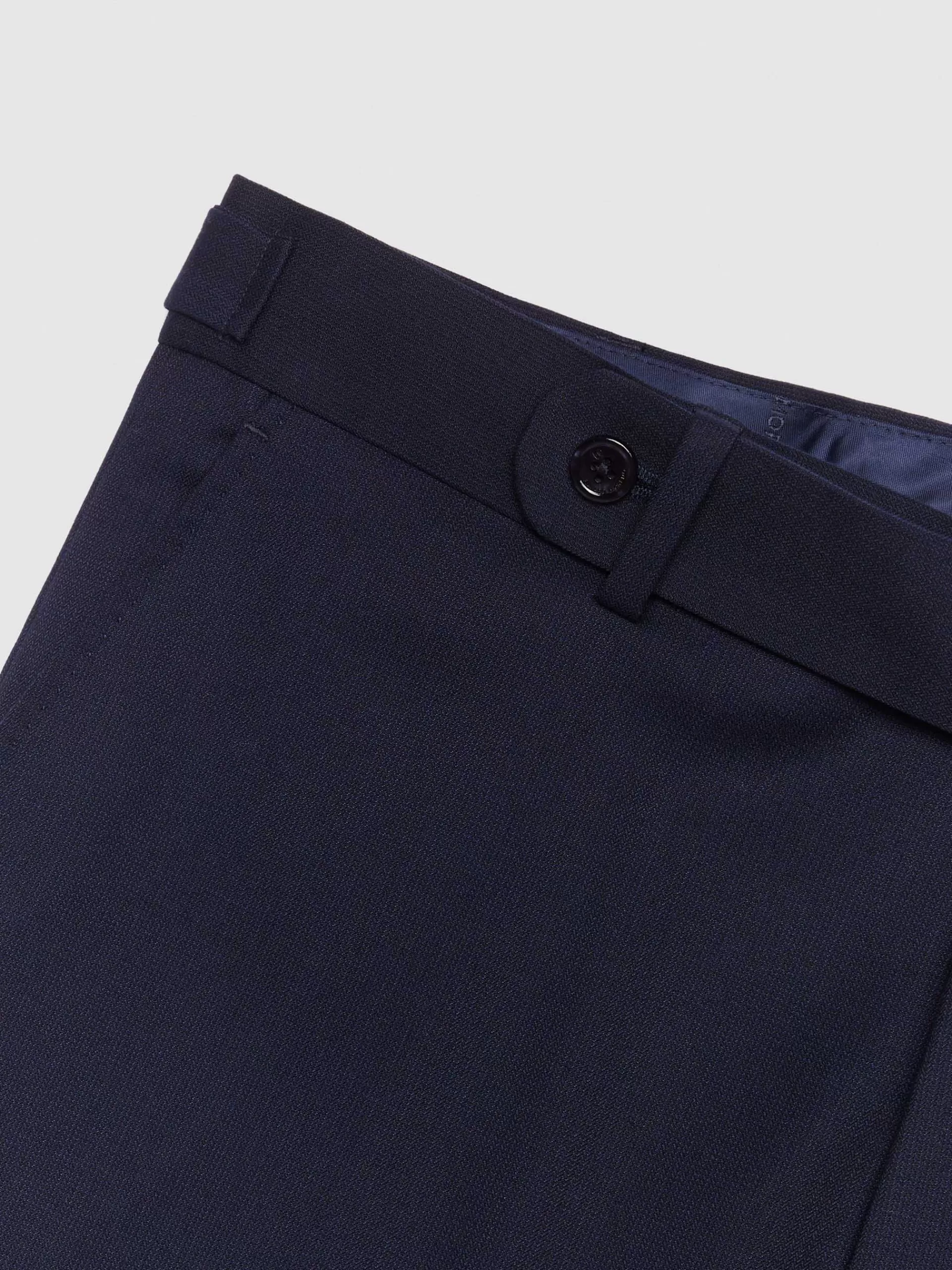 Pantalón de traje con tejido de ojo de perdiz que cuenta con cierre frontal con prolonga de botón desplazado y cremallera, dos bolsillos en el frontal y un bolsillo con cierre de botón en la parte trasera. Bajo con vuelta y detalle ajustable en la cintura. Forrado en su interior.