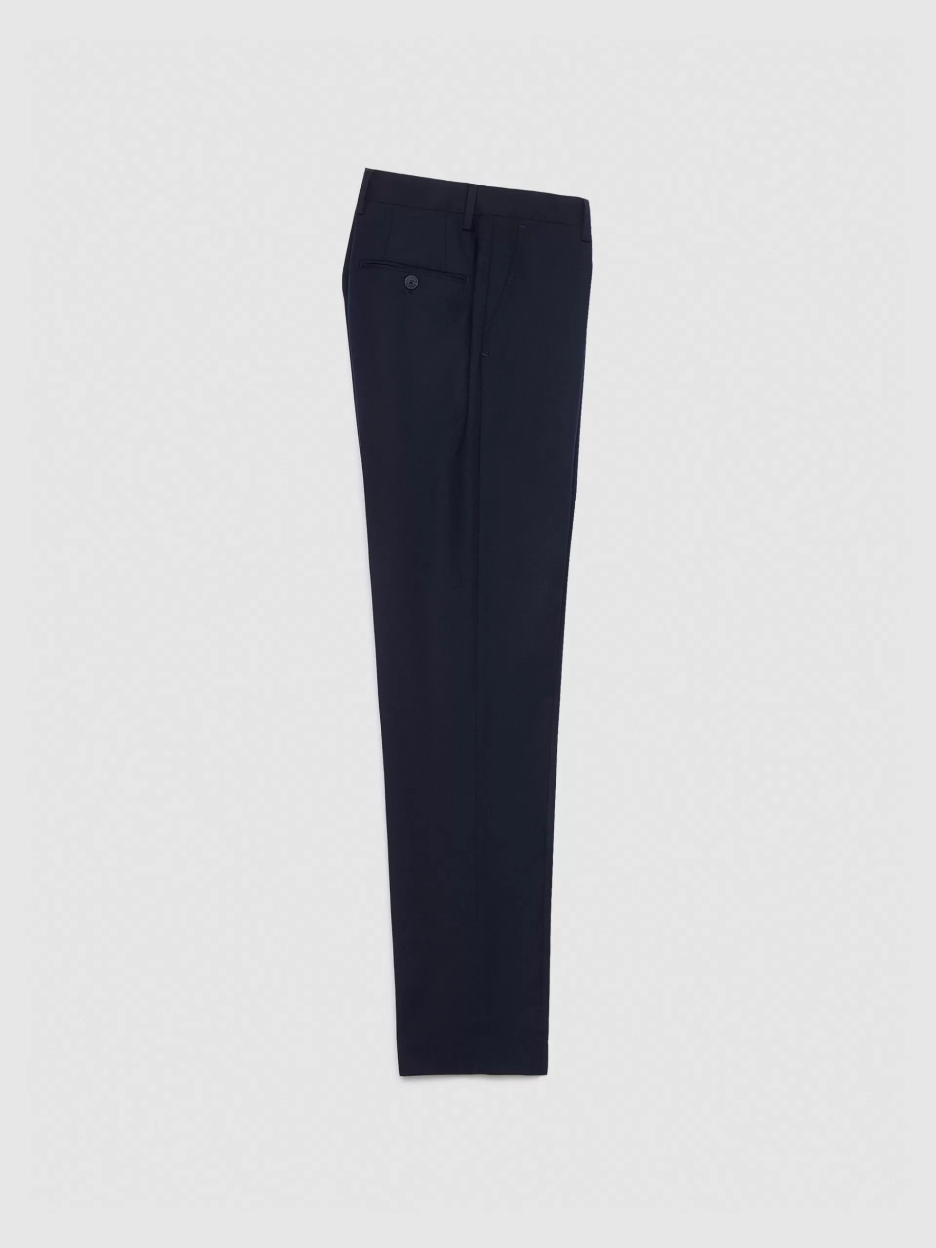 Pantalón de traje que cuenta con cierre frontal de cremallera y botones, dos bolsillos abiertos en la parte delantera y dos bolsillos traseros con cierre mediante botón. Forrado en su interior.