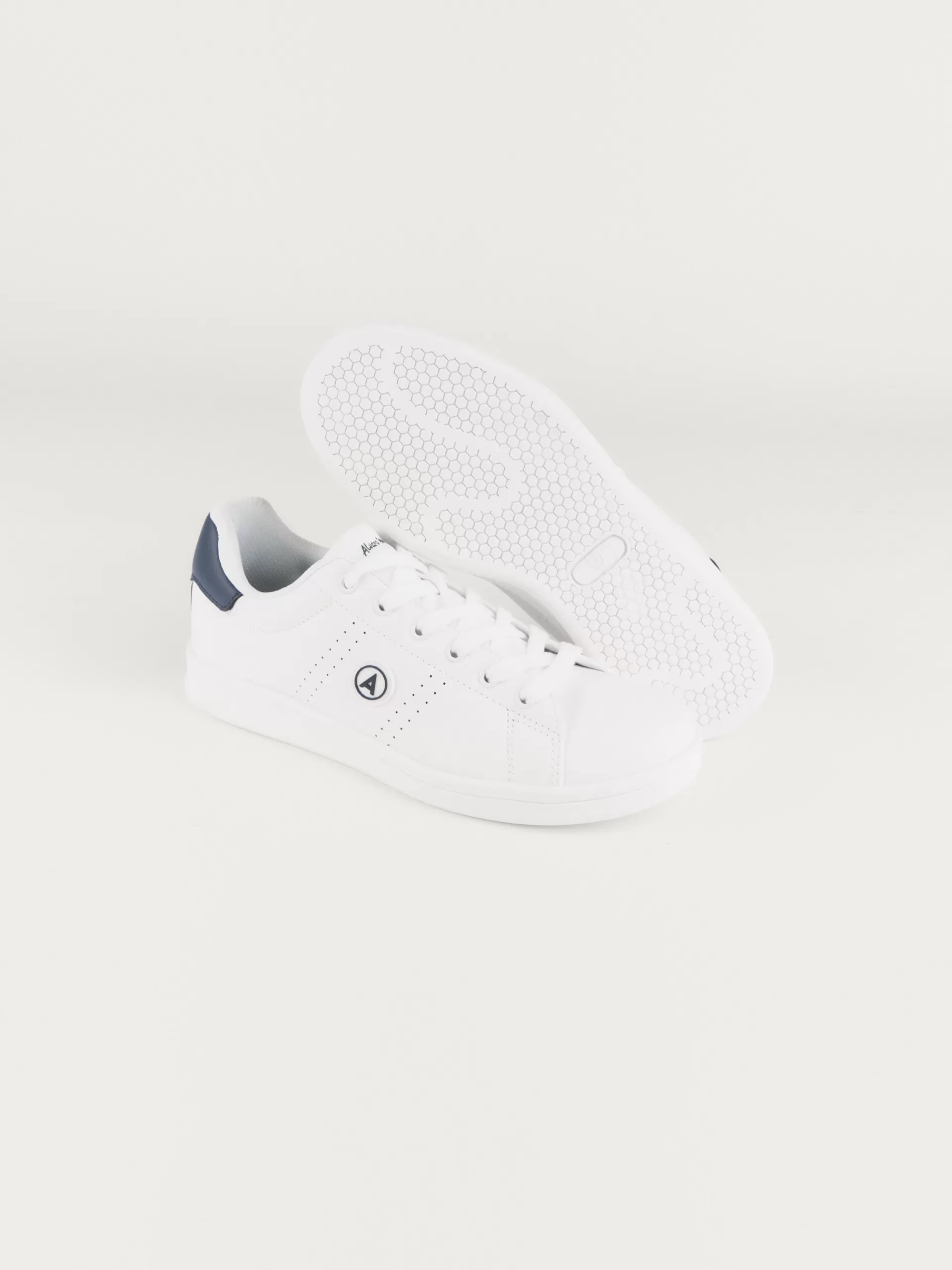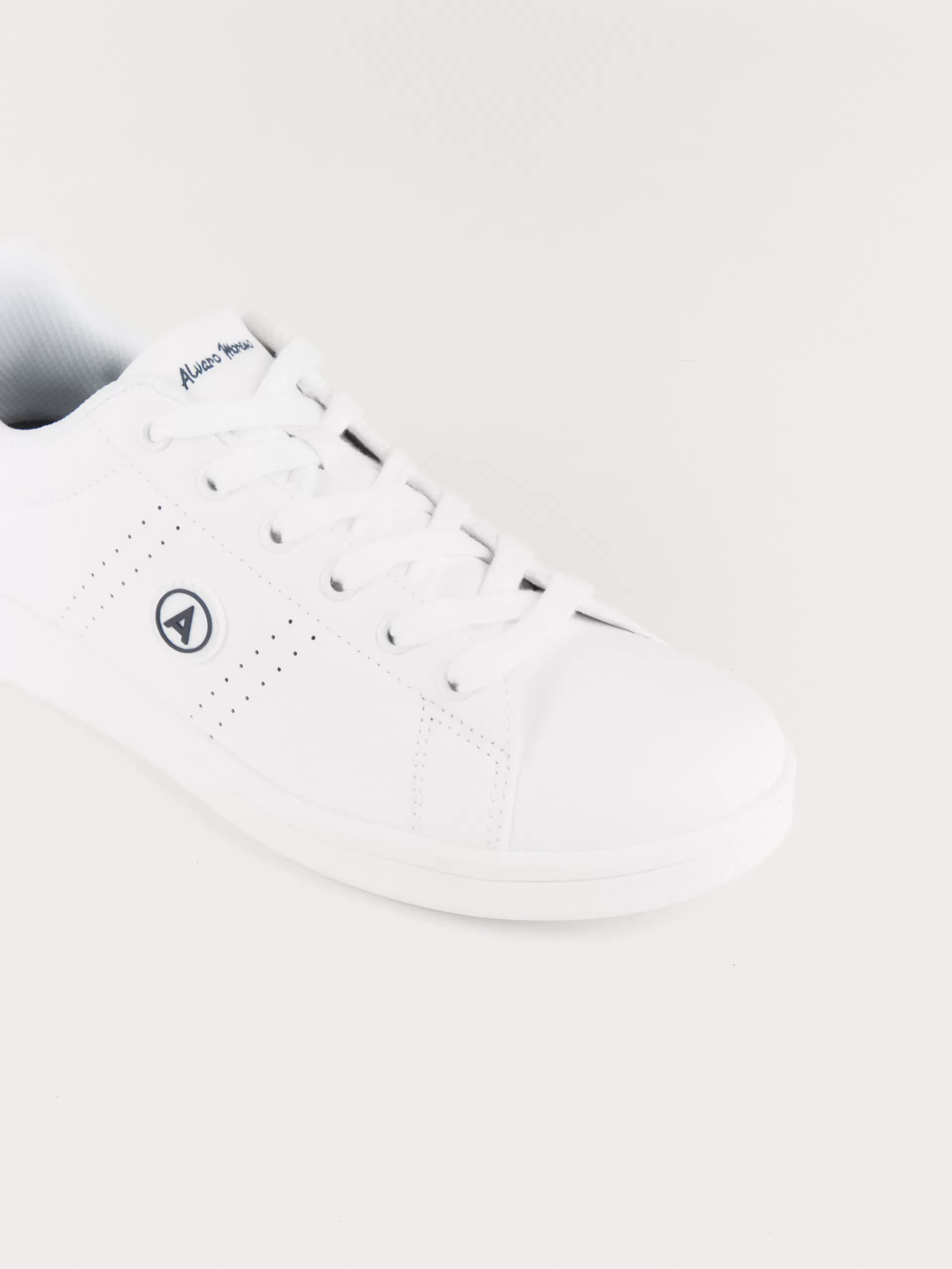 Sneakers deportivas con color blancas con detalle a contraste en el talón. Logo grabado en el lateral, lengüeta y talón. Cordones de hasta seis pasados, puntera redondeada y suela de goma.