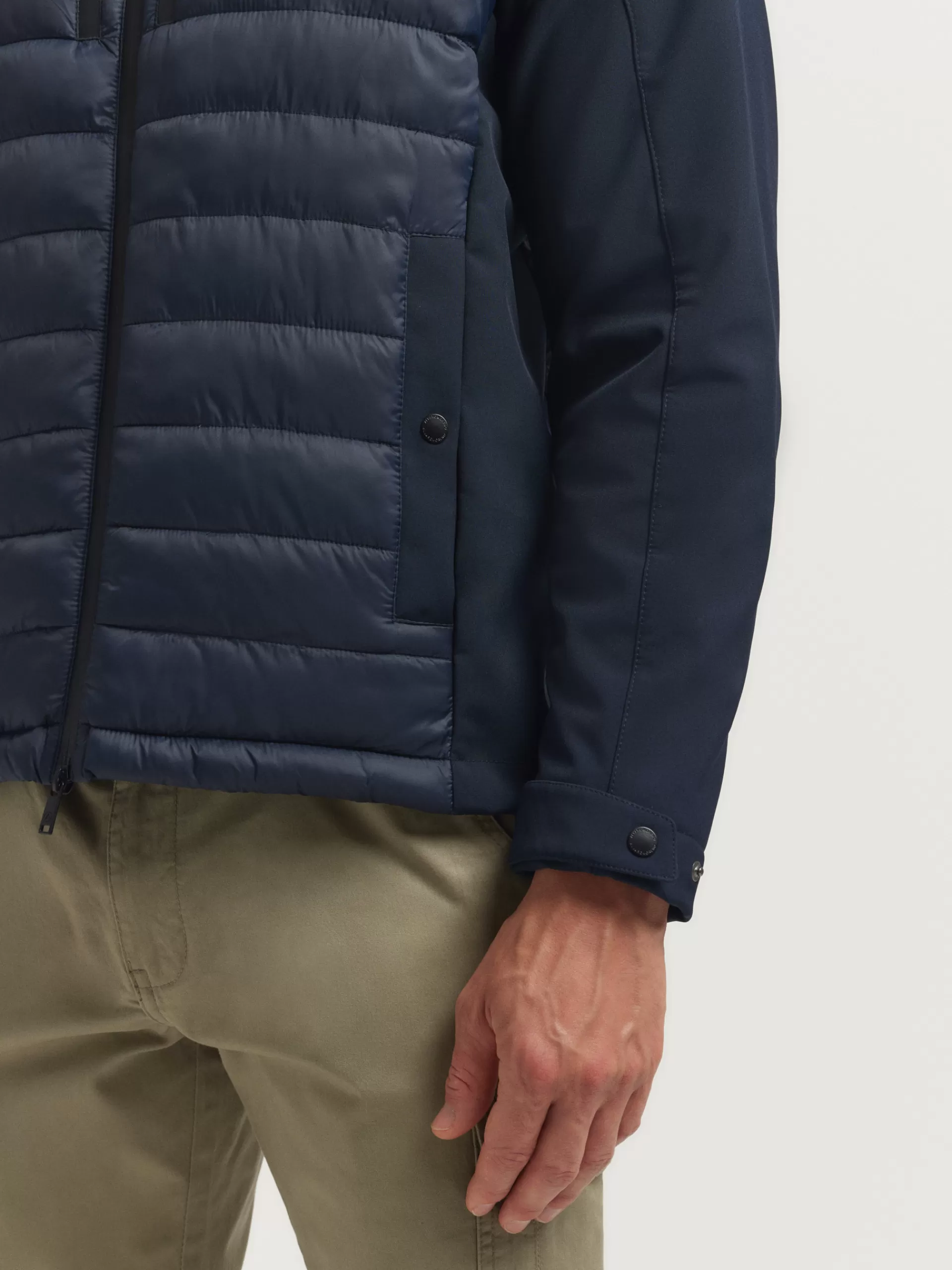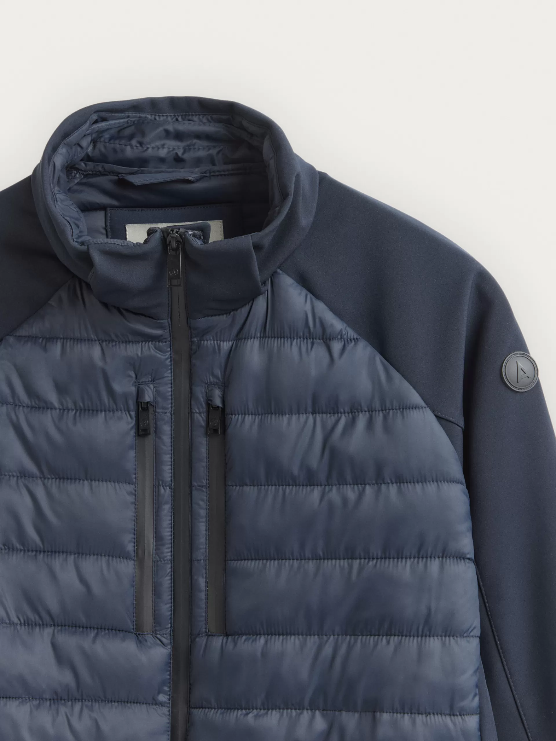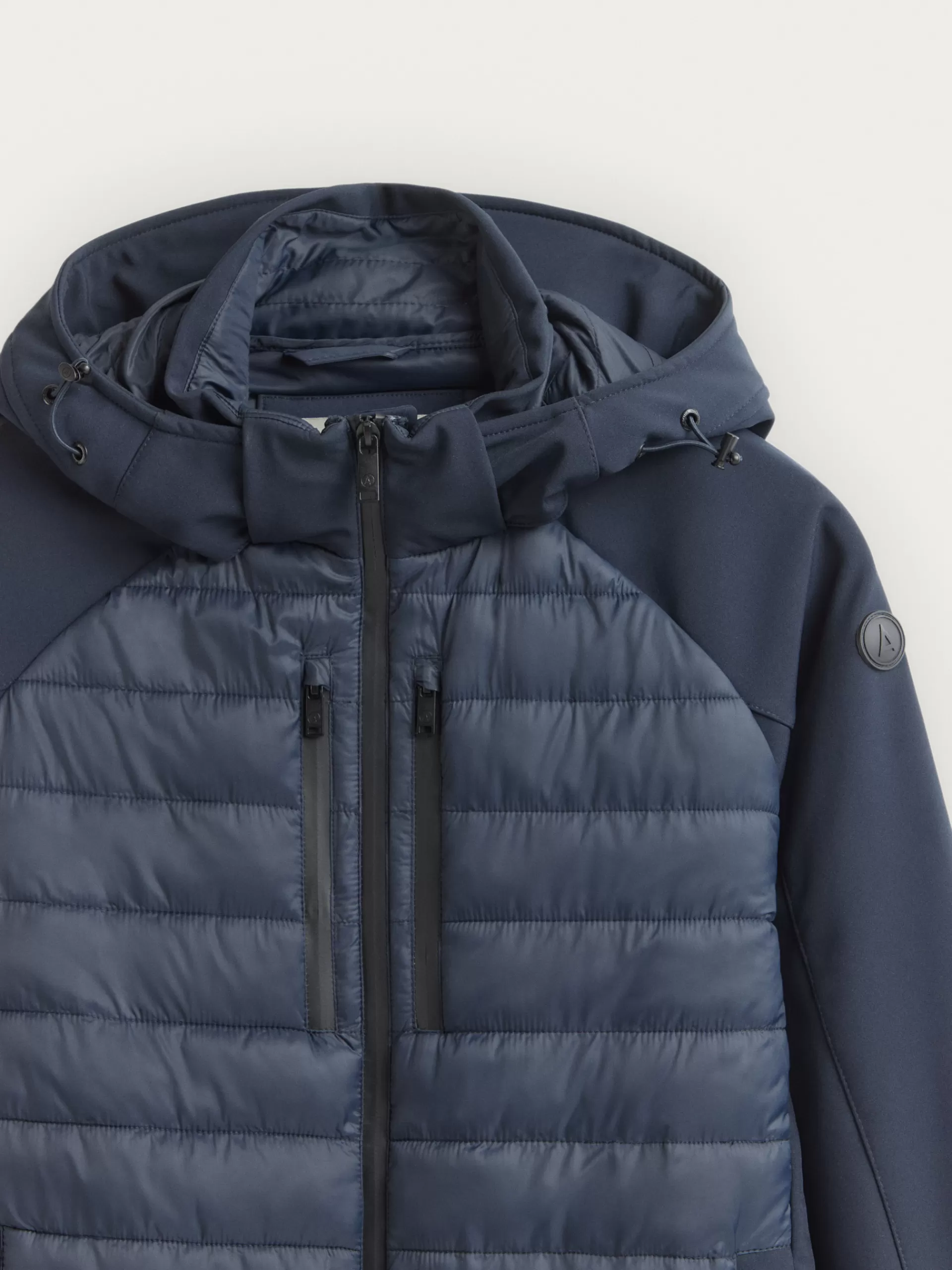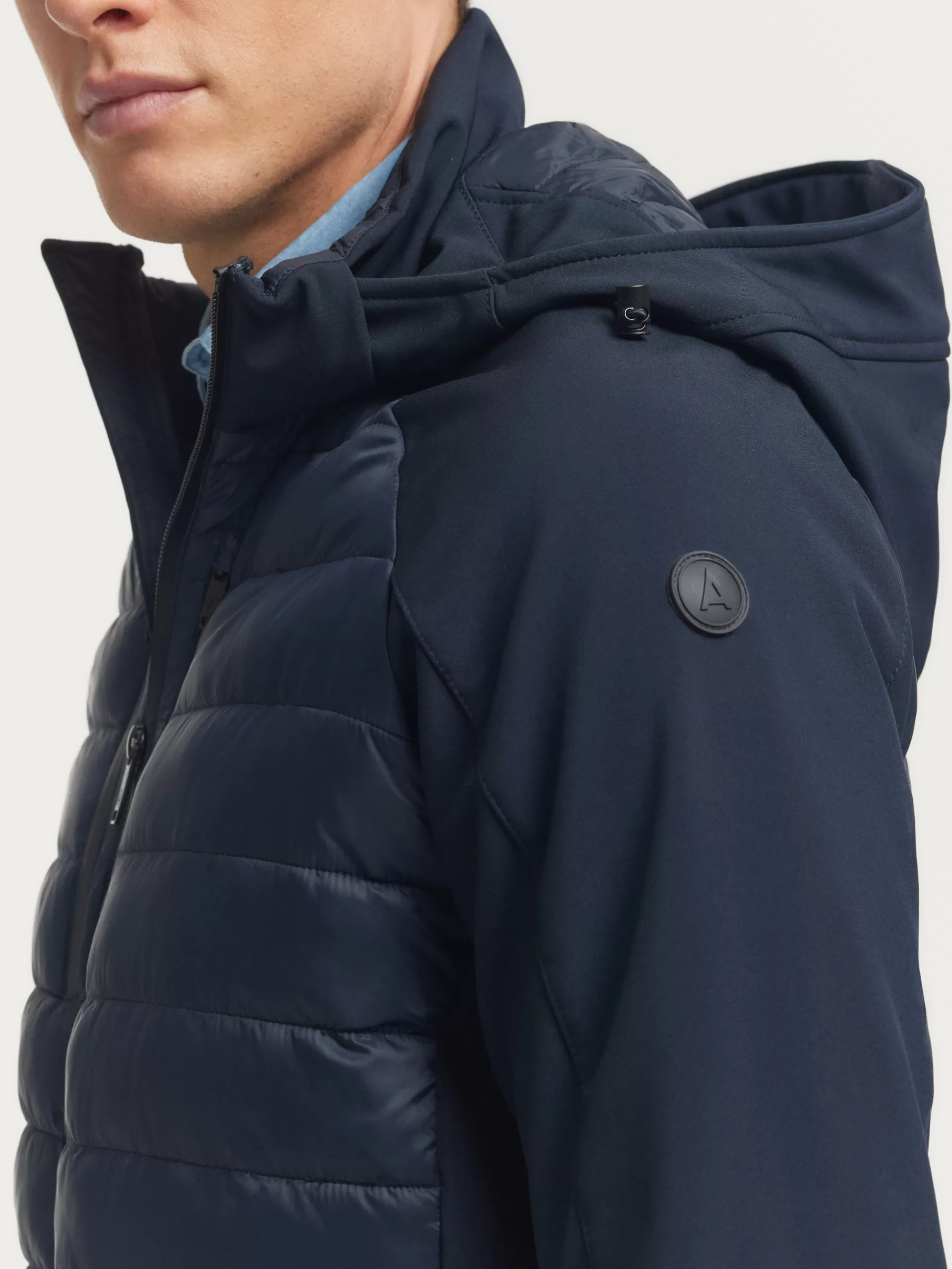 Cazadora acolchada con gorro desmontable, cierre central mediante doble cremallera, manga larga con puños ajustables y dos bolsillos a la altura del pecho y dos bolsillos en la cintura. Detalle personalizado en una de las mangas. Cremalleras termoselladas. Interior con bolsillo y corte regular fit.