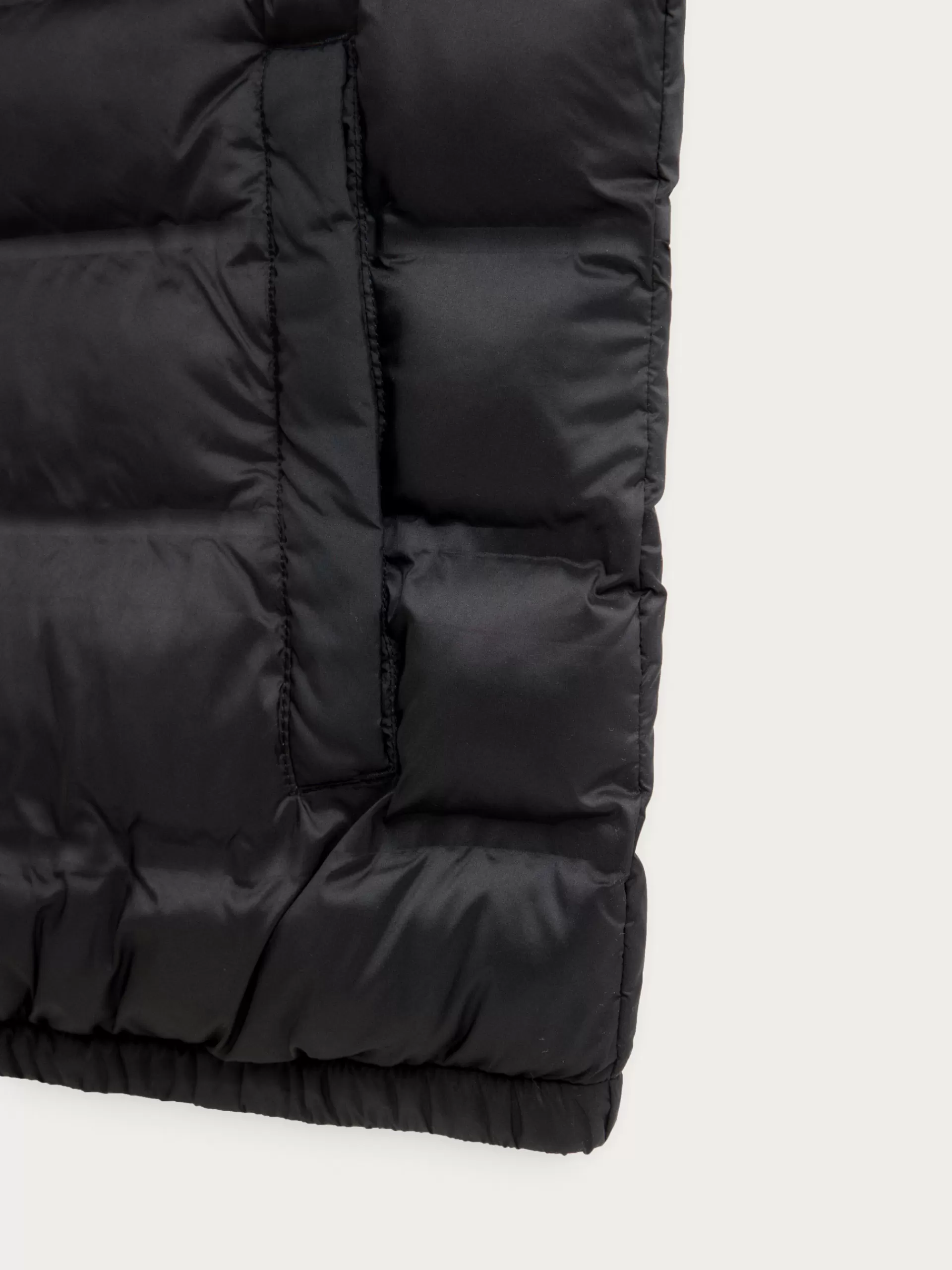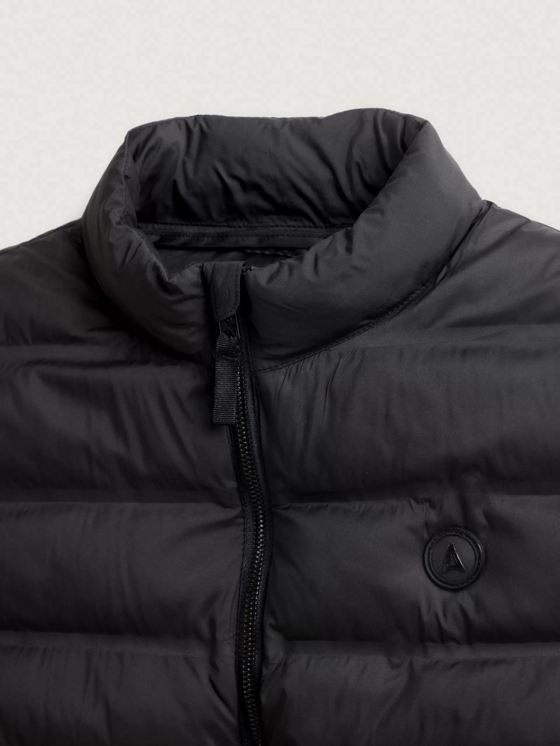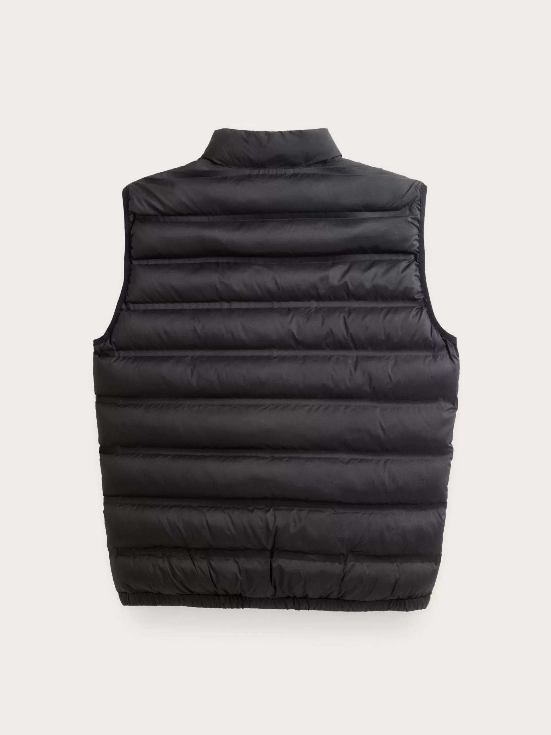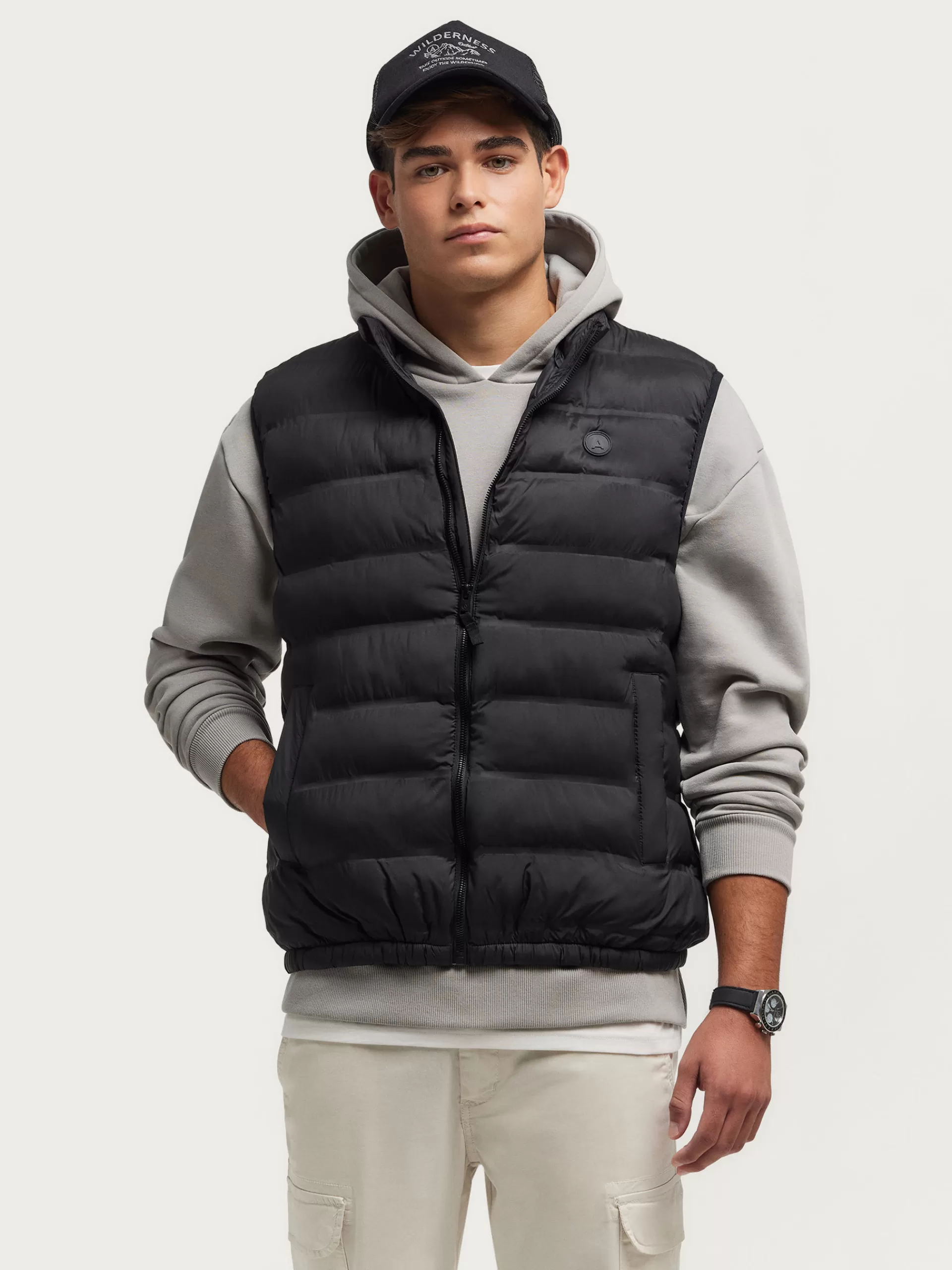 Chaleco acolchado con cuello subido y cierre central mediante cremallera, dos bolsillos a la altura de la cintura y logo de la marca grabado en el pecho al tono. Elástico en la sisa y cintura. Forro interior a contraste con bolsillos.