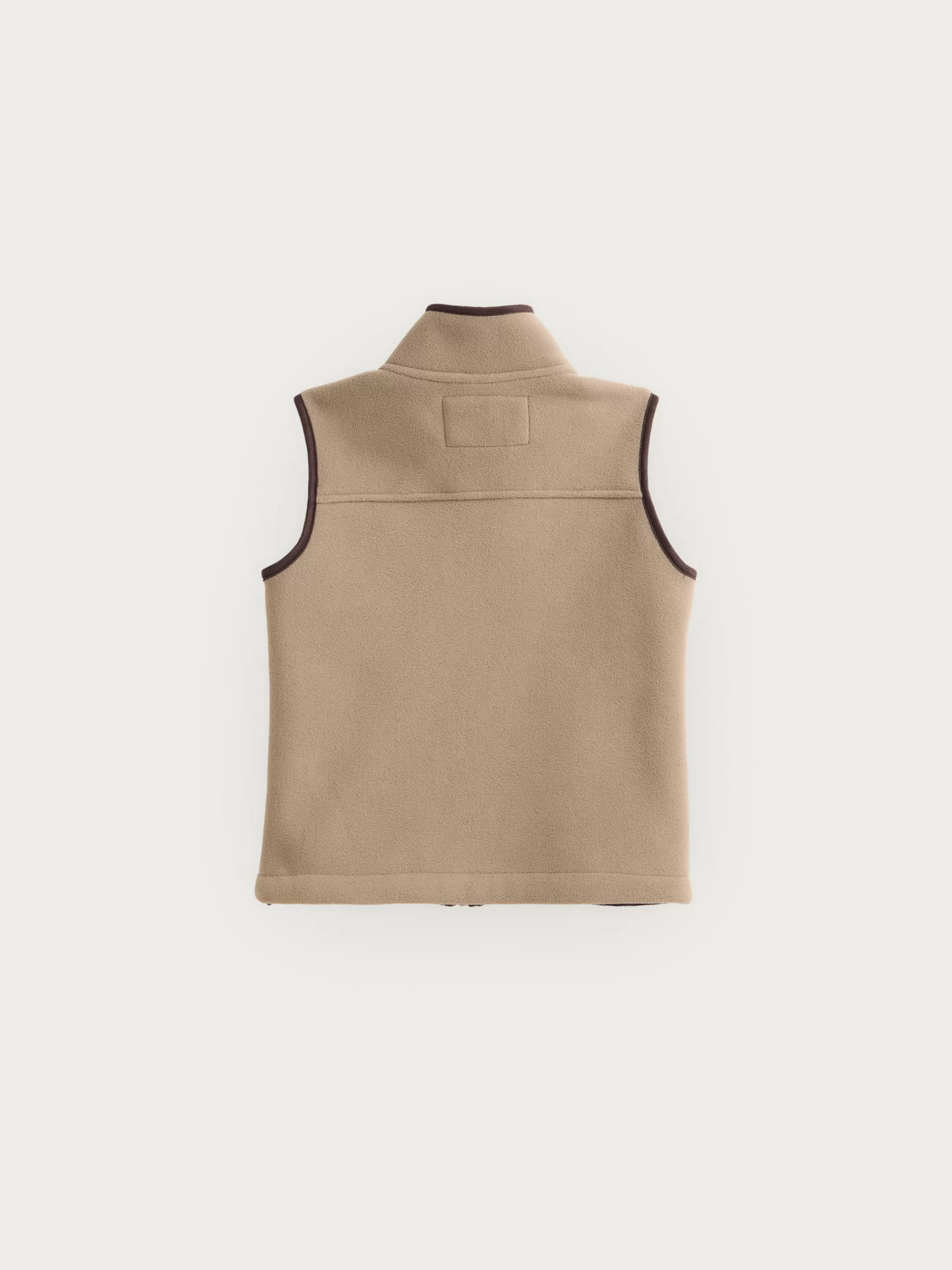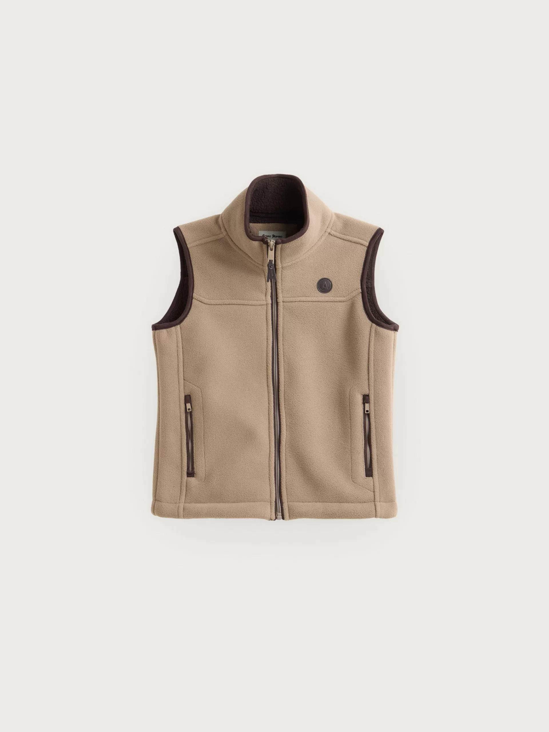 Chaleco confeccionado en tejido avivado en antelina en su exterior y forrado en su interior en borreguillo. Cuenta con cierre central mediante cremallera personalizada, dos bolsillos en su exterior y logo grabado en su frontal. Corte regular fit.