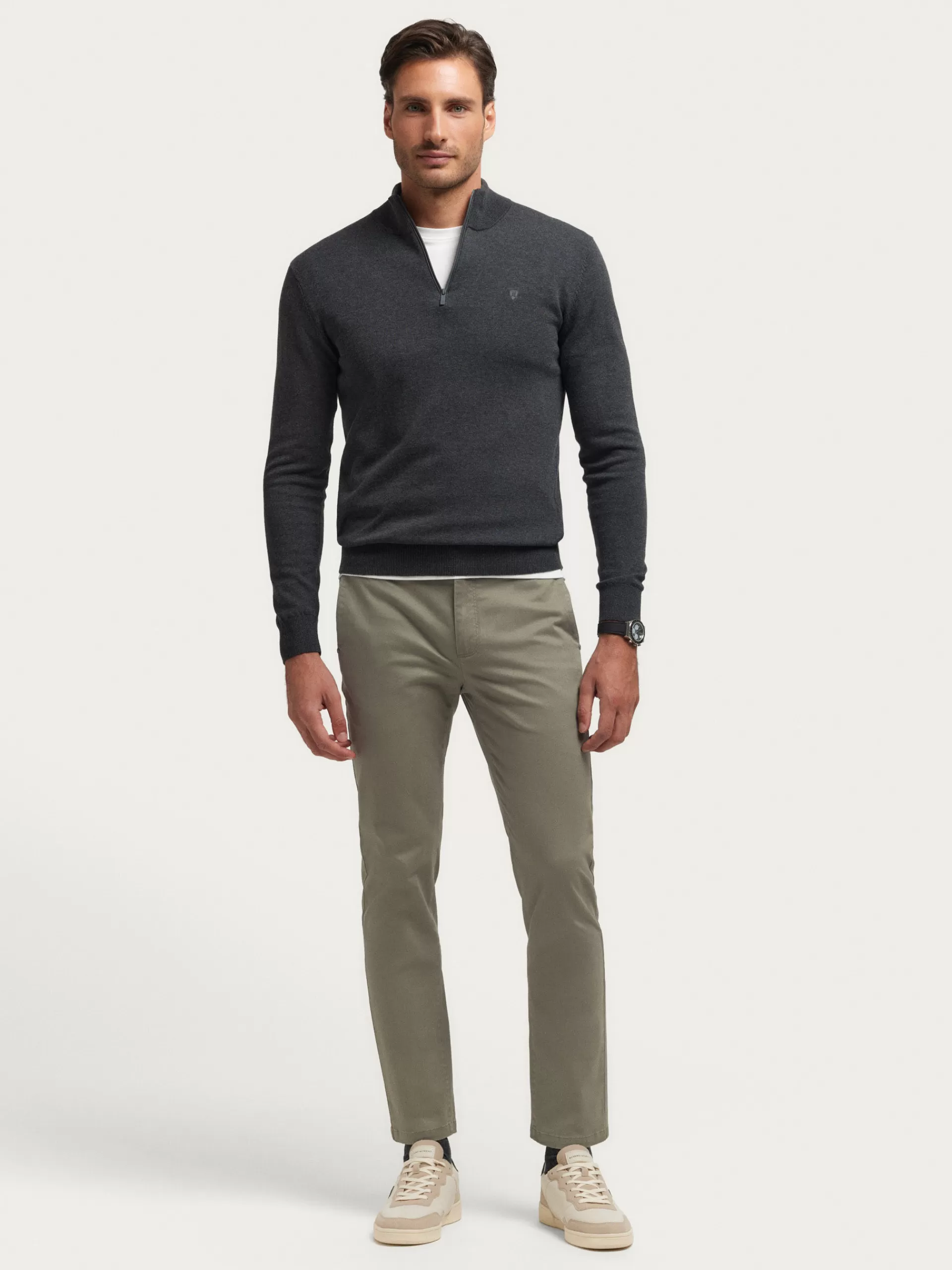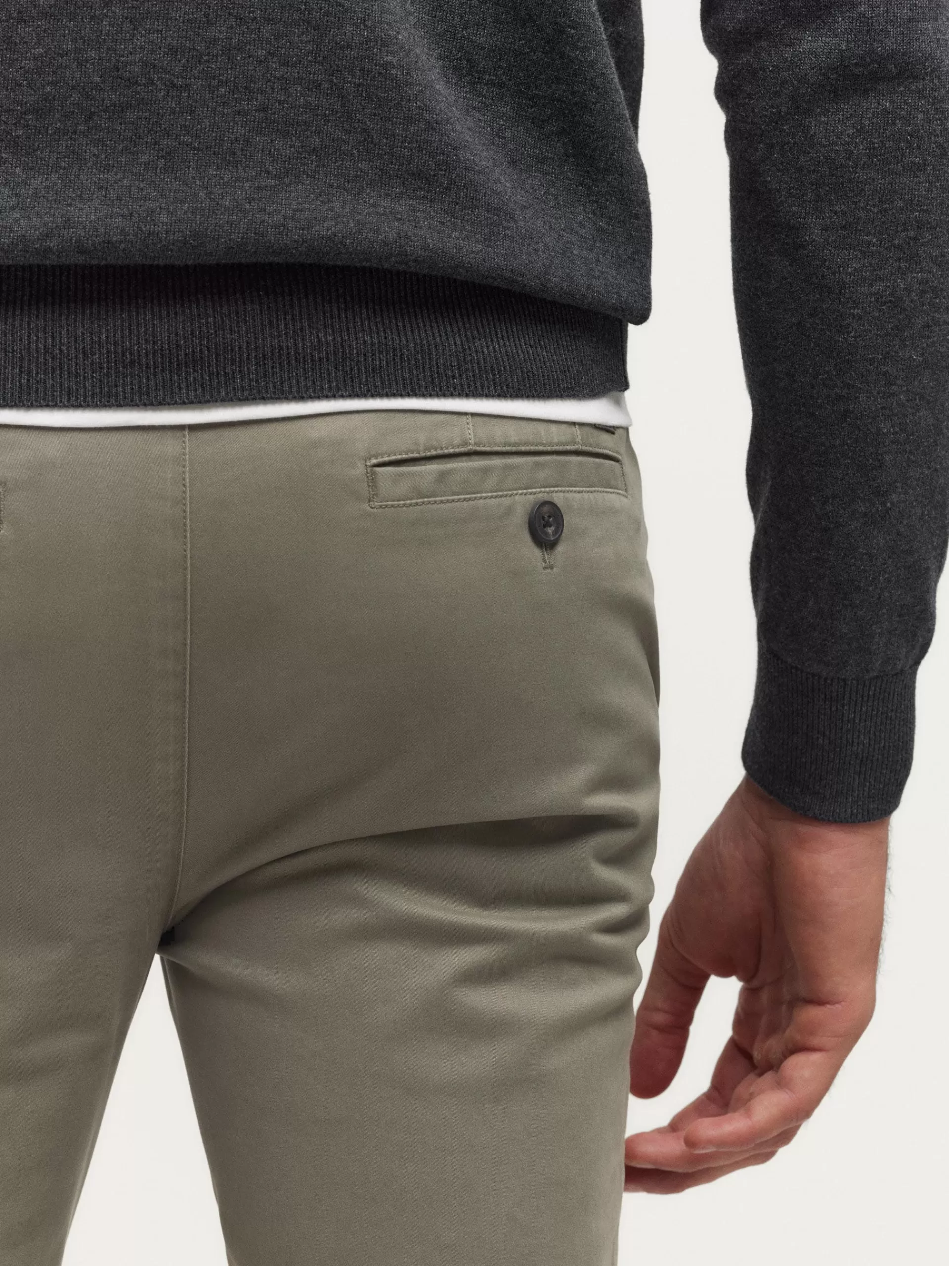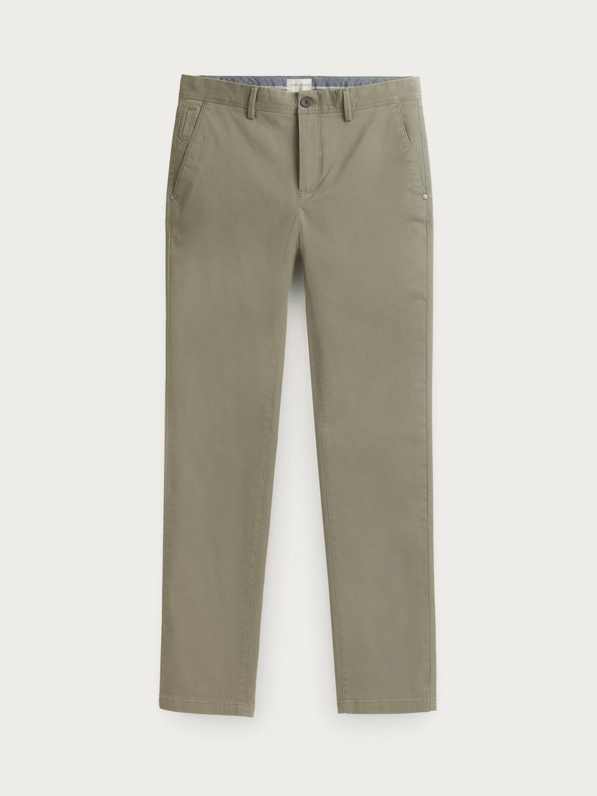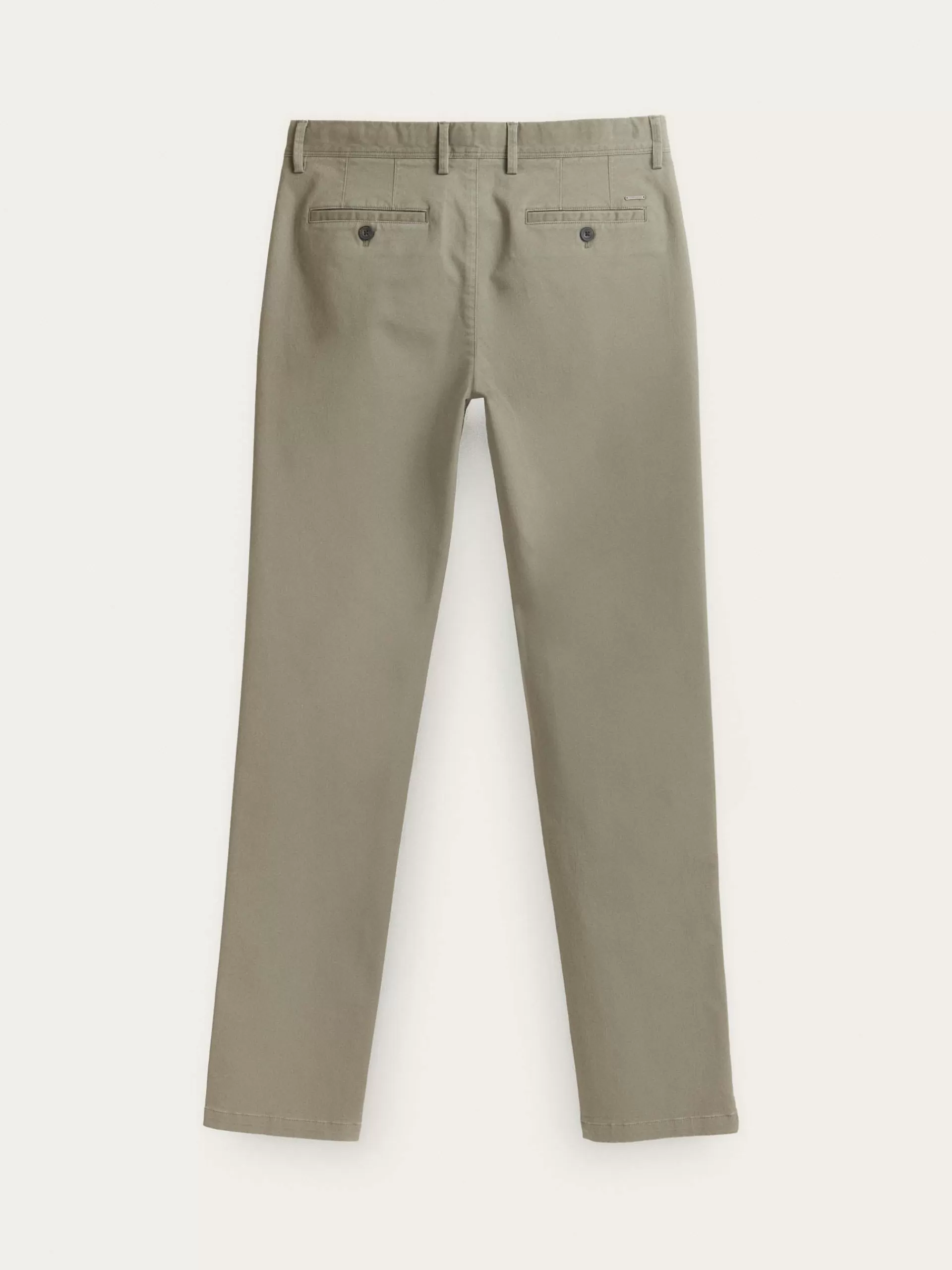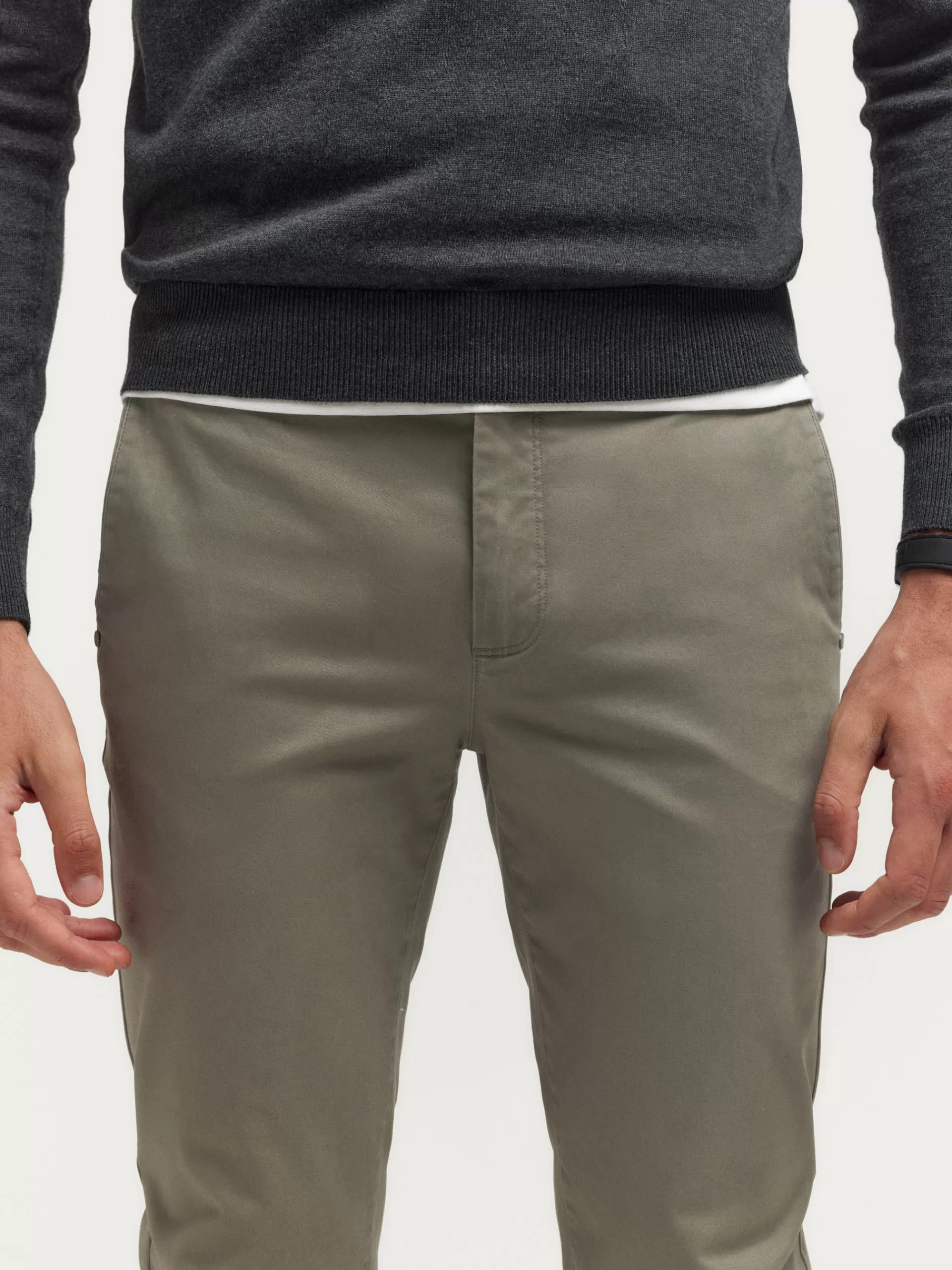 Pantalón estilo chino con cierre central de botón y cremallera, bolsillos tipo chino y detalle personalizado sobre uno de los bolsillos. Corte slim fit.