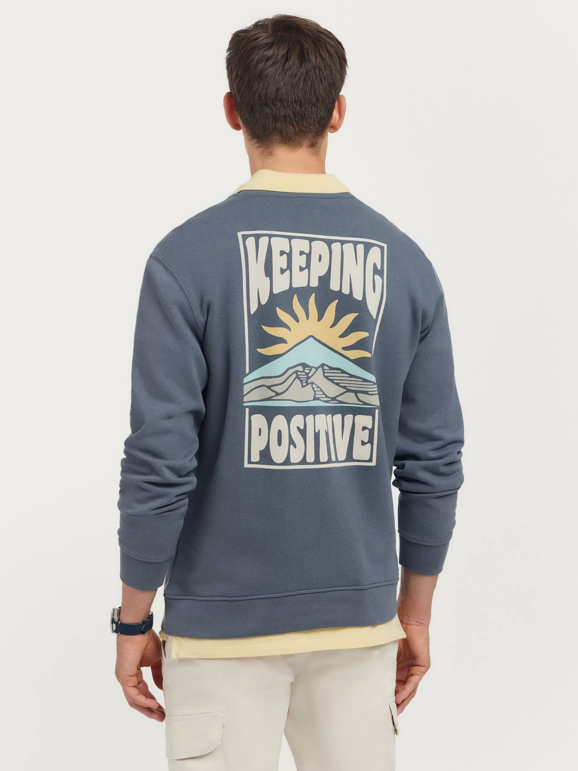 Sudadera con estampado personalizado en la parte trasera y logo de la marca grabado en el frontal a contraste. Cuello redondo, manga larga y puños y bajo en acabado elástico. Corte regular fit.