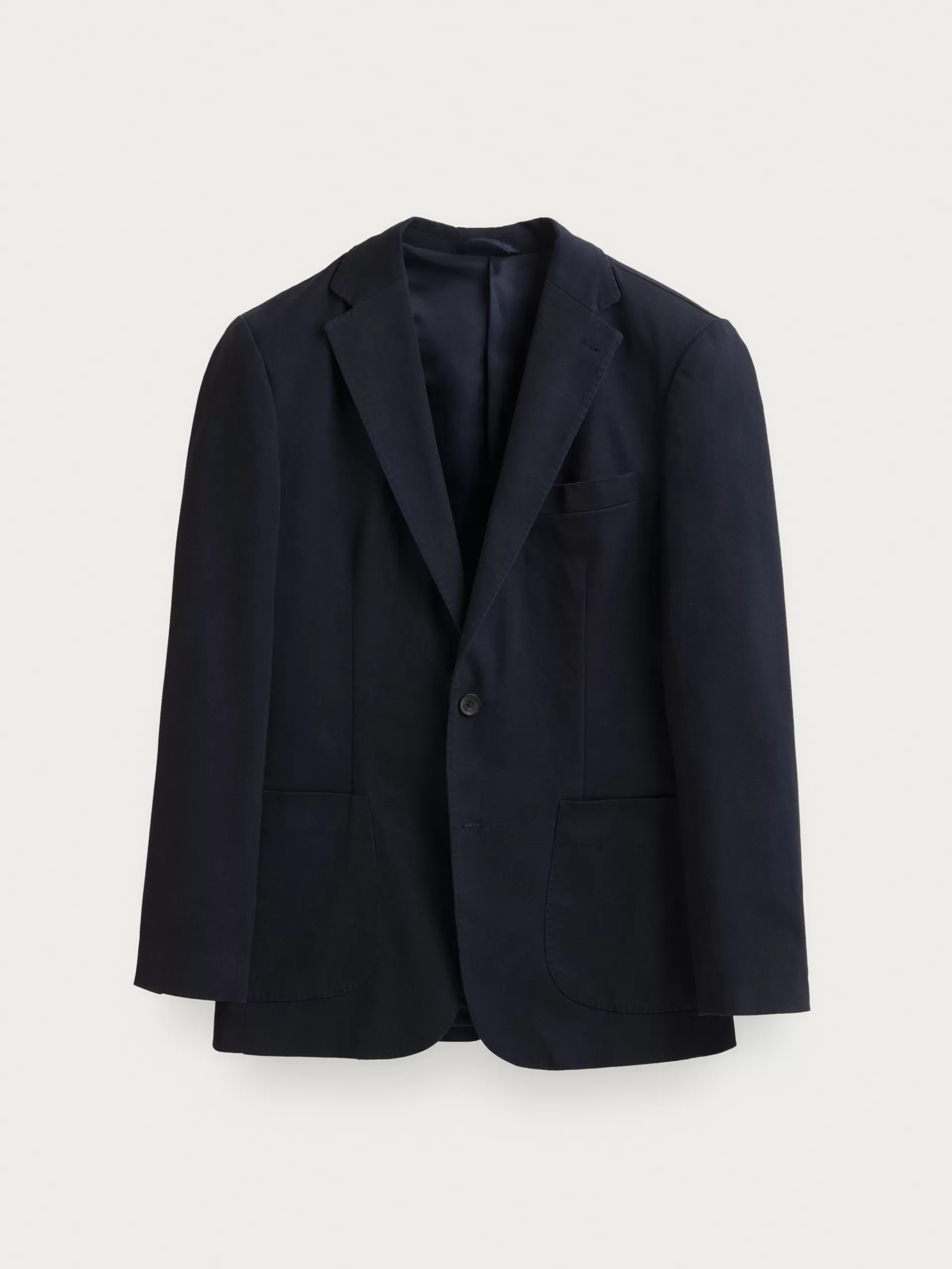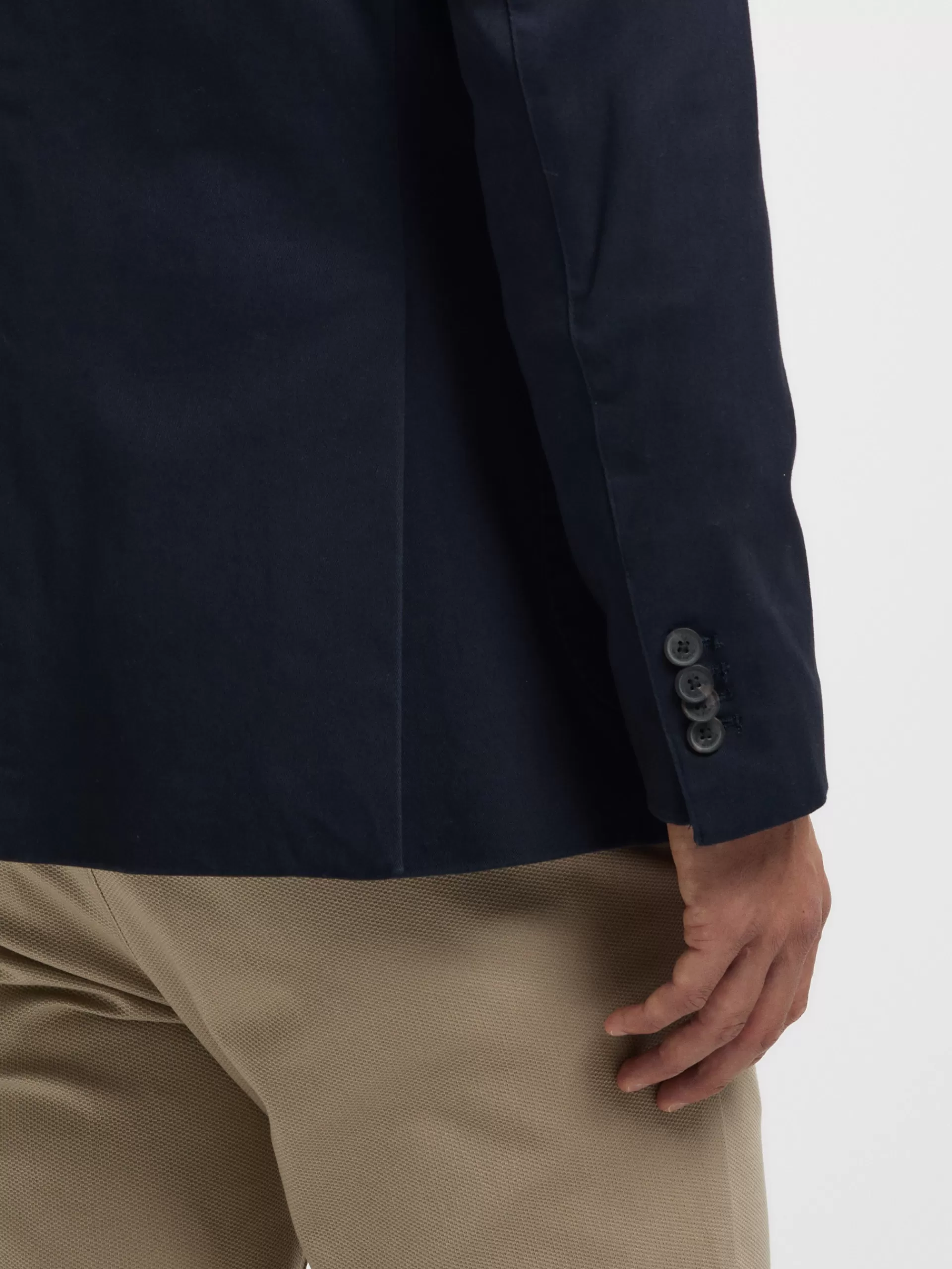 Americana confeccionada en tejido de algodón de corte slim fit. Cuenta con cuello y solapa, cierre central simple mediante dos botones y puños con botones decorativos. Pinzas en el frontal, dos bolsillos de parche en la cintura y un bolsillo a la altura del pecho. Dos bolsillos en su interior.