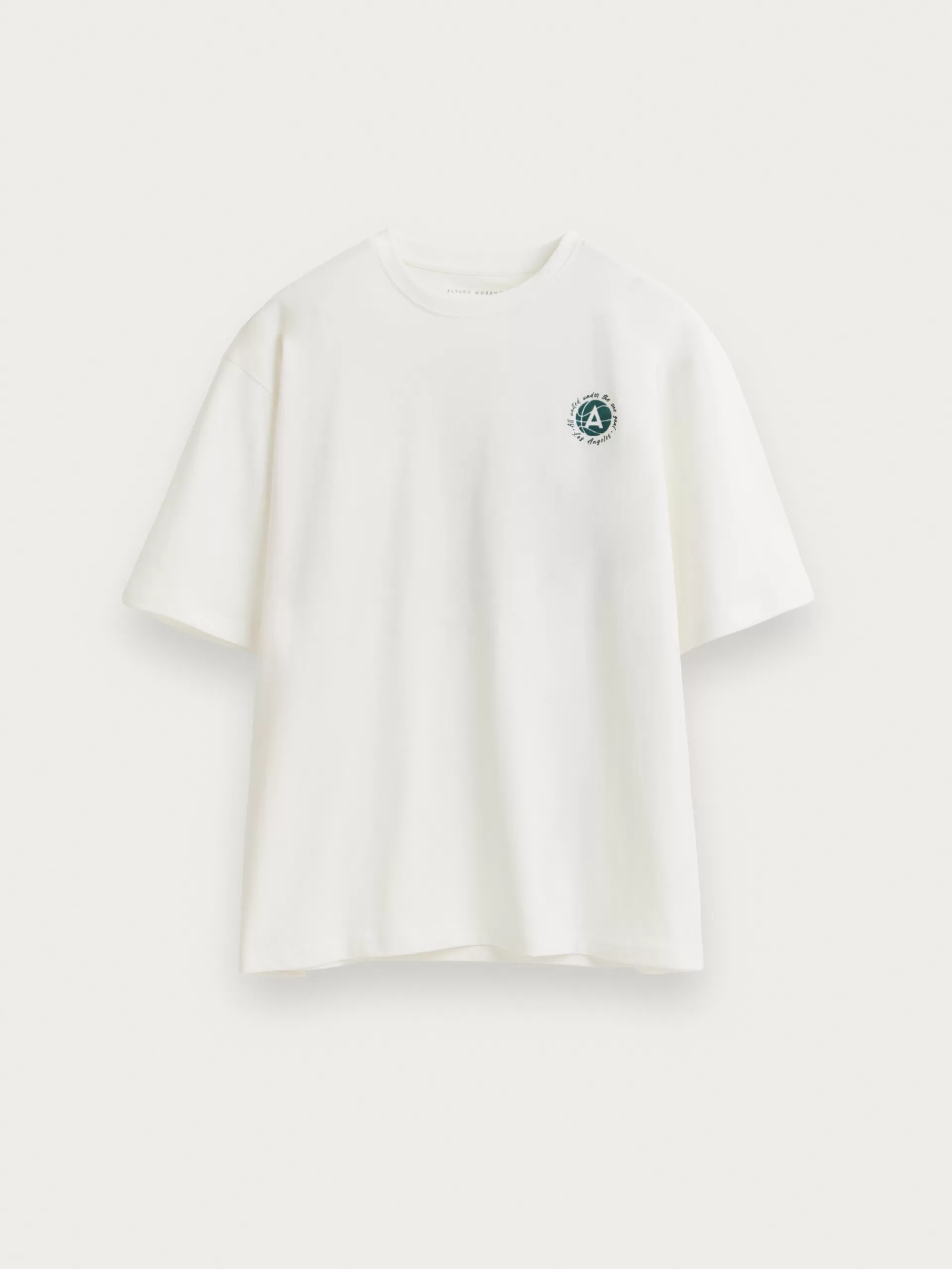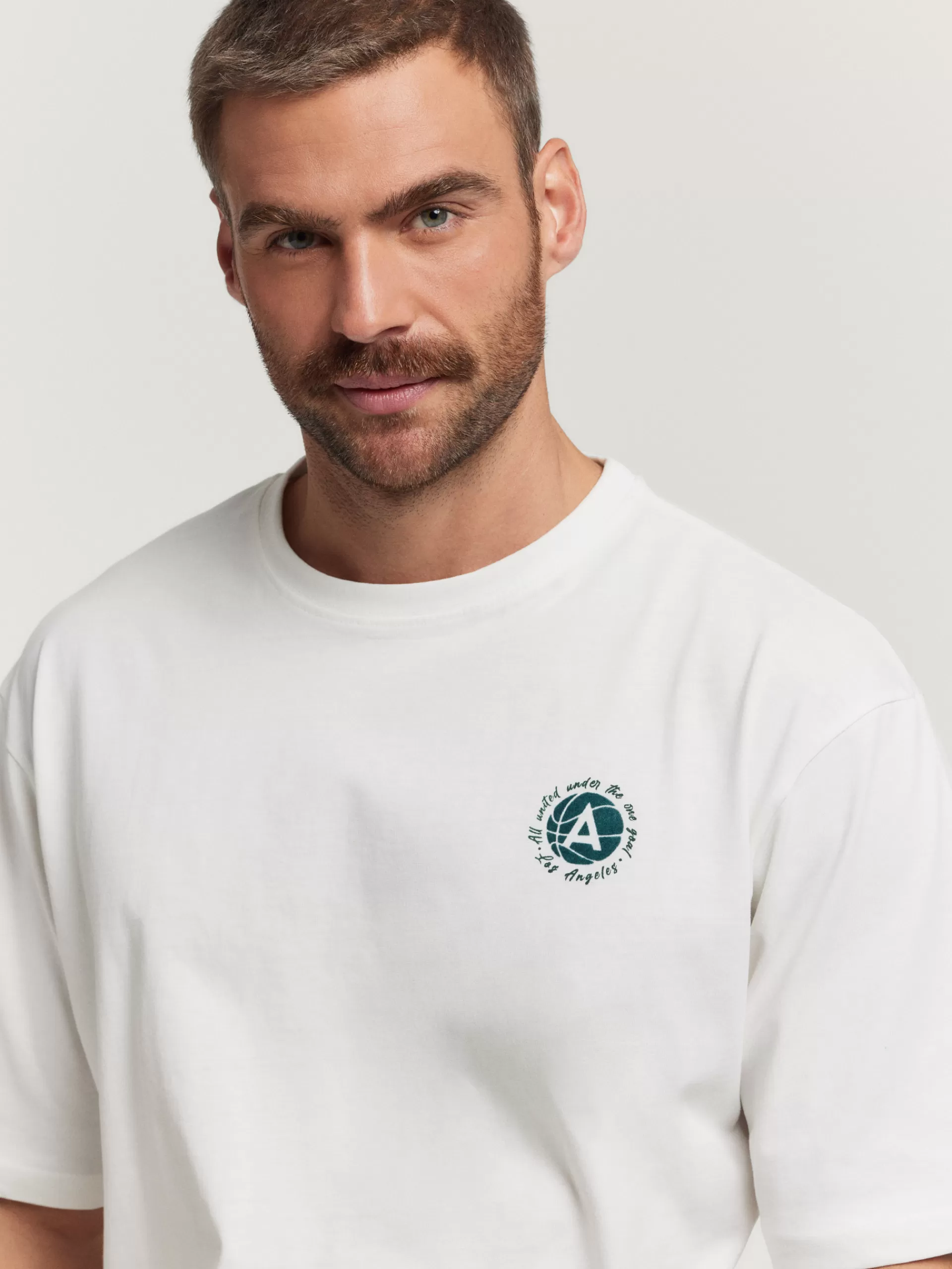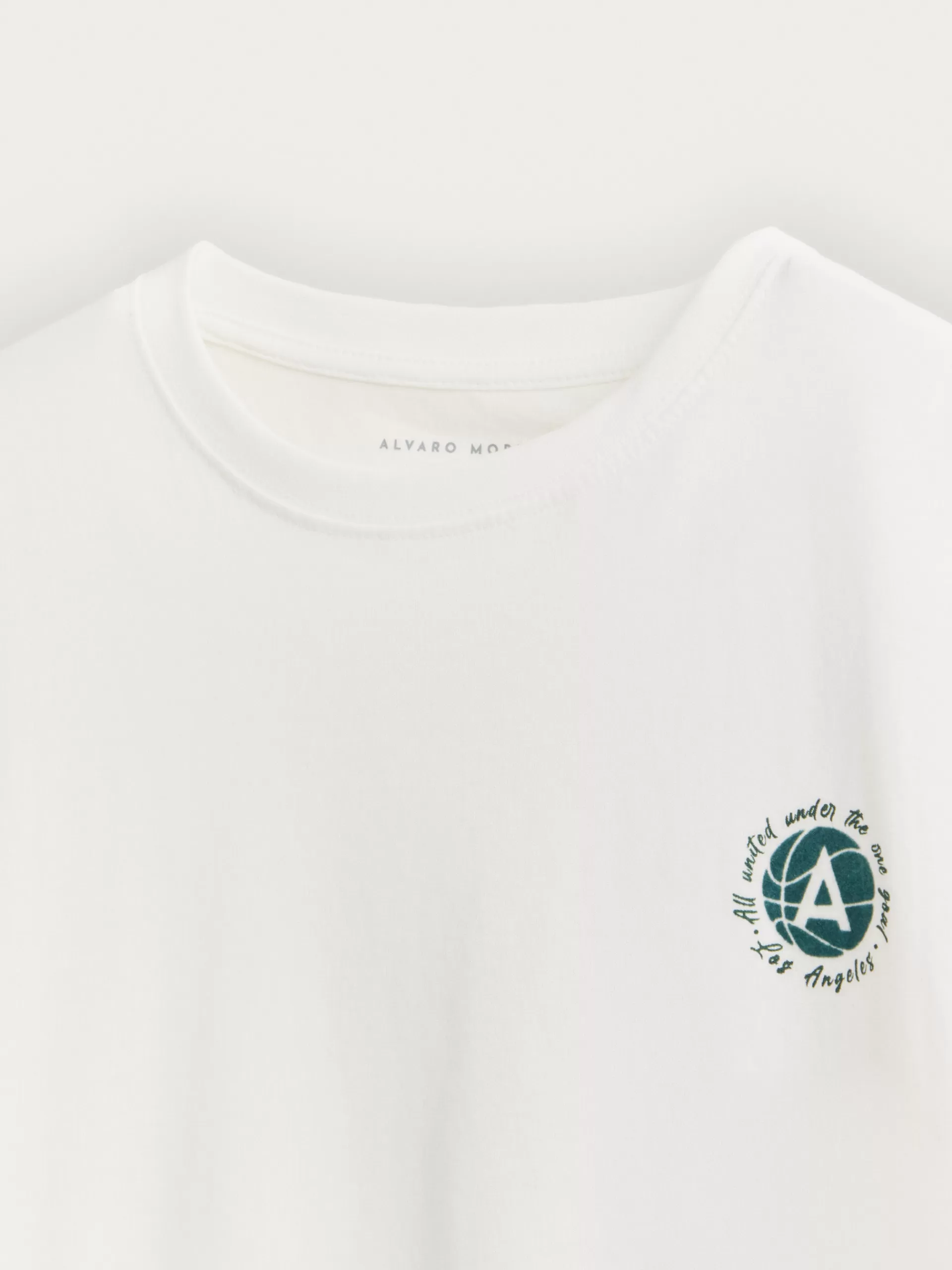 Camiseta de corte relaxed fit aportando un corte más relajado. Cuenta con estampado personalizado en el frontal y en la parte trasera, cuello redondo y manga corta ligeramente más anchas y largas.