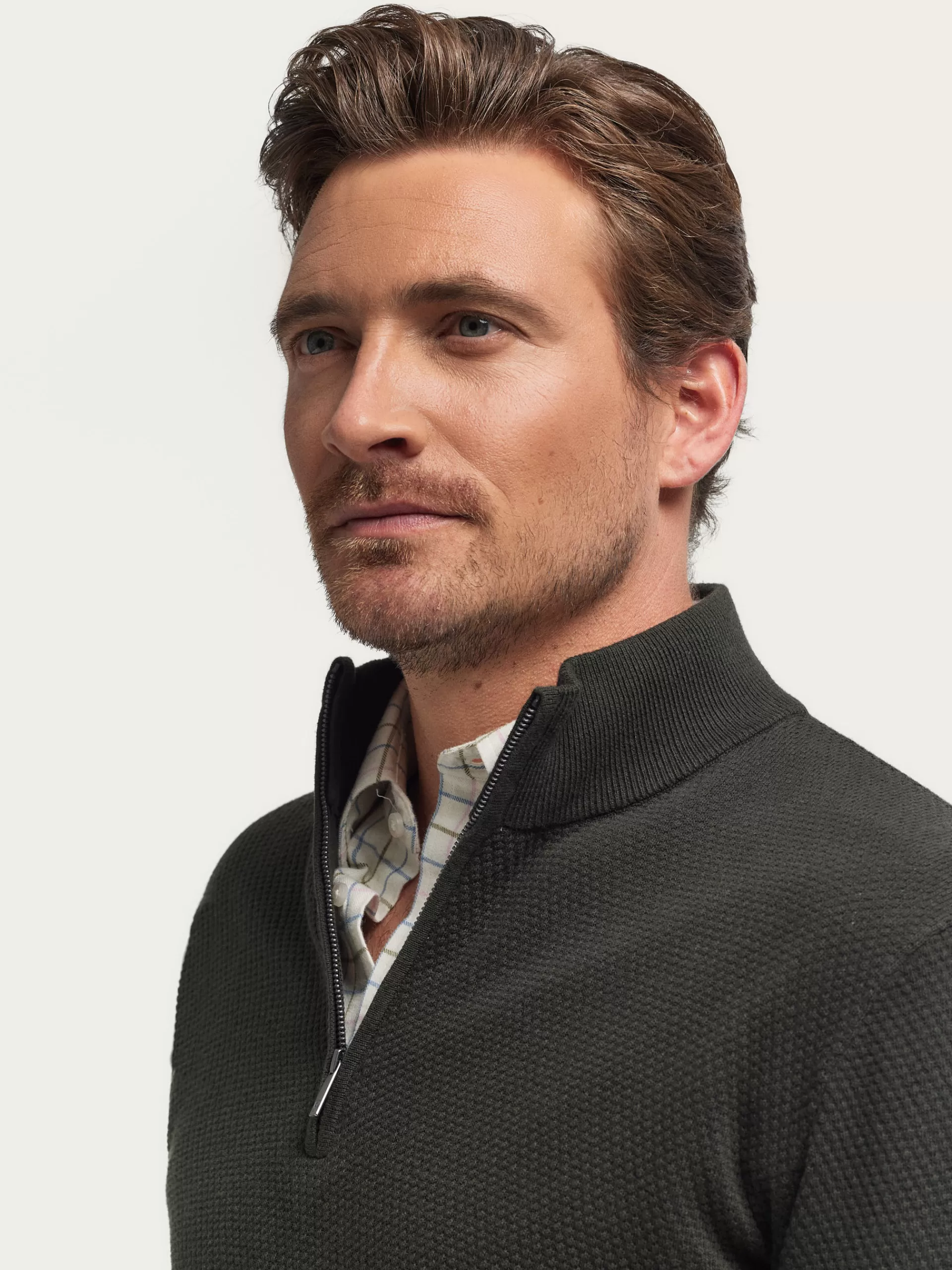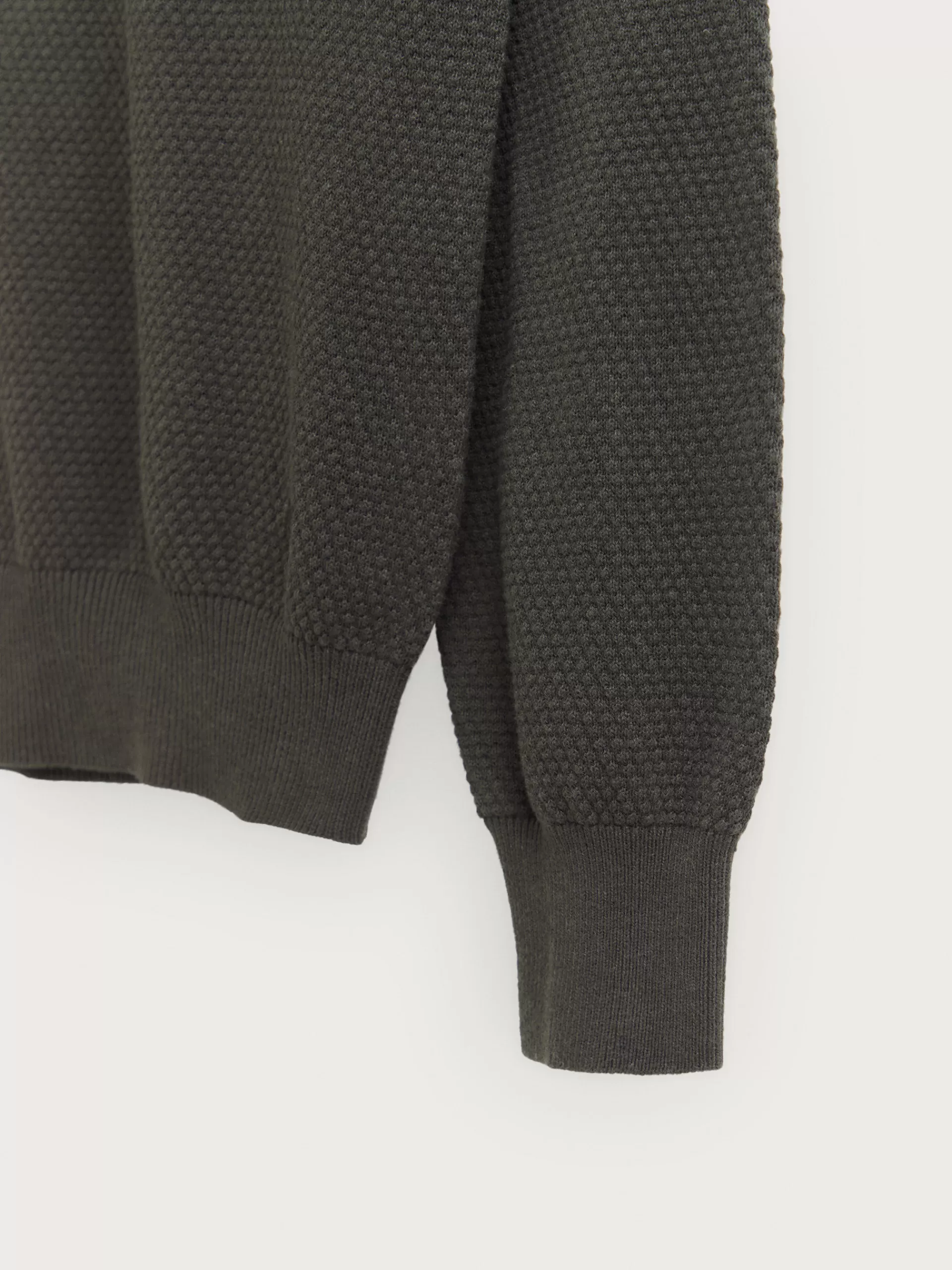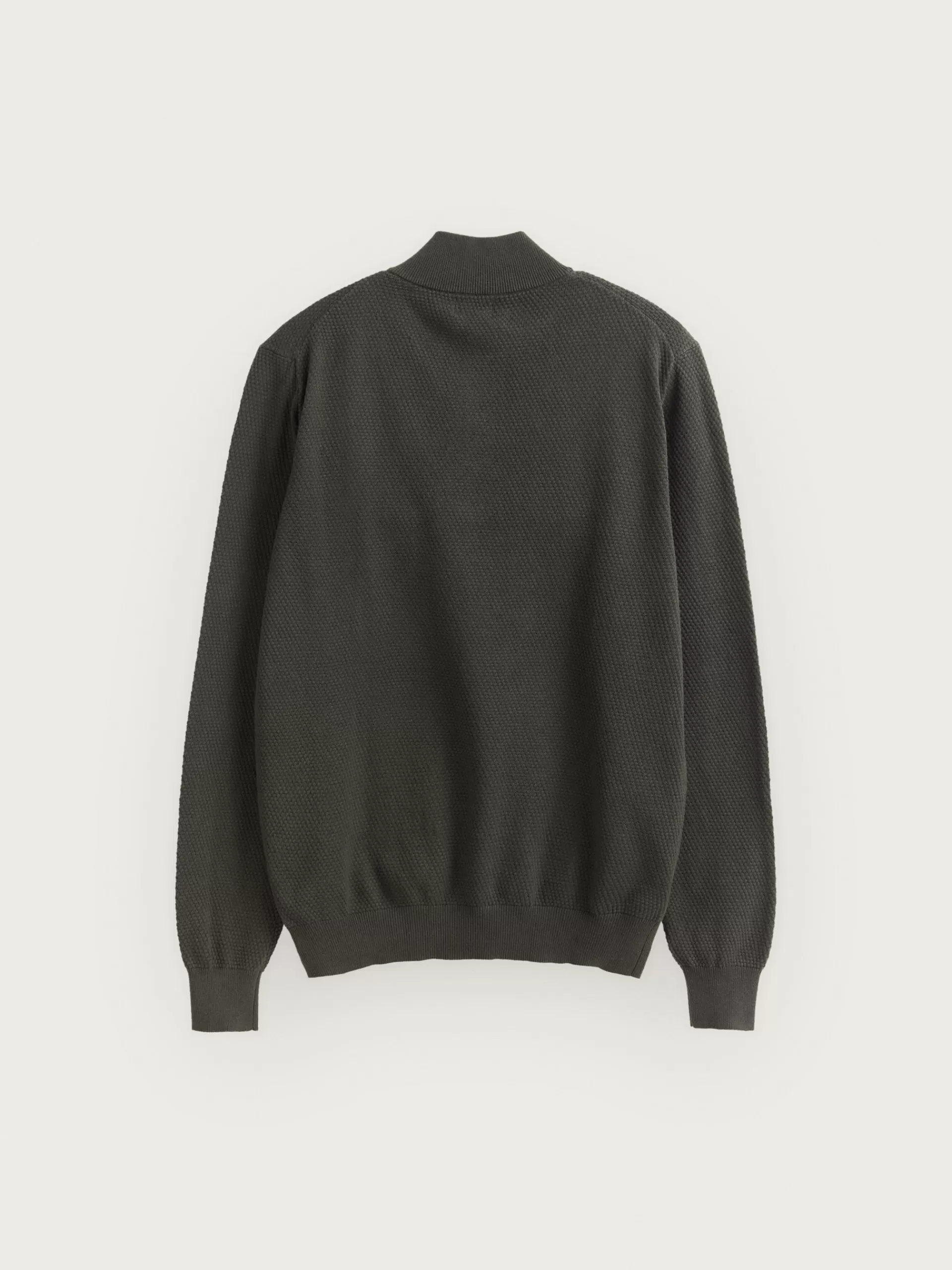 Jersey confeccionado en algodón con estructura en su tejido. Cuenta con cuello alto con medio cierre de cremallera y cuello, puños y bajo en acabado elástico. Corte regular fit.