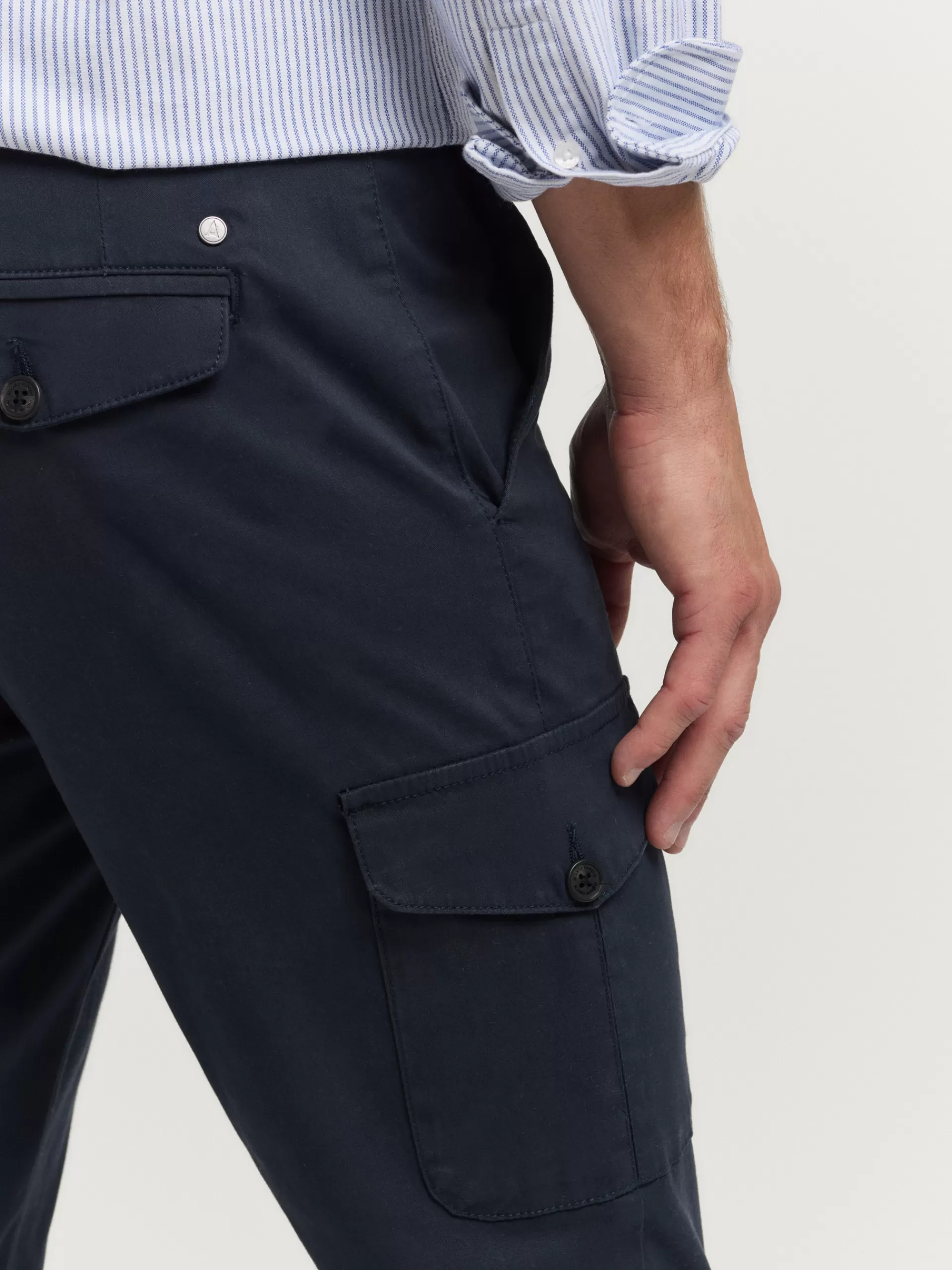 Pantalón cargo con cierre central mediante botón y cremallera. Dos bolsillos laterales y dos más bajos con cierre med…
