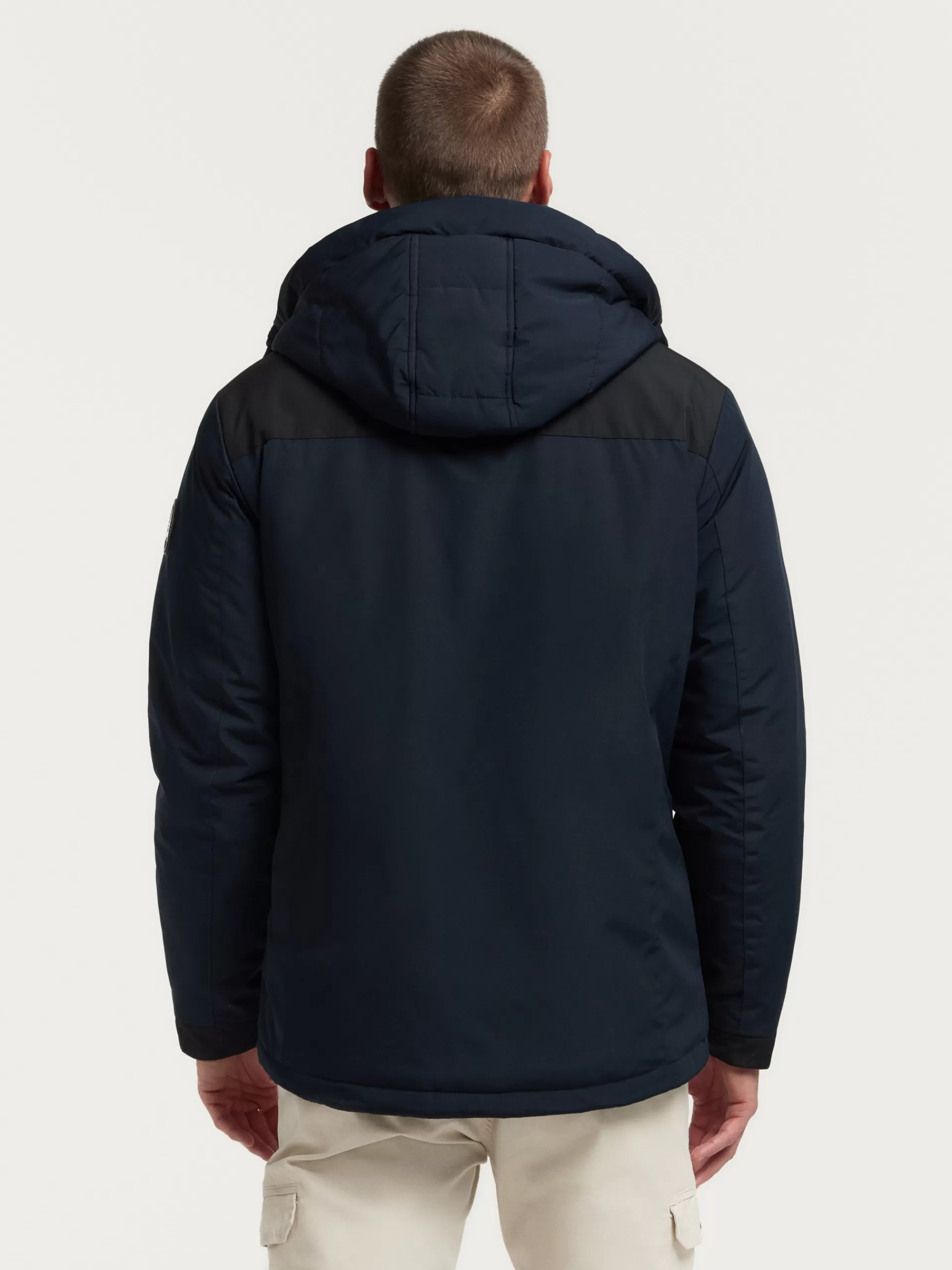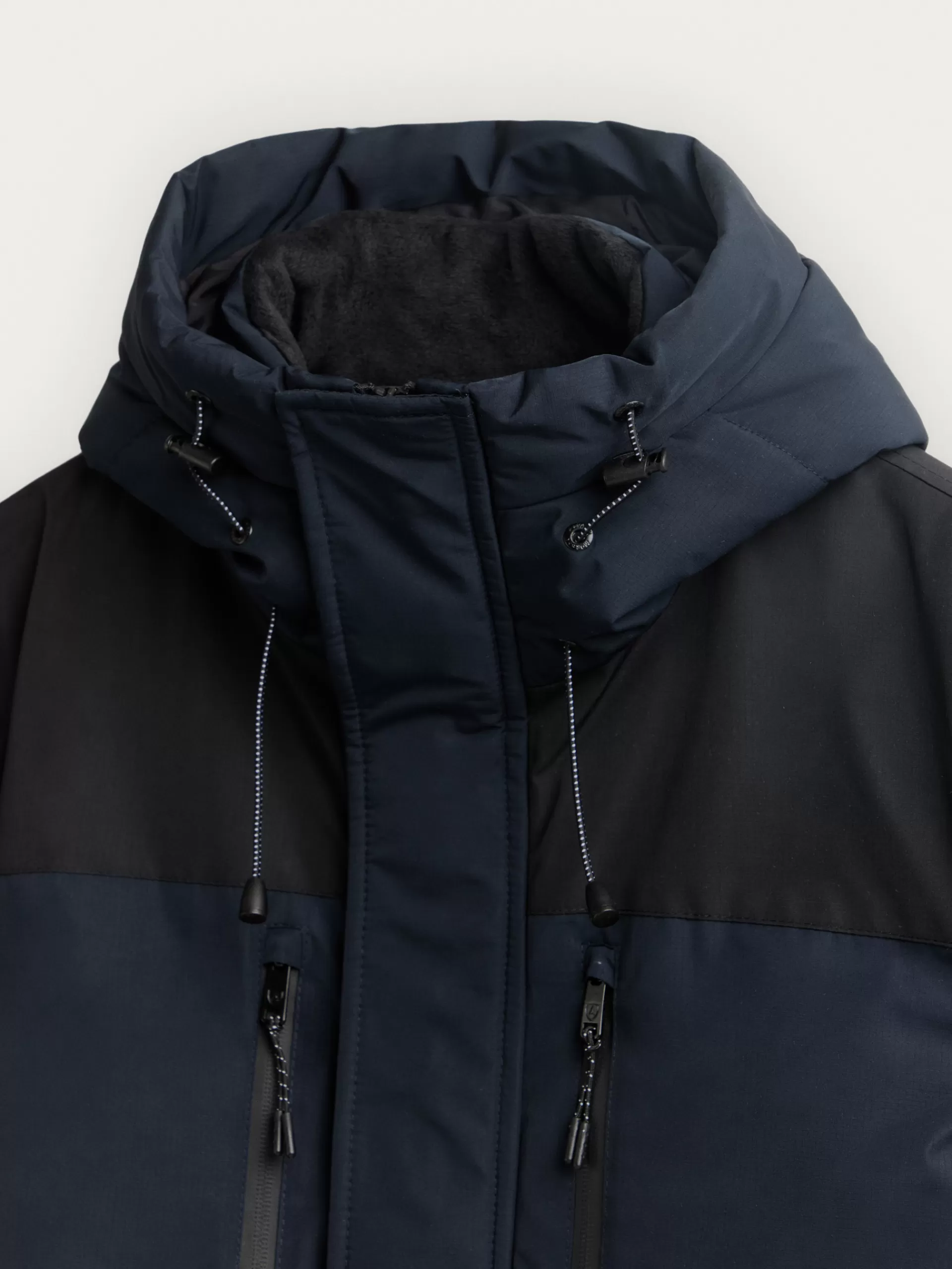 Parka acolchada bicolor con capucha amplia y ajustable. Cierre central mediante doble cremallera oculta por tapeta de bo…