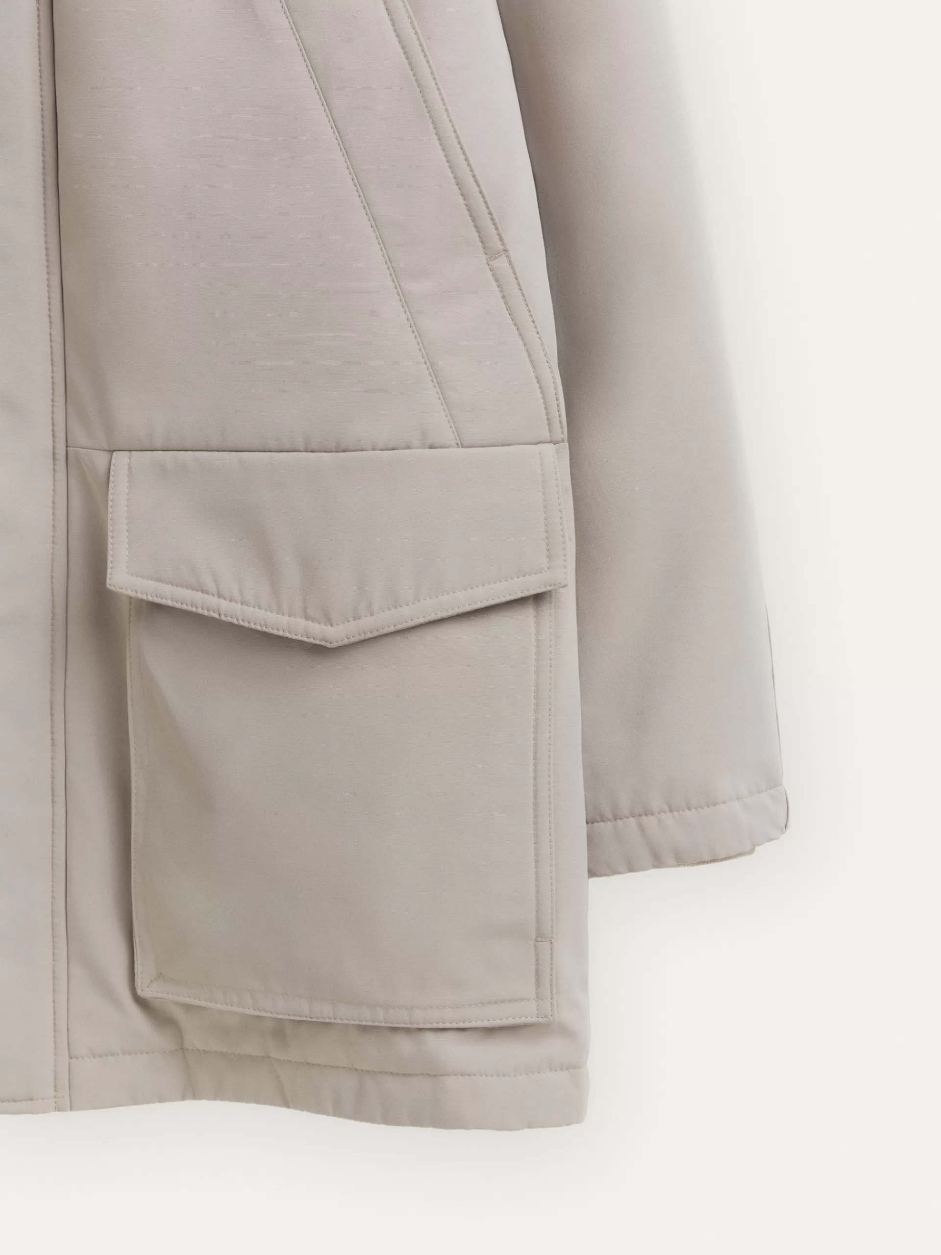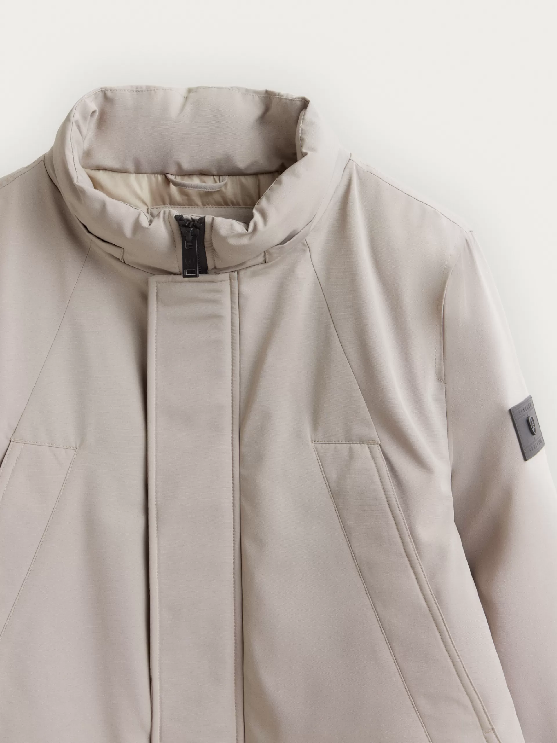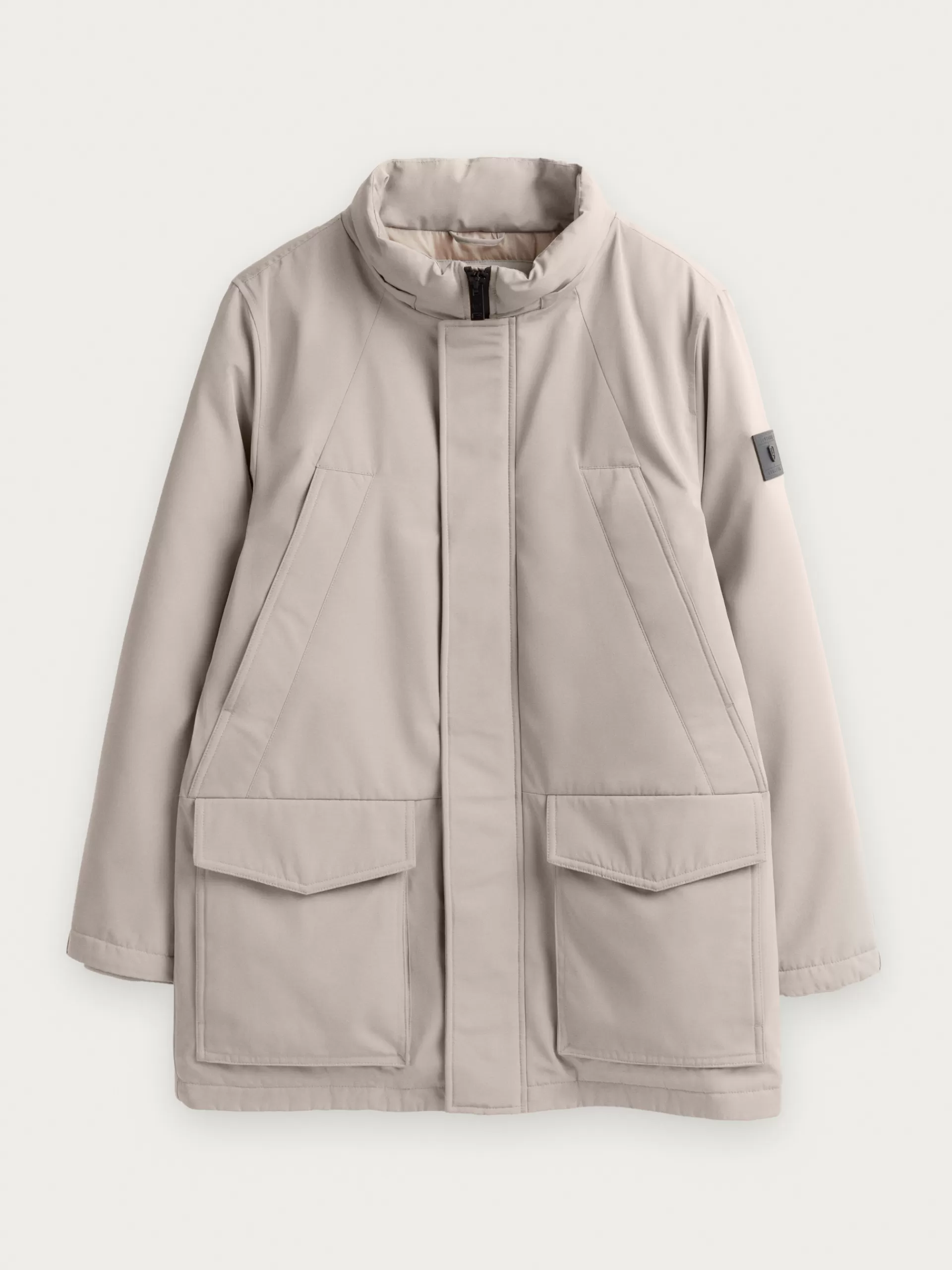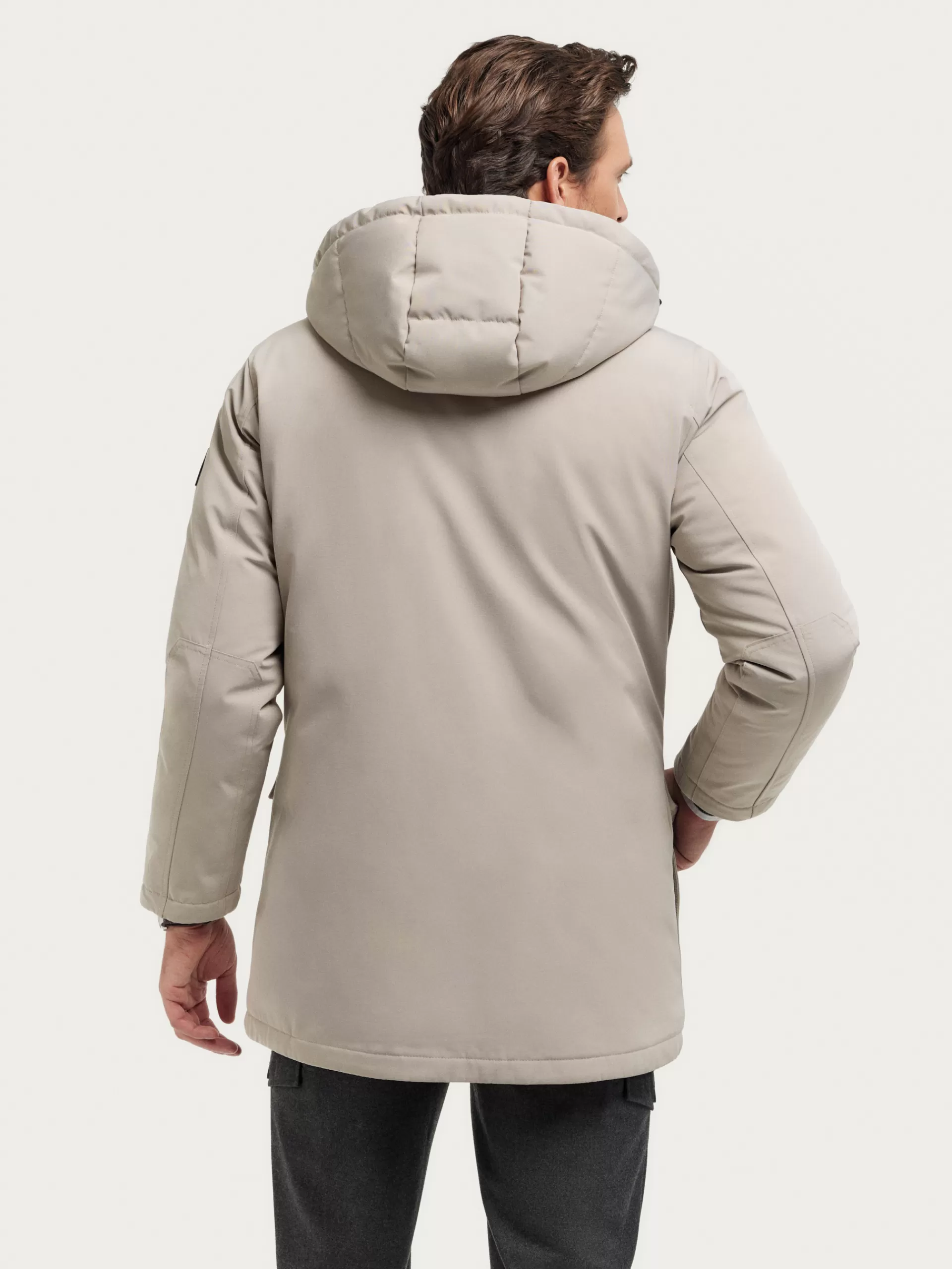 Parka acolchada con cuello subido y gorro. Cuenta con cierre central mediante doble cremallera oculta por tapeta de botones a presión, dos bolsillos a la altura del pecho, dos bolsillos en la cintura y parche personalizado en una de sus mangas.