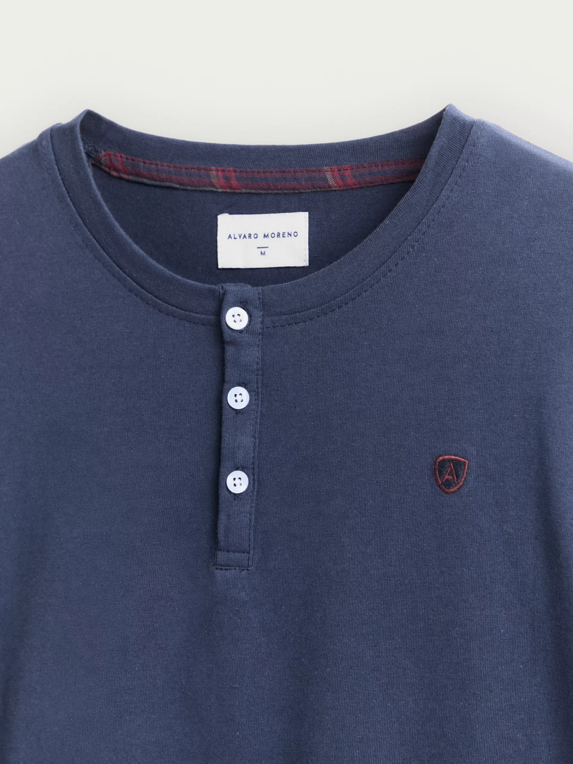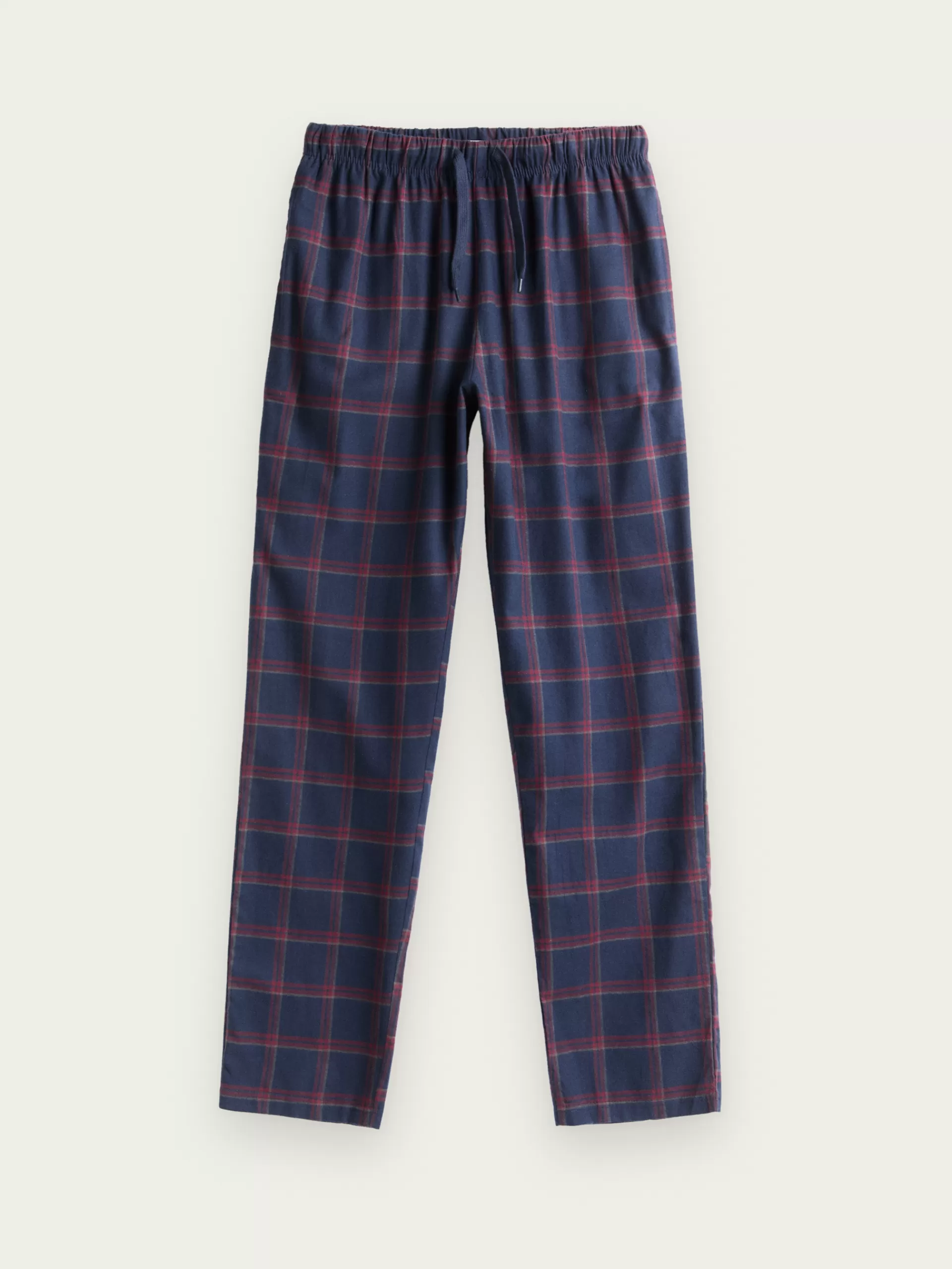 Pijama compuesto por dos piezas, superior e inferior. Parte superior camiseta de manga larga con cierre mediante tres botones en el cuello. Pantalón a cuadros con cinturilla elástica y cordón ajustable.
