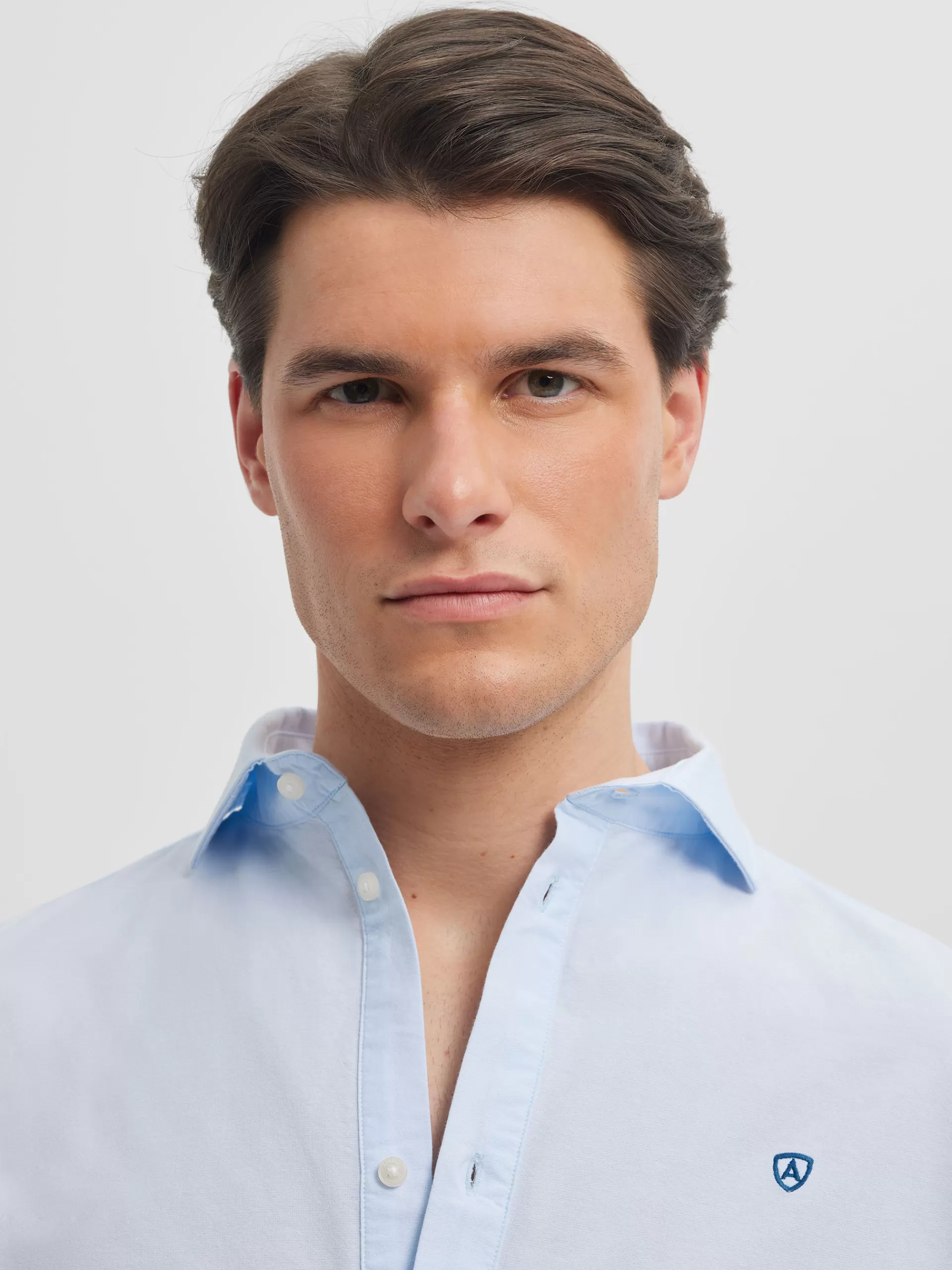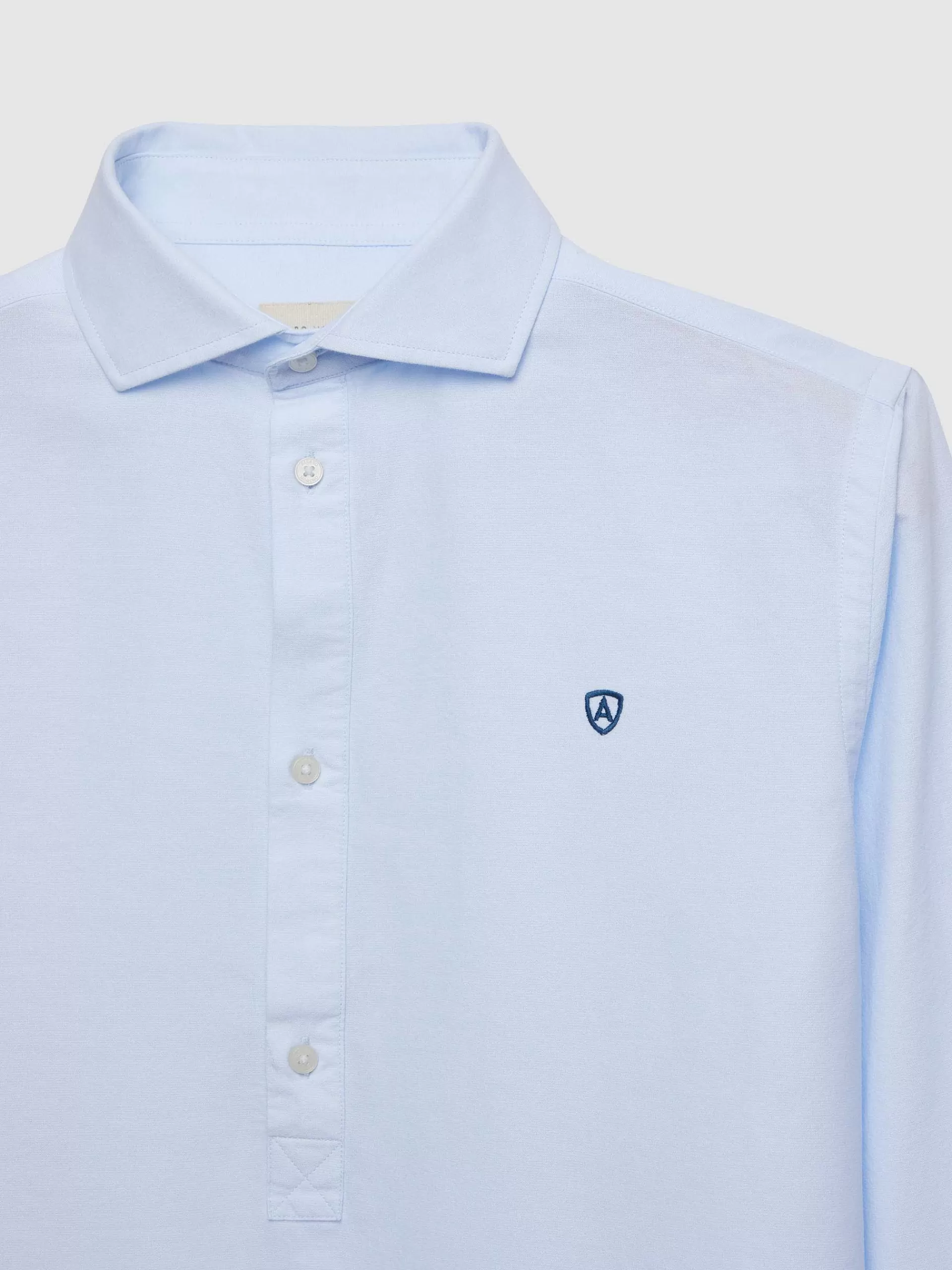 Camisa estilo polera confeccionada en algodón. Cuenta con cuello de solapa, cierre central hasta la mitad de la camisa de cuatro botones, manga larga con puños simples y logo de la marca grabado en el frontal a contraste. Corte regular fit.